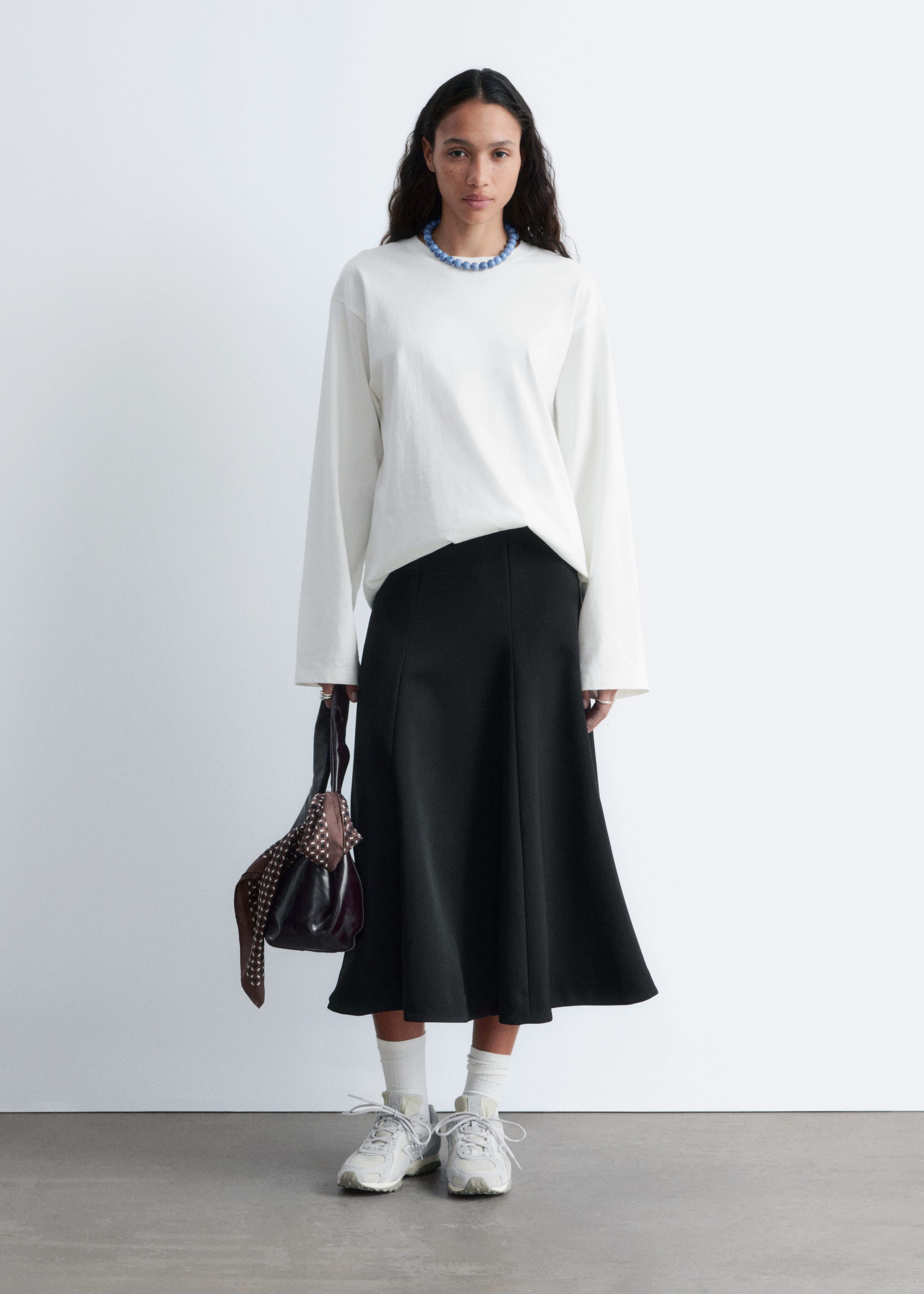 Pantalones confeccionados en mezcla de lana con cintura estándar y piernas largas y anchas con pliegues. Cuentan con bolsillos laterales inclinados, bragueta con cremallera, gancho y barra y cierre de botón, y bolsillos insertados traseros.