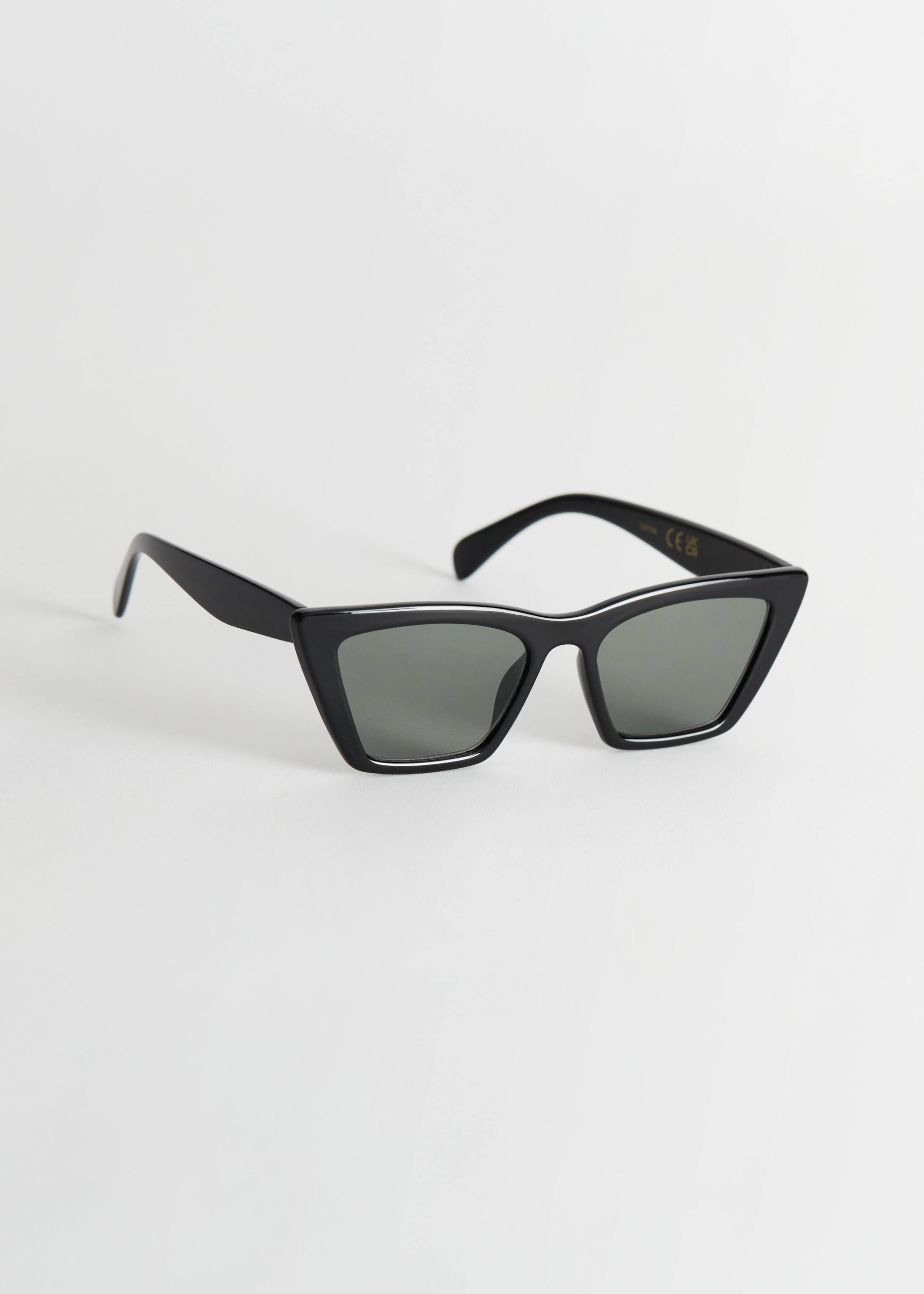 Lunettes de soleil œil de chat angulaires agrémentées de branches à bords pointus.