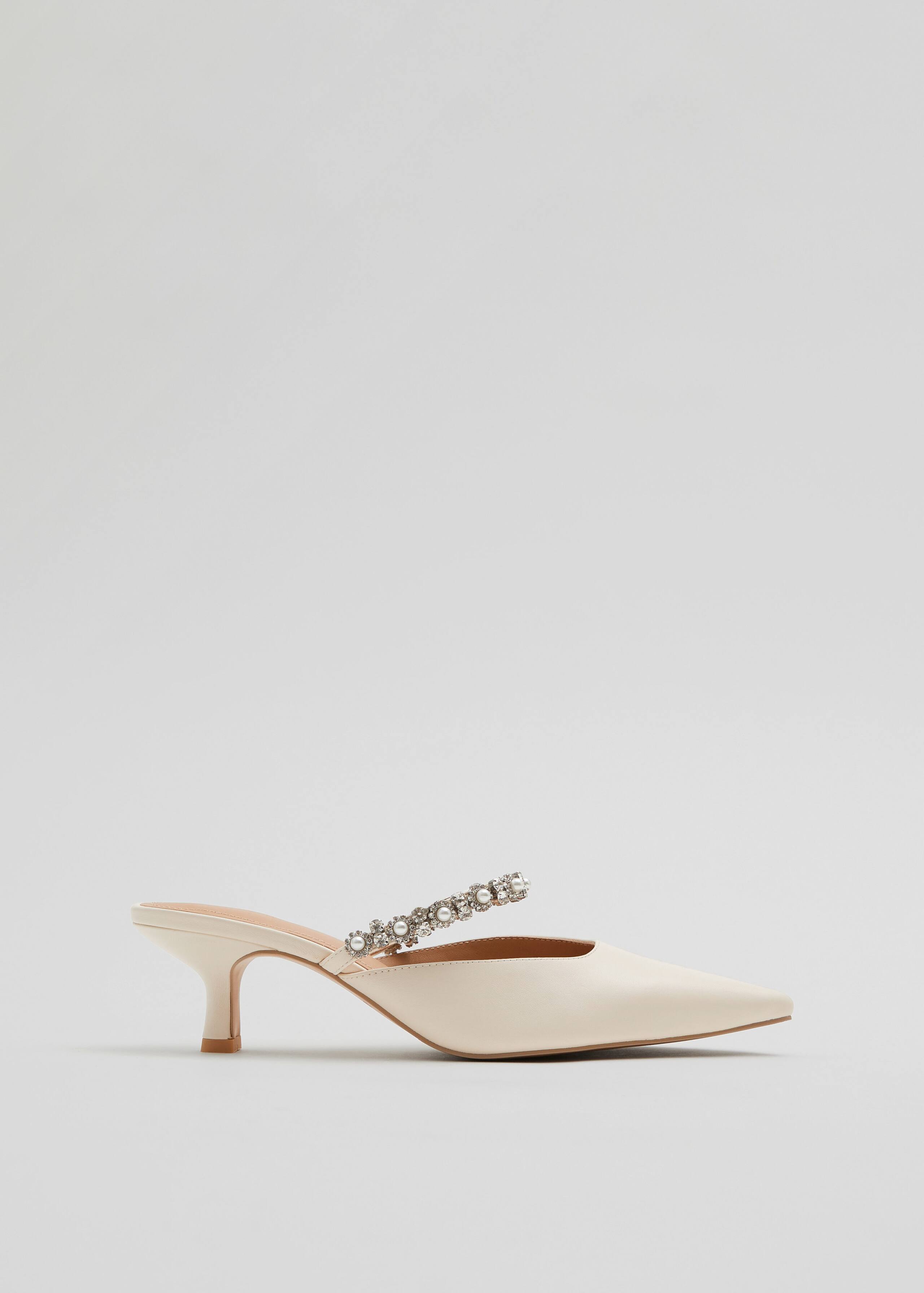Mules à bouts pointus en cuir, dotées de lanières ornées de strass et de petits talons.