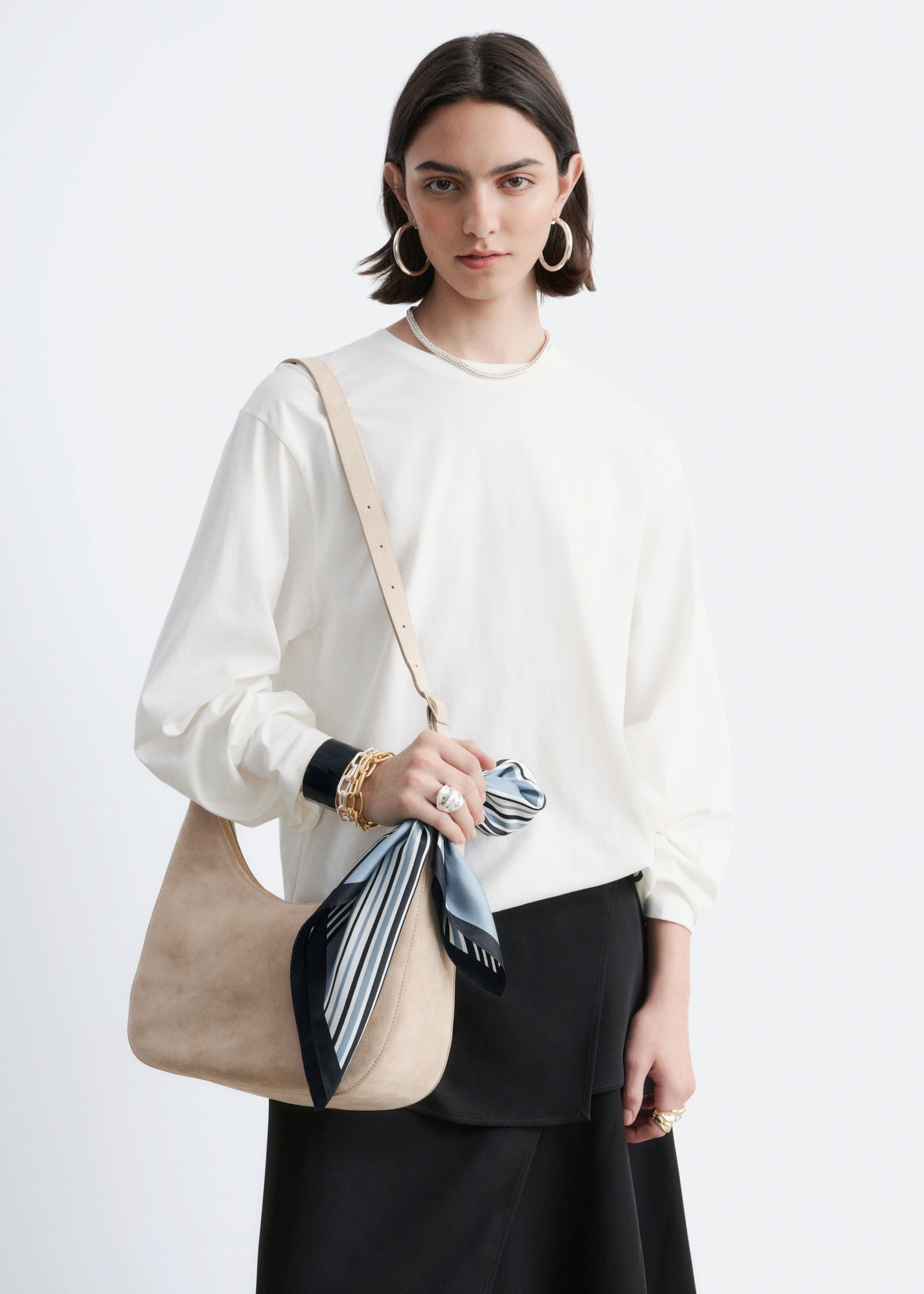 Con cuciture arricciate per un effetto drappeggiato all over, questa maglia con orlo asimmetrico è realizzata in modal fluido che esalta ulteriormente il drappeggio. Il modello dolcevita è caratterizzato da maniche extra lunghe e bordi con cuciture overlock su polsini e orlo.