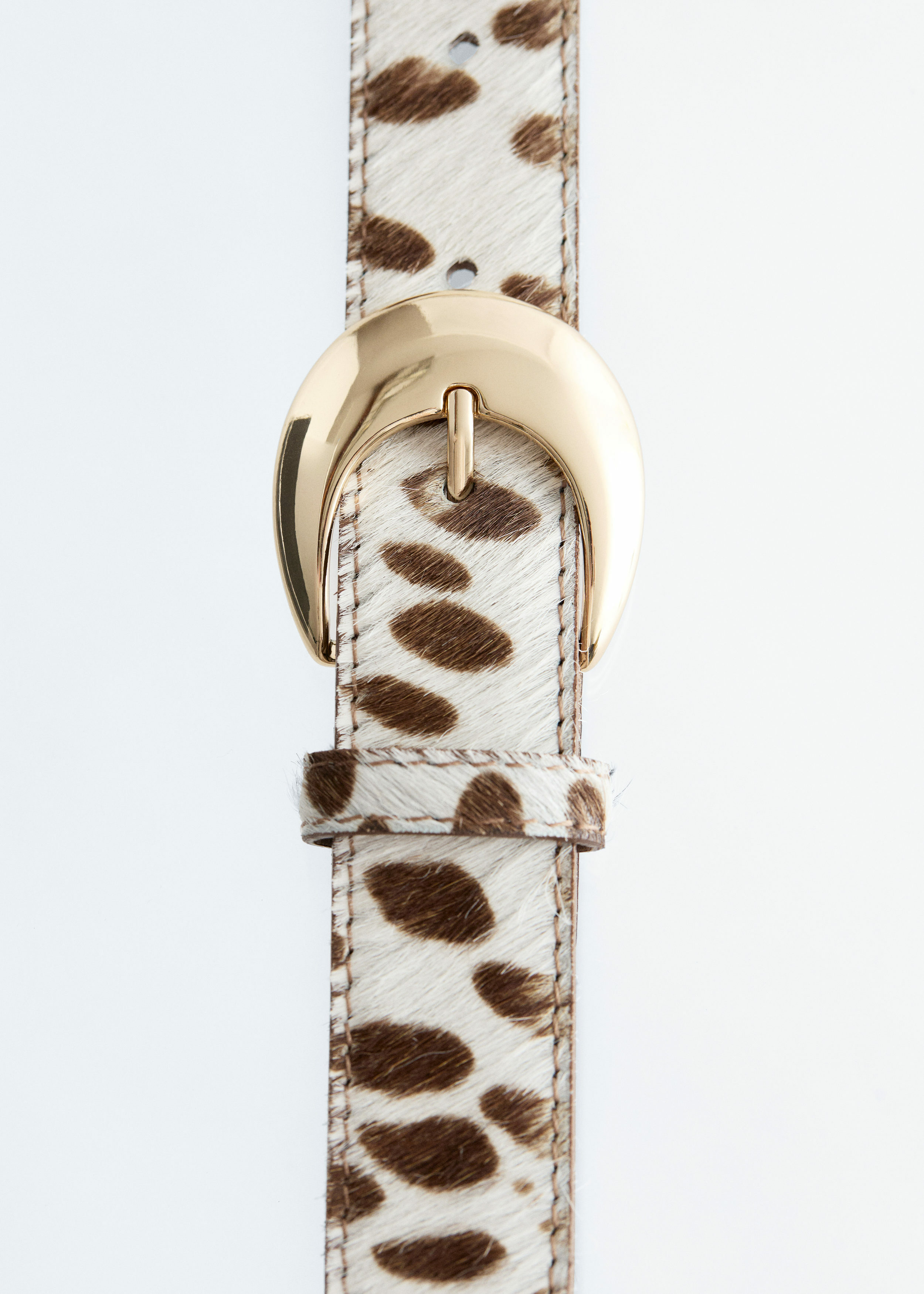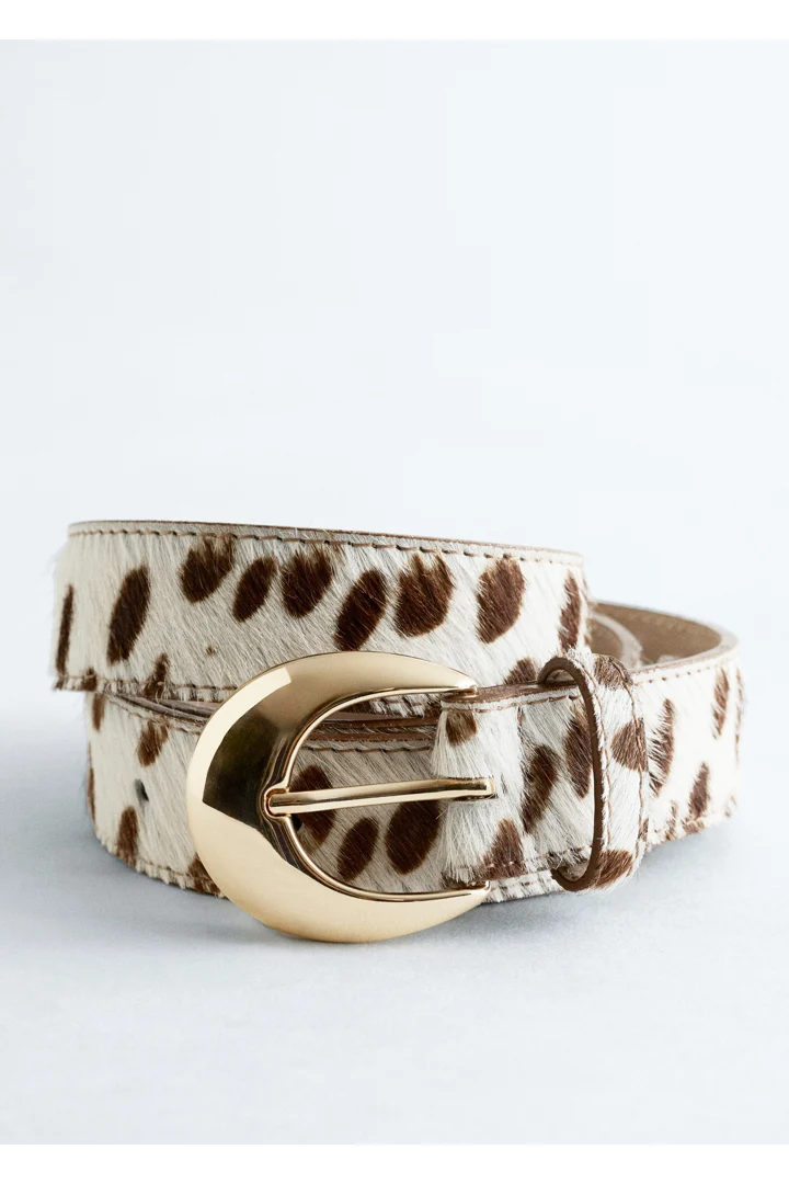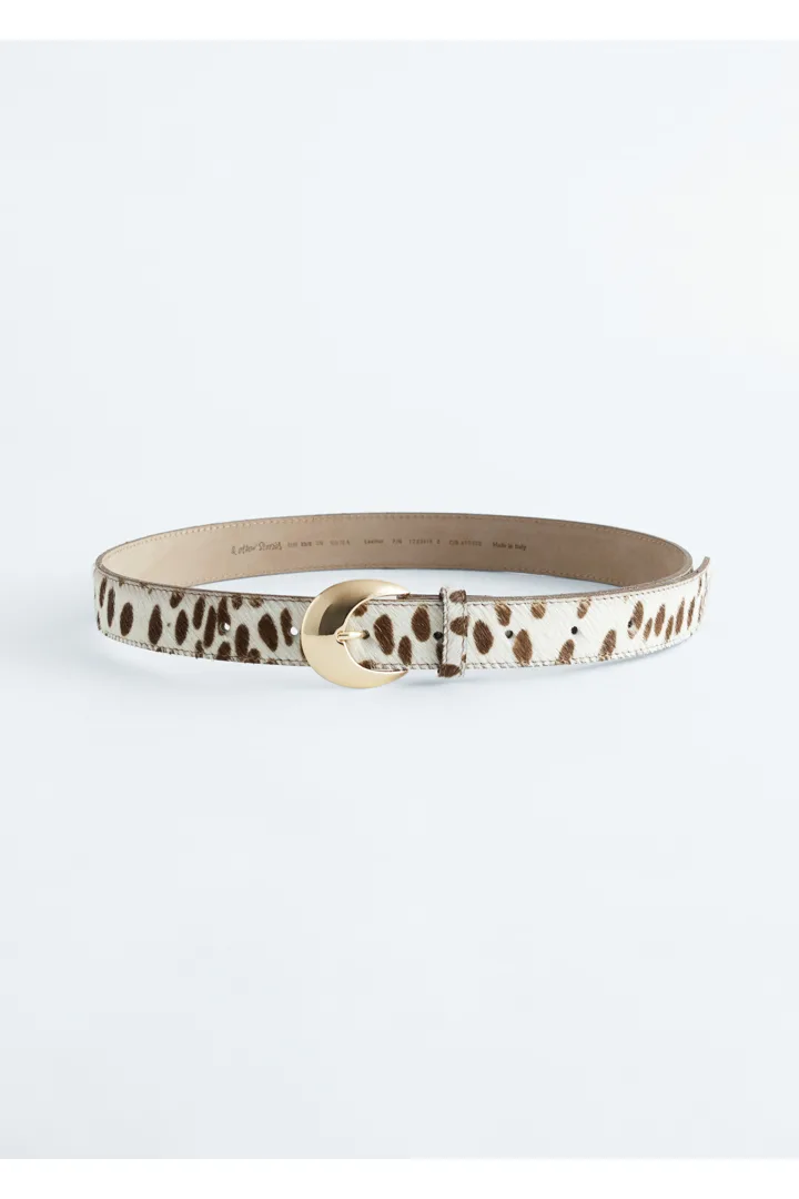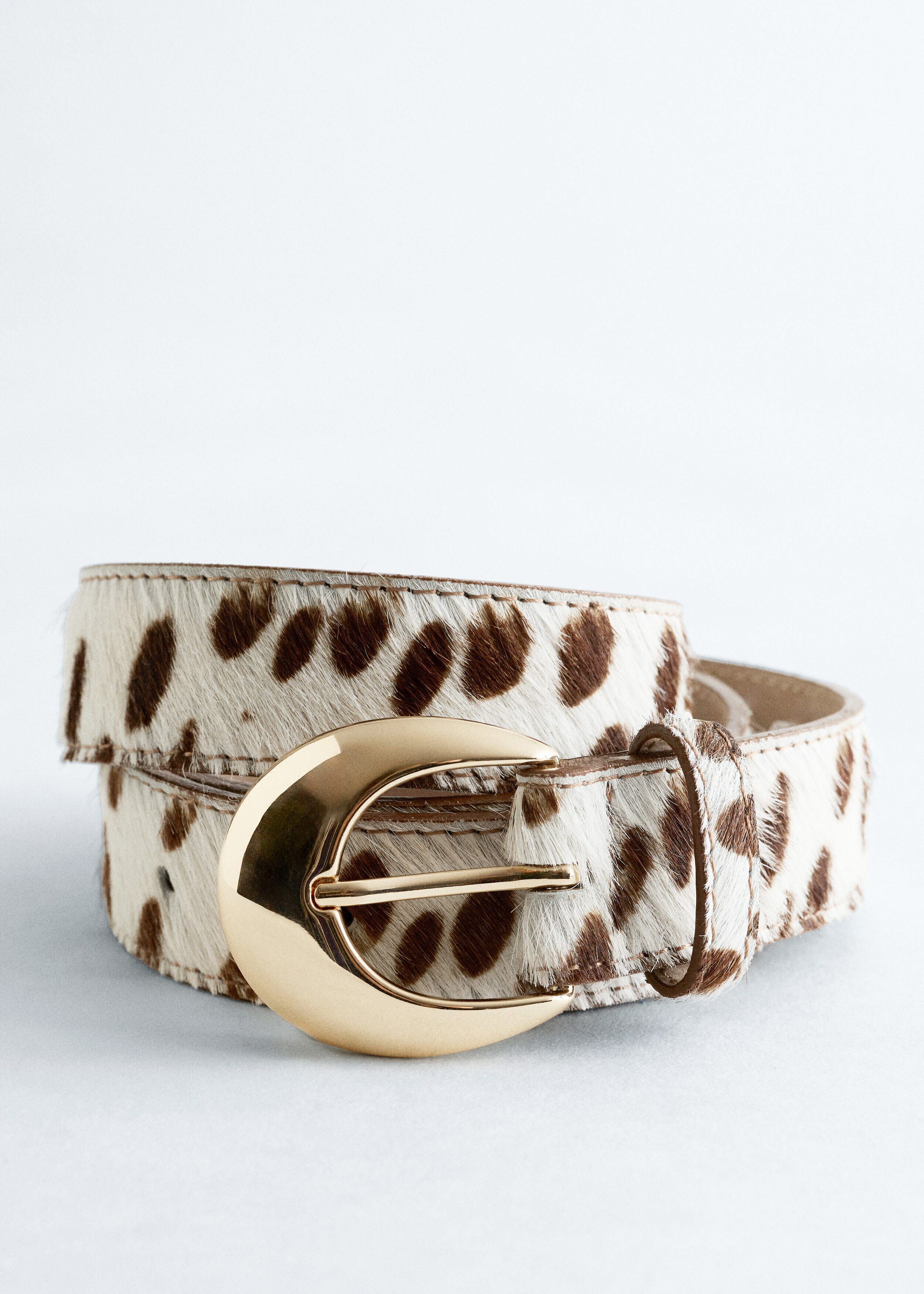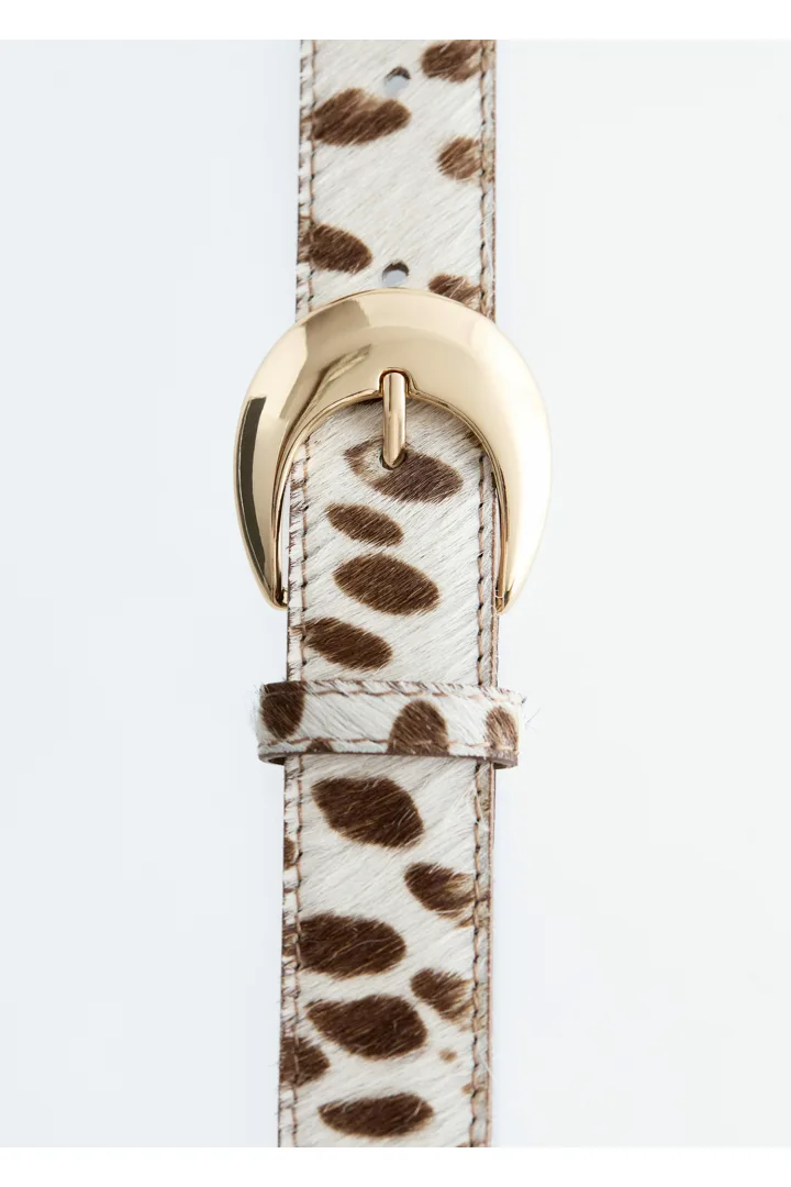 다시 트렌디하게 떠오르는 카우 프린트를 시크하고 은은하게 표현한 벨트예요. 이탈리아에서 풍성한 텍스처의 헤어리 가죽 소재로 제작되었으며, 핏 조절을 위한 골드 톤의 버클이 자리해 있어요.