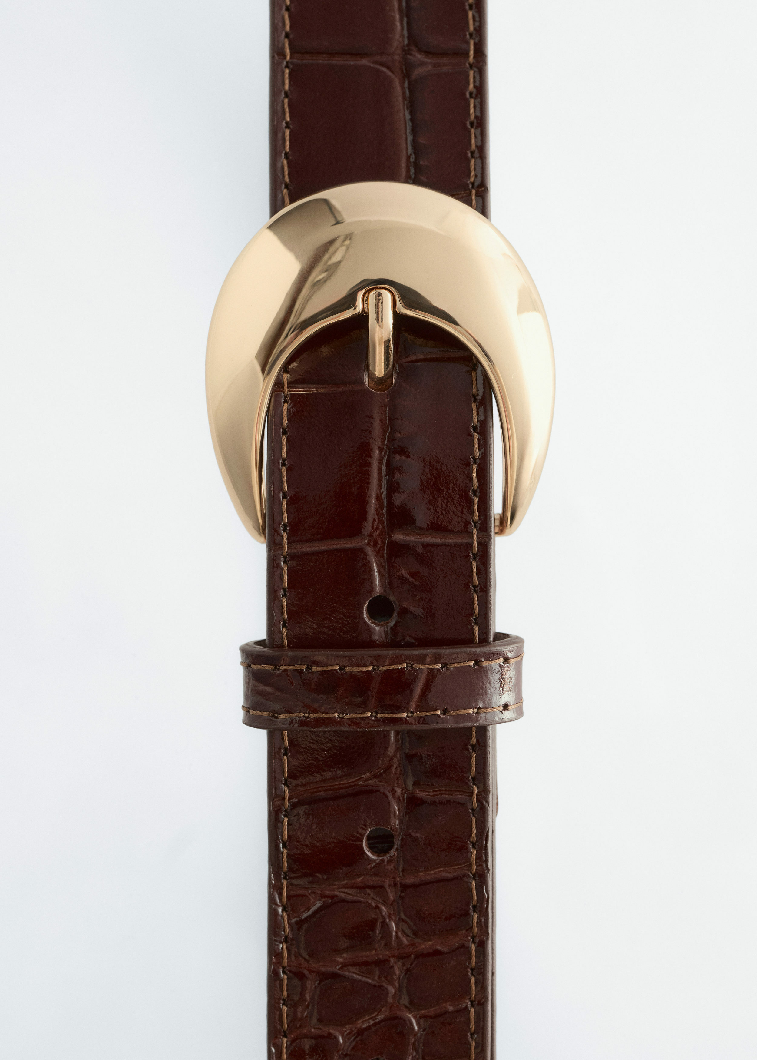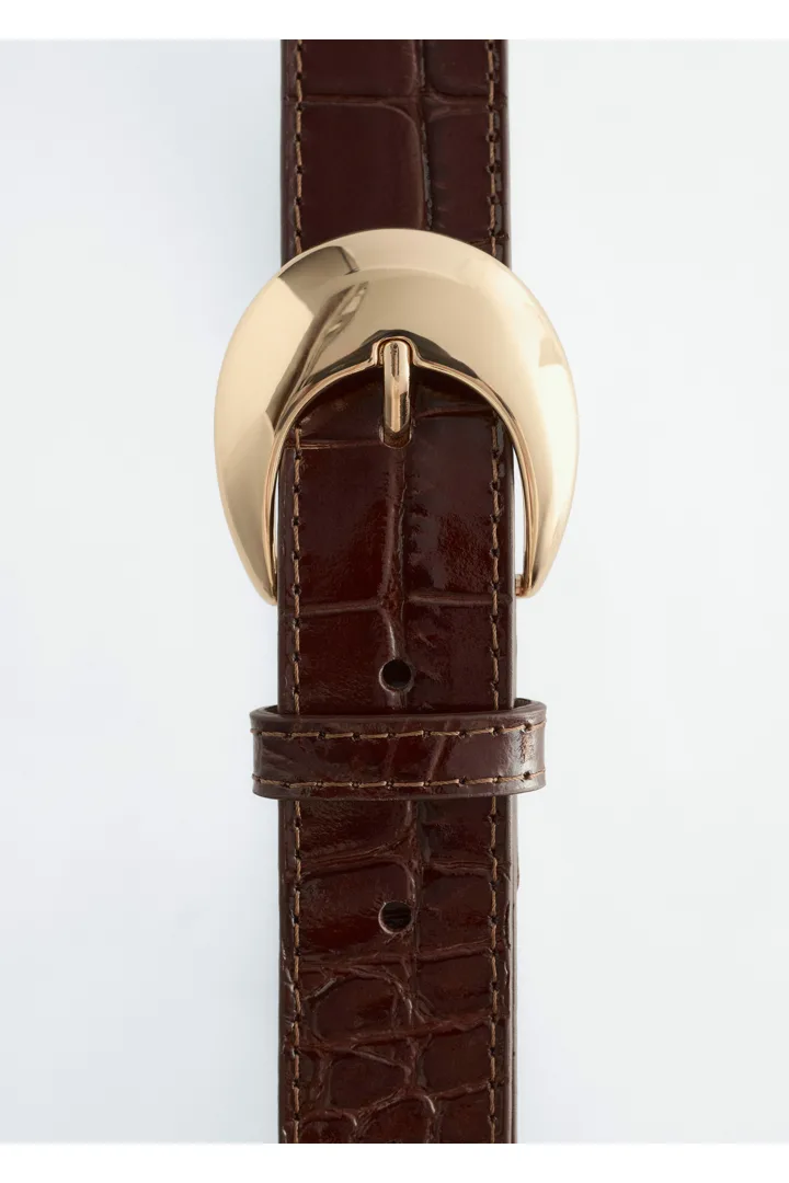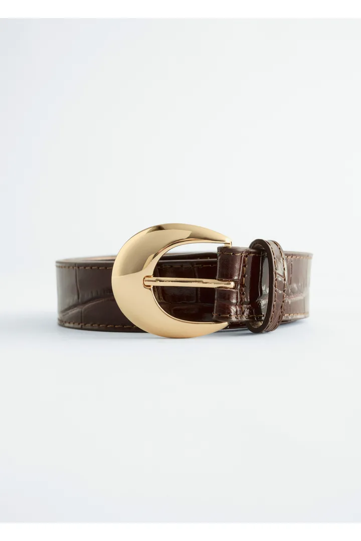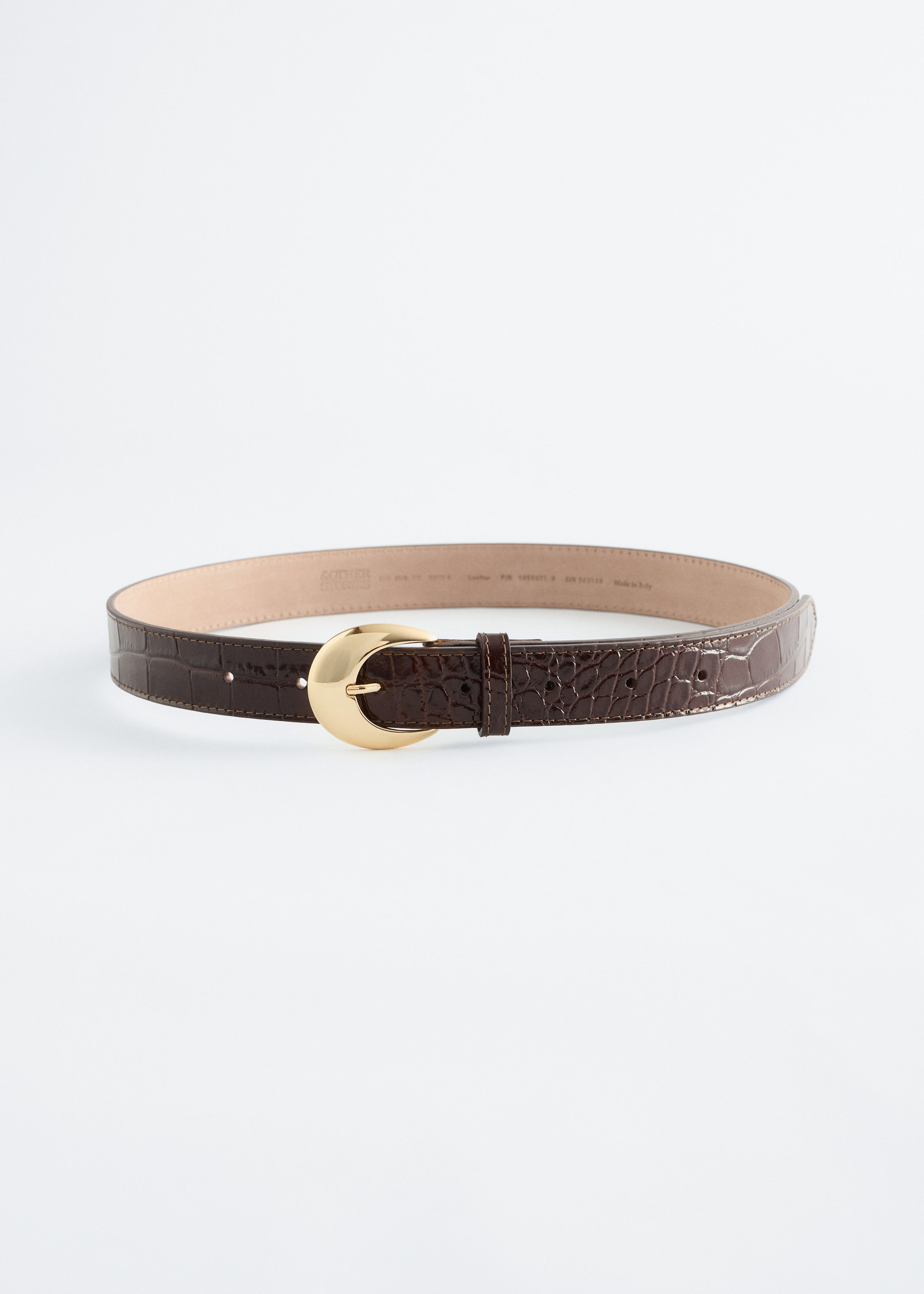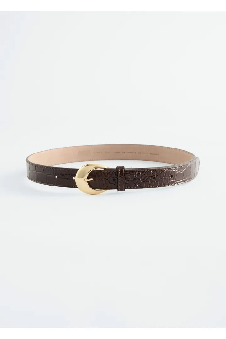 독특한 쉐입의 골드 톤 버클이 절제된 무드를 연출하는 벨트예요. 이탈리아에서 유연한 가죽으로 제작되었으며, 테일러드 옷의 고리에 끼워 연출하거나 블레이저를 조여 스타일링해도 멋스럽답니다.