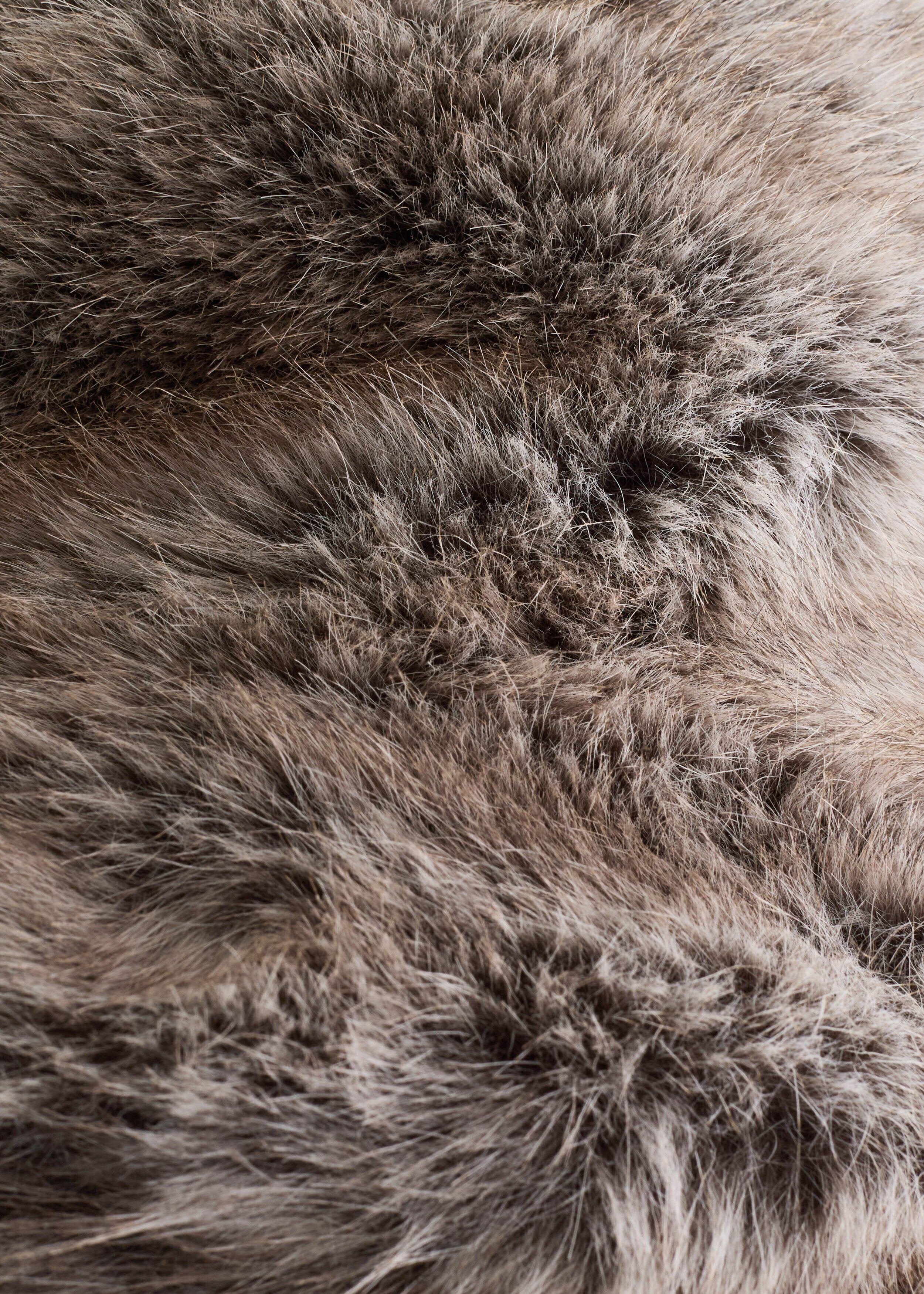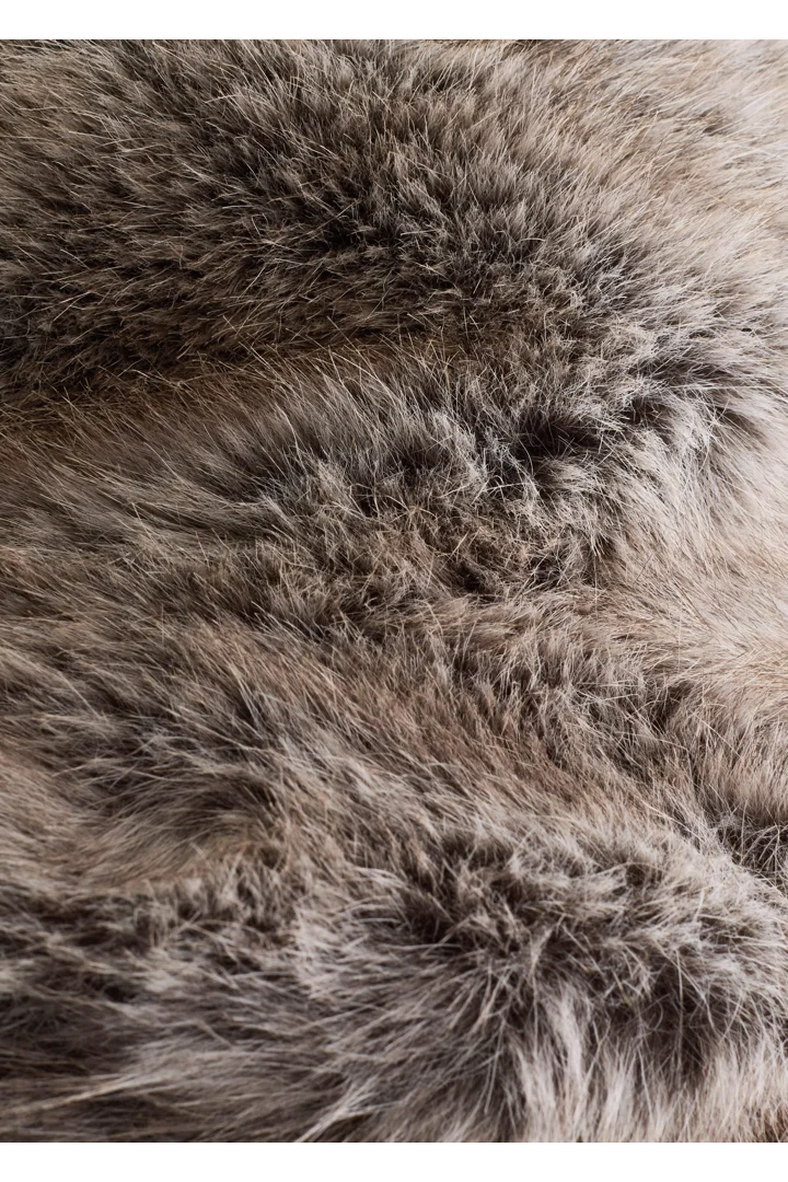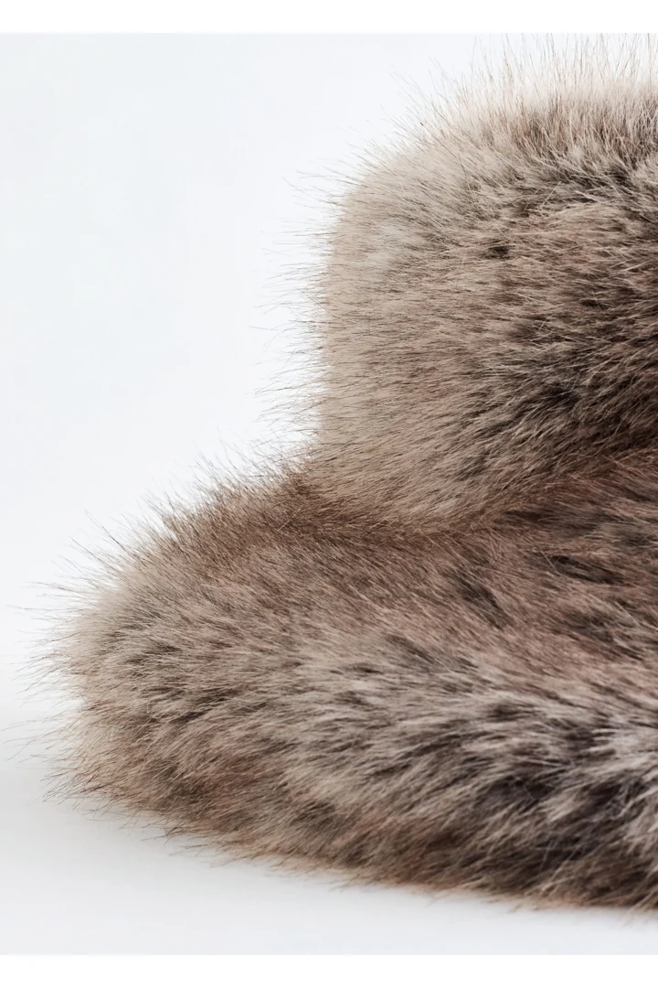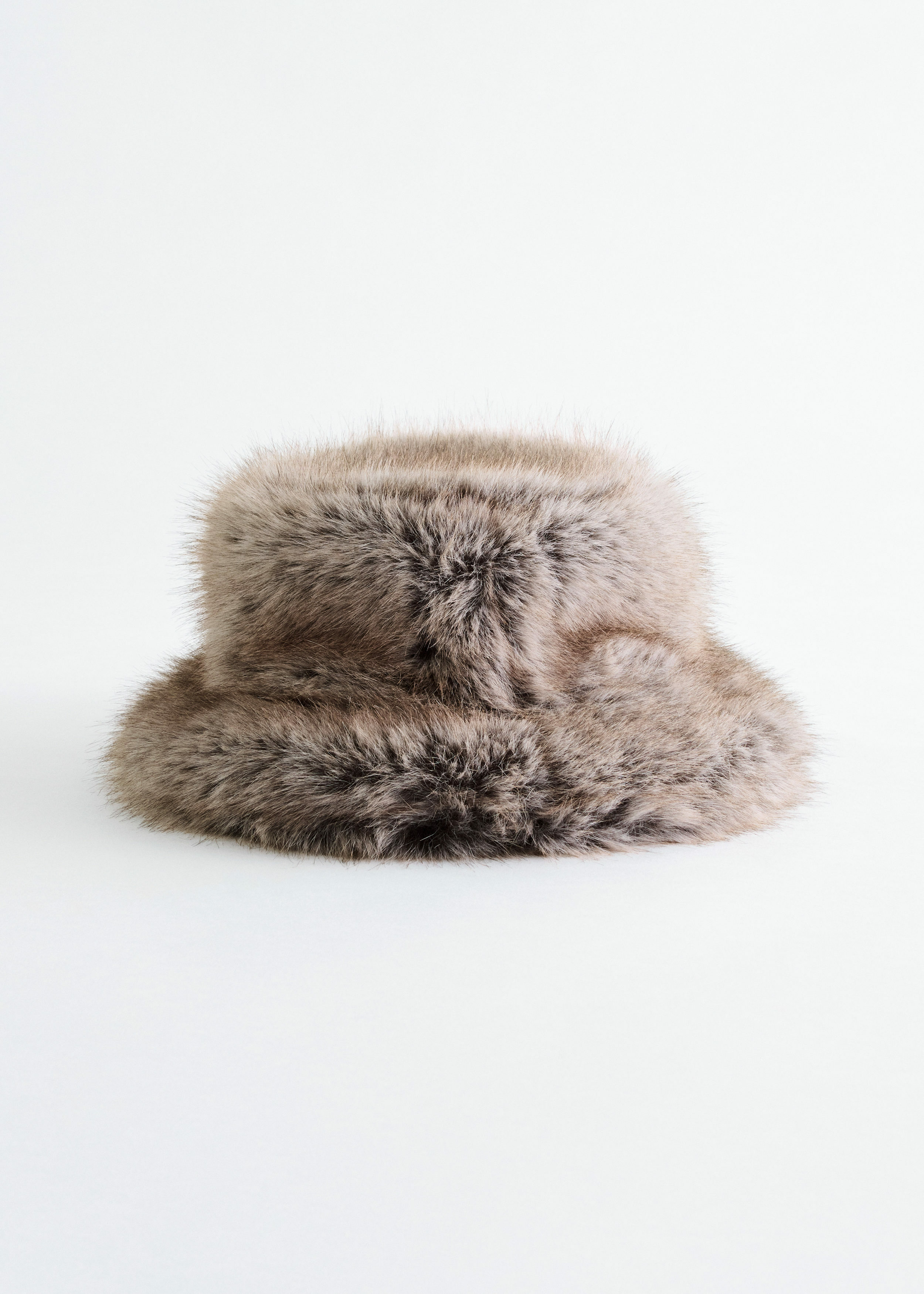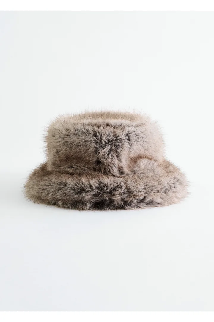 포근한 페이크 퍼 소재의 버켓 햇이에요. 플랫 형태의 상단 크라운과 사선의 챙이 특징이랍니다.