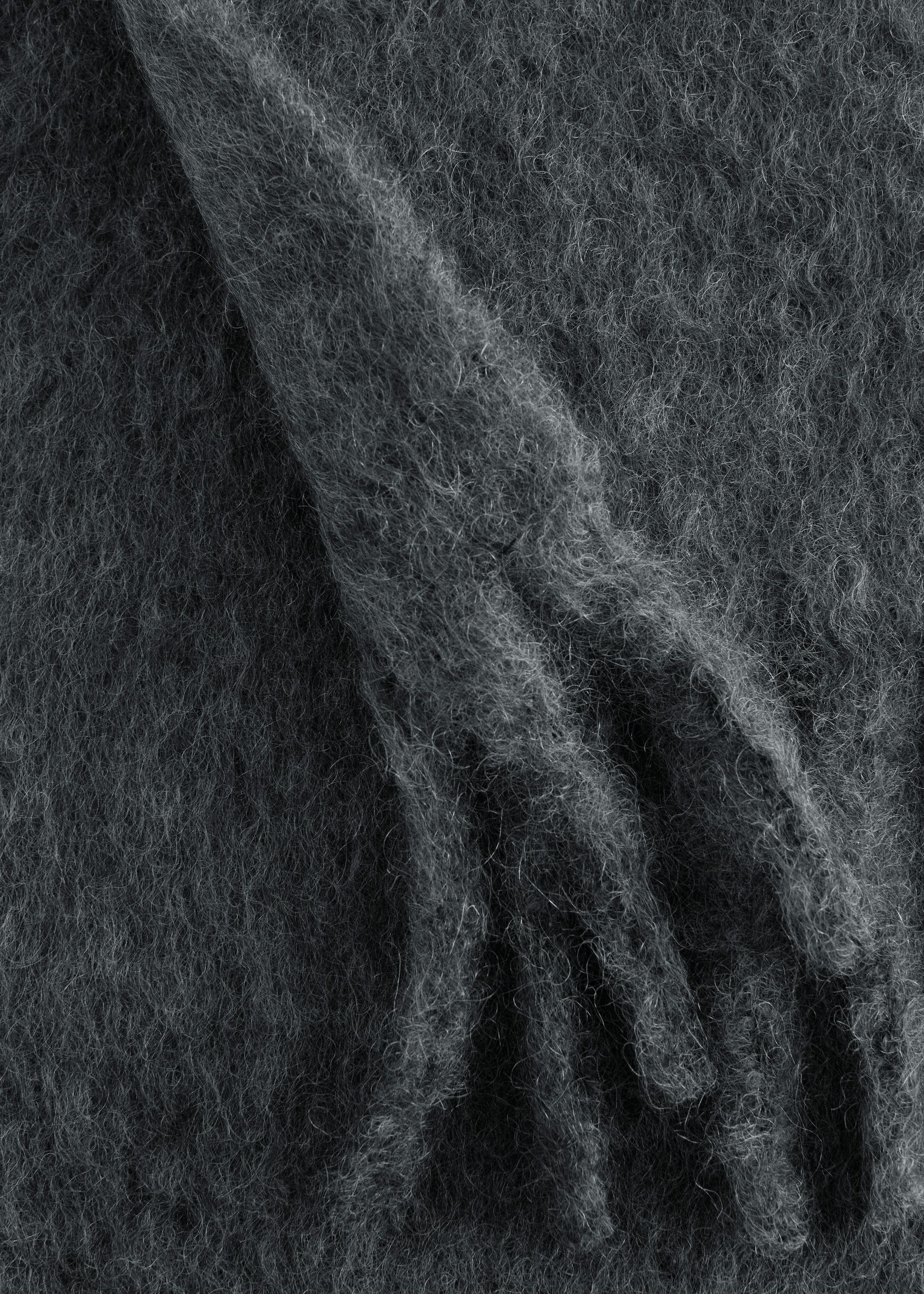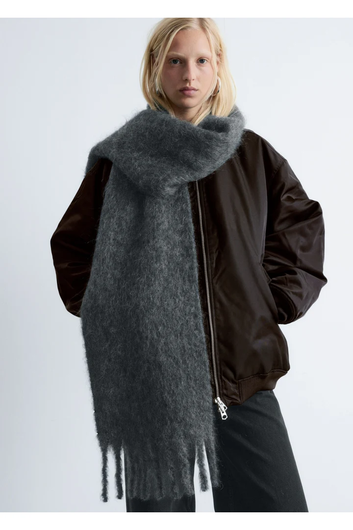 모헤어 & 울 소재로 따뜻하고 아늑한 감각을 전해주는 니트 스카프예요. 오버사이즈 쉐입과 찰랑이는 프린지 트리밍이 멋스럽답니다.