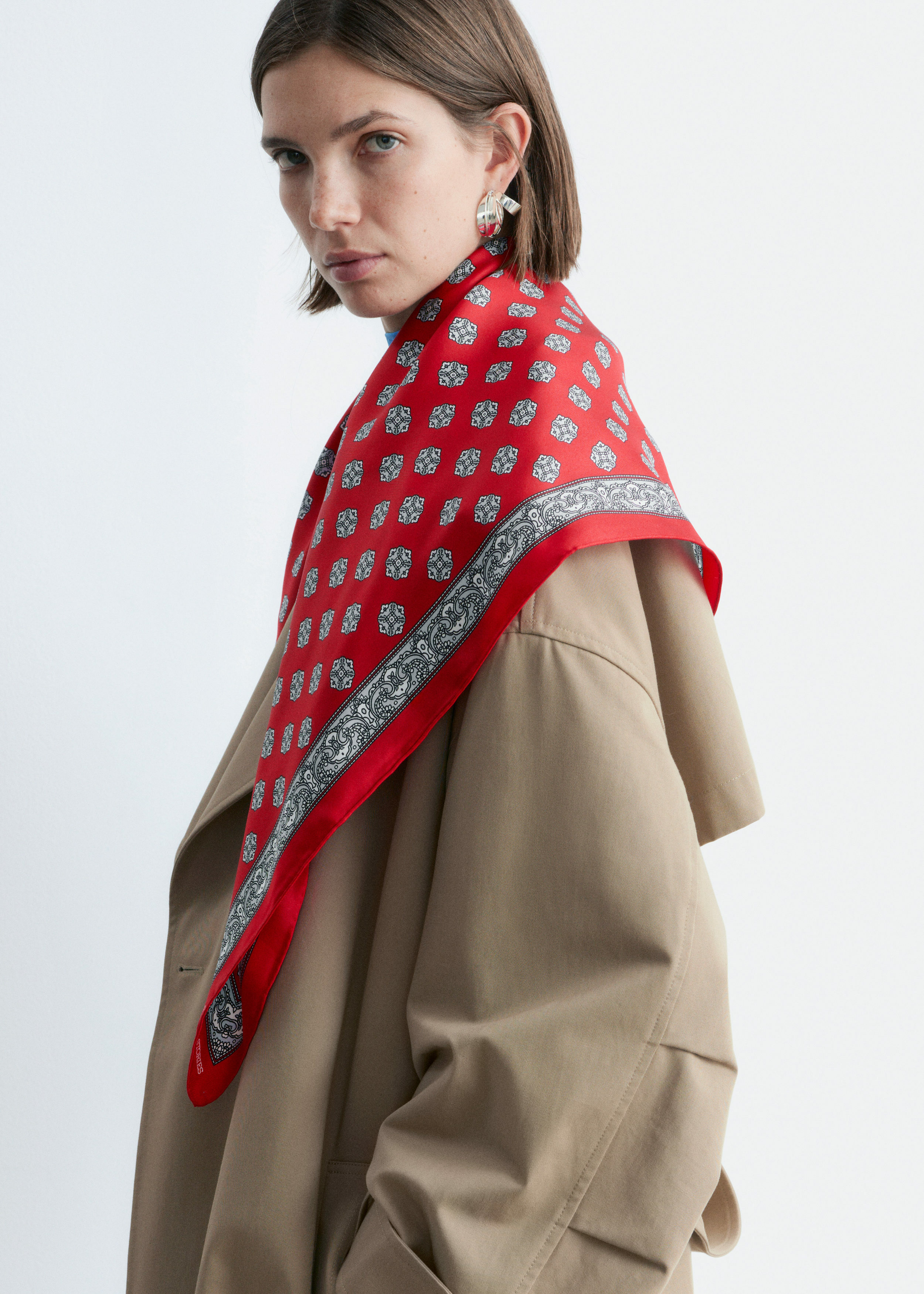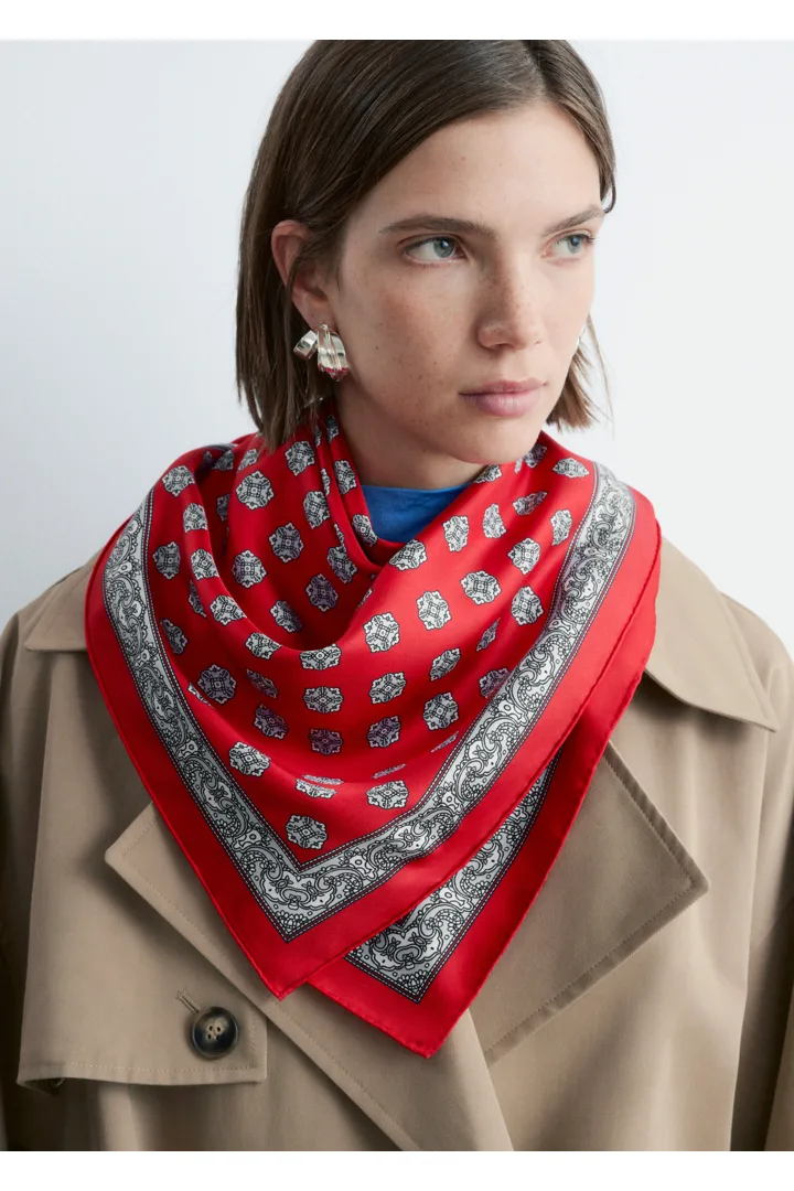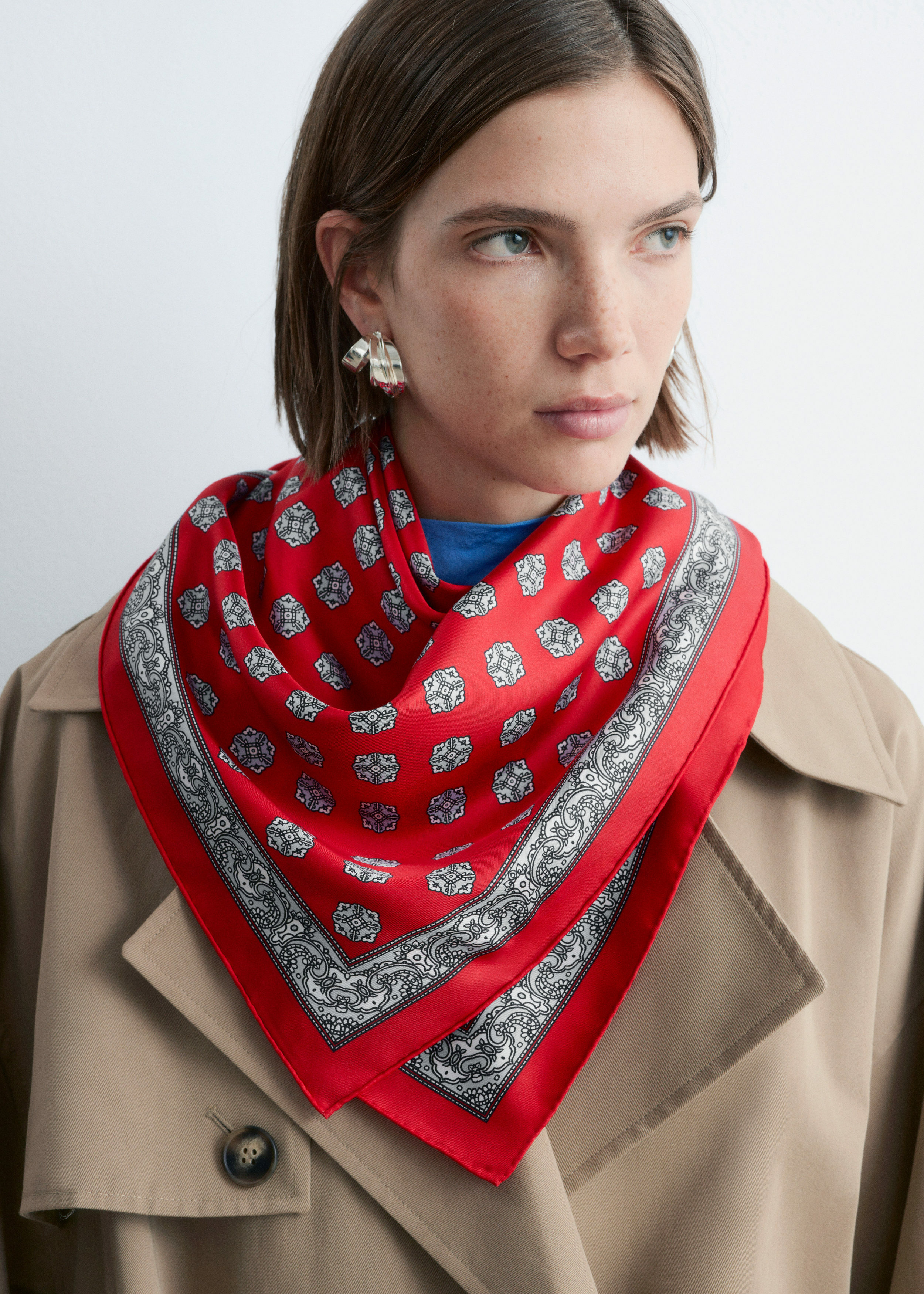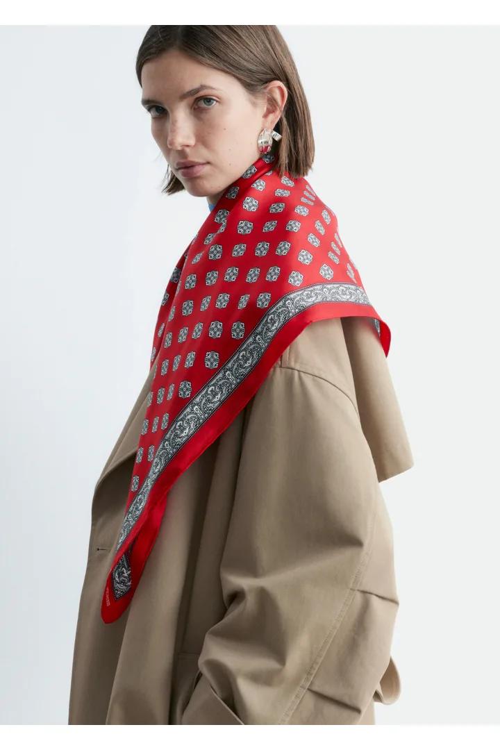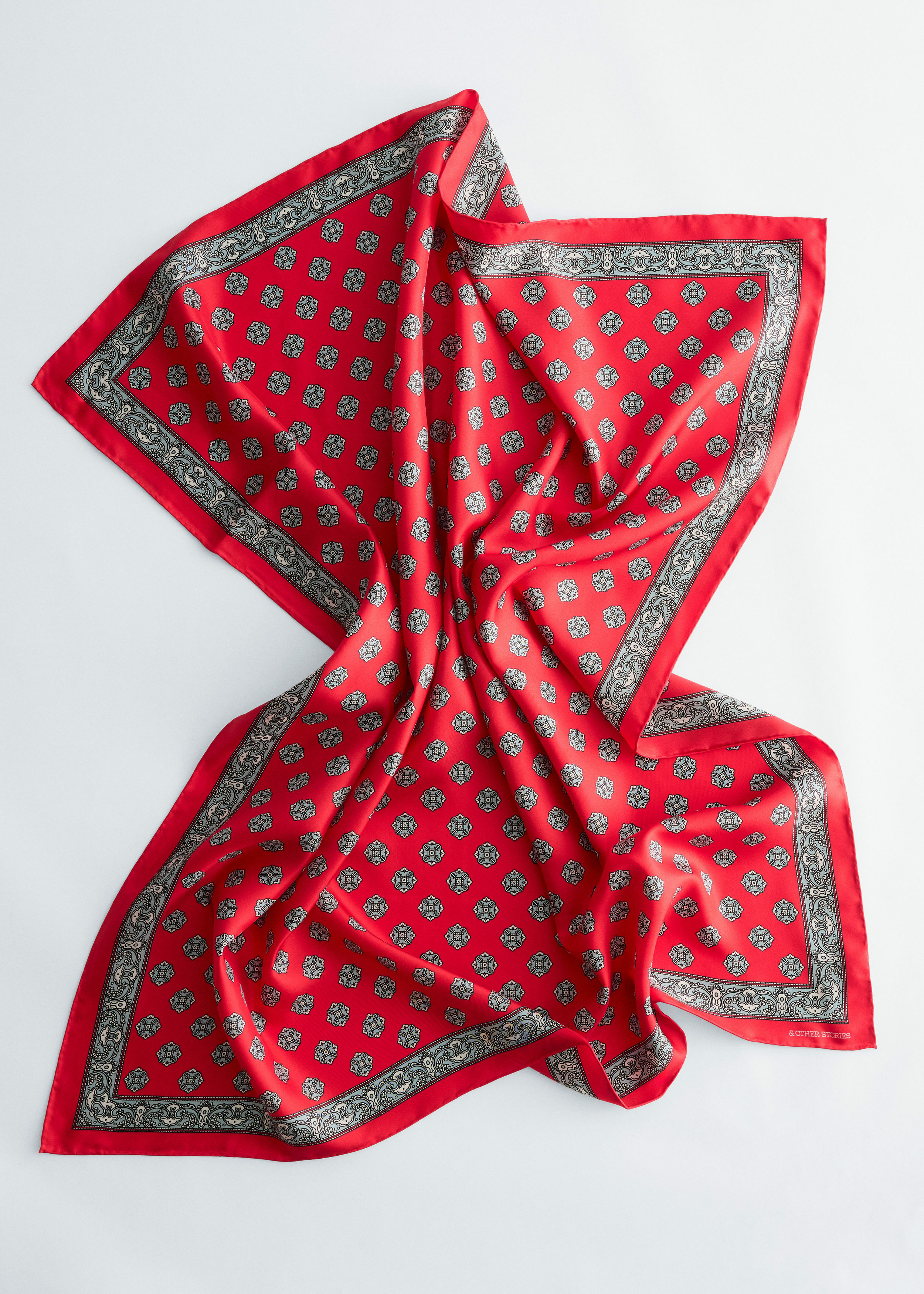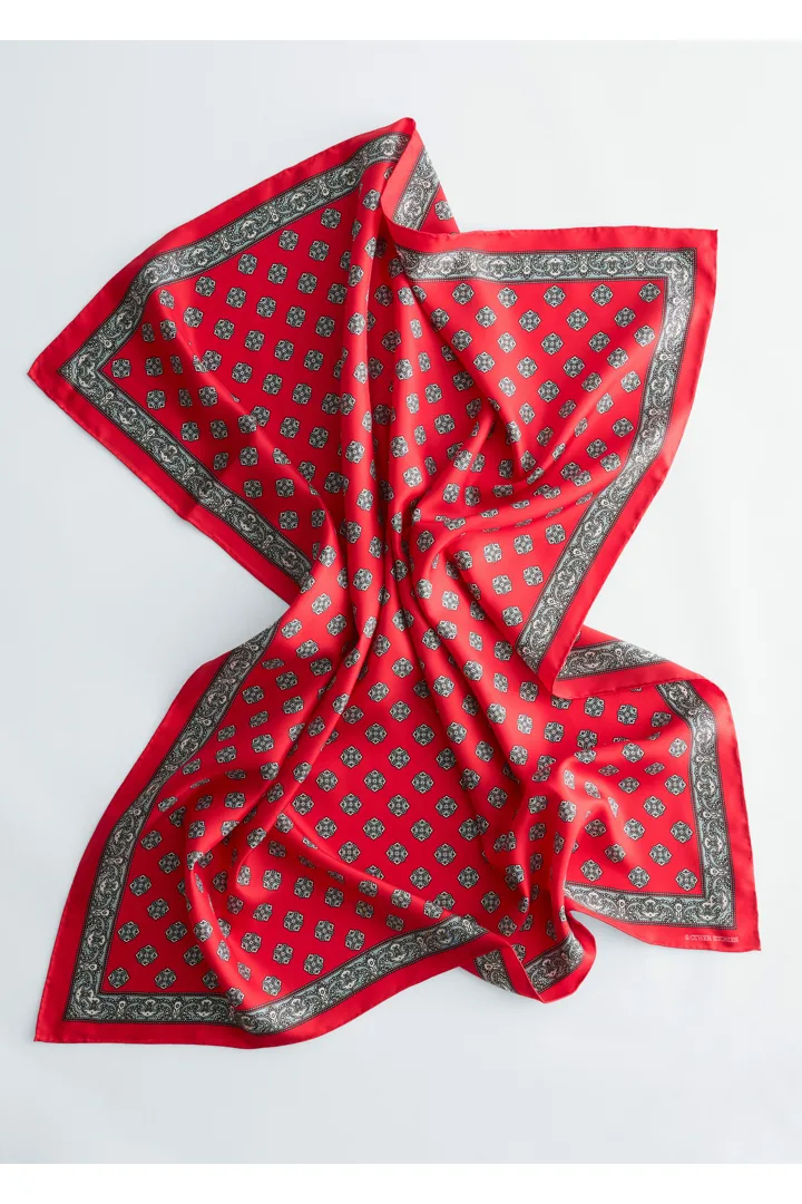 100% 멀베리 실크 소재의 가벼운 스카프예요. 장식 패턴이 매력적인 아이템이랍니다. 목에 두르거나 어깨에 걸쳐 연출하거나, 가방에 묶어 스타일링하는 등 다양하게 활용할 수 있어요.