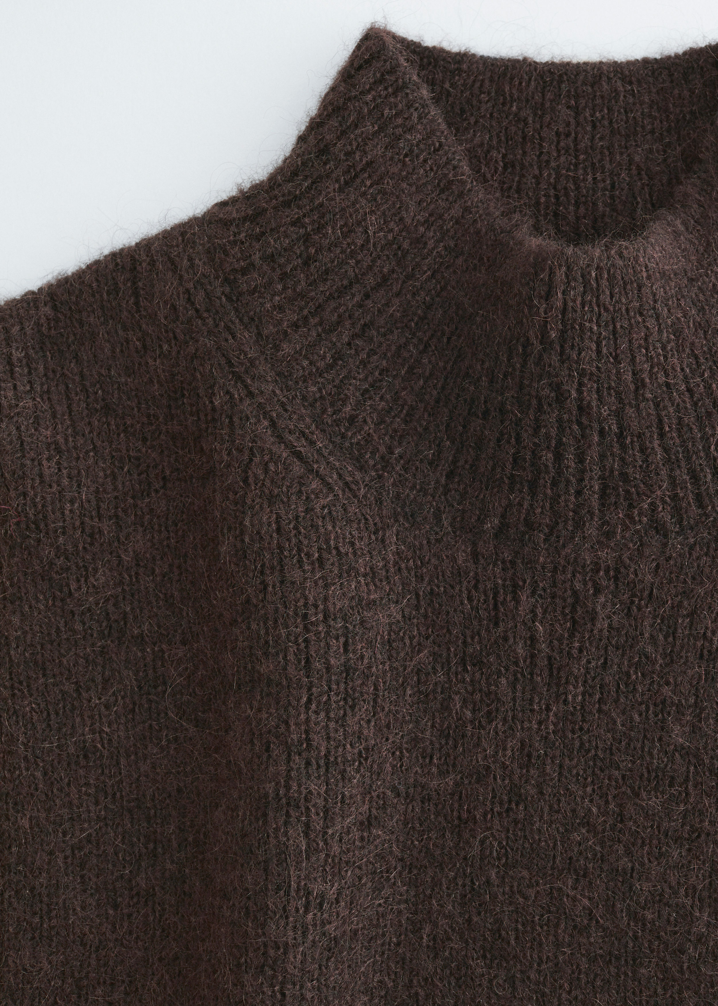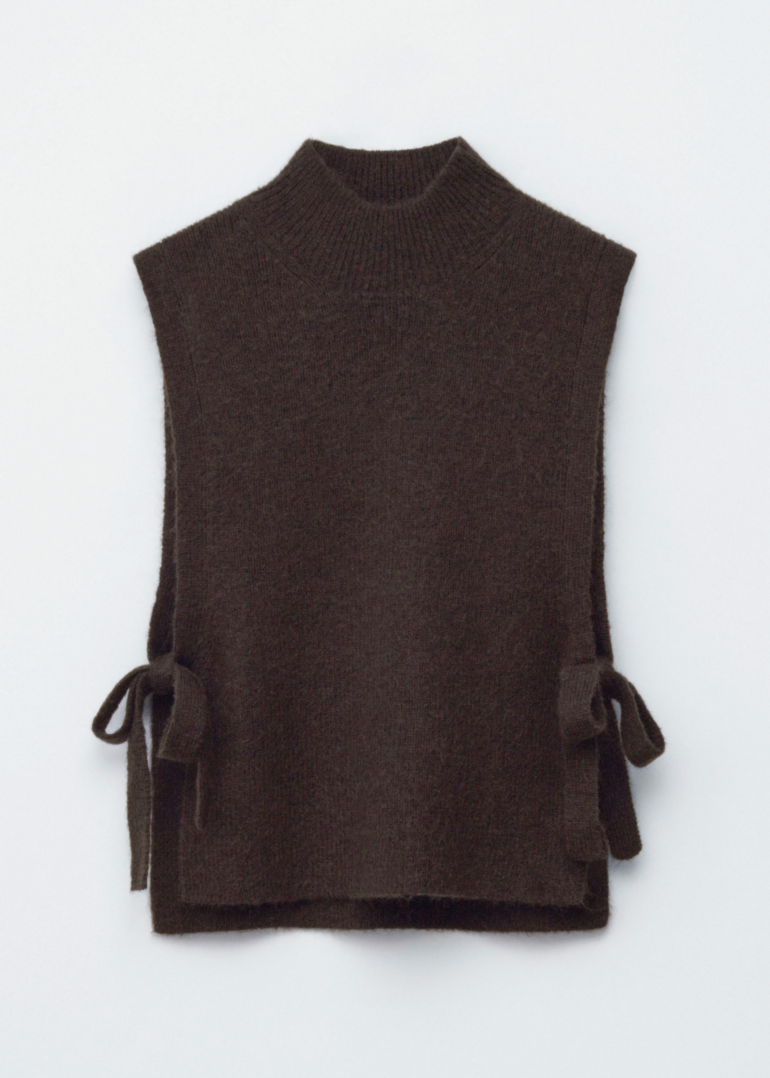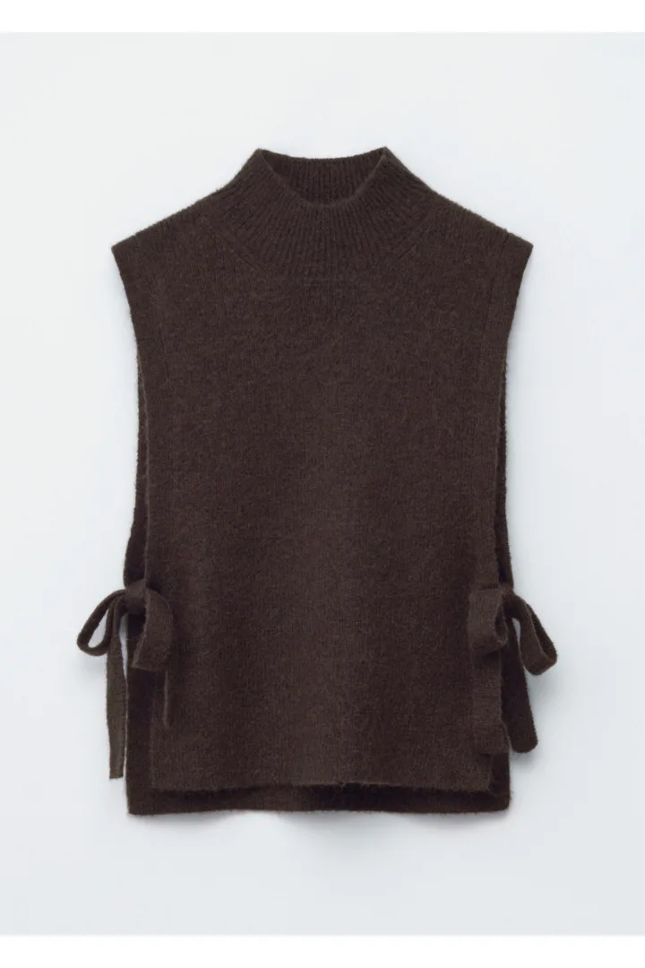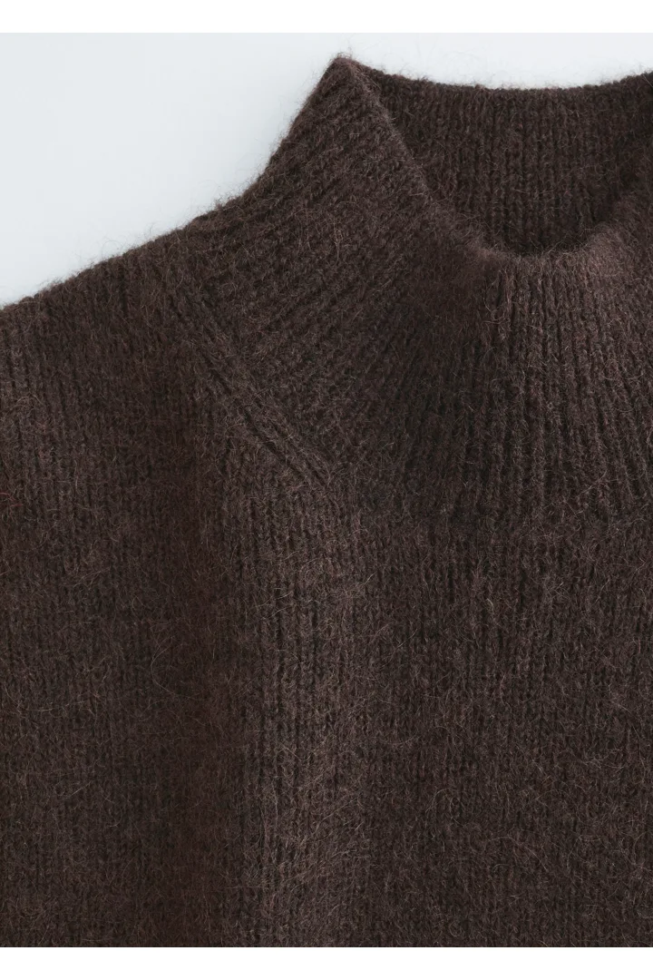 부드러운 울 & 모헤어 니트 소재의 모크 넥 비브 카라예요. 양쪽 측면부에는 타이가 자리해 있어요.