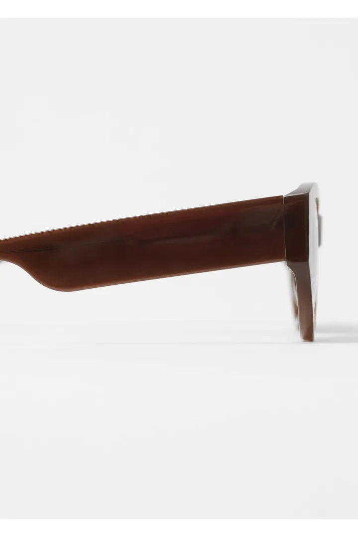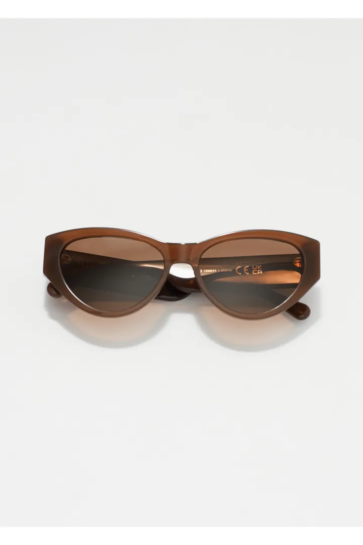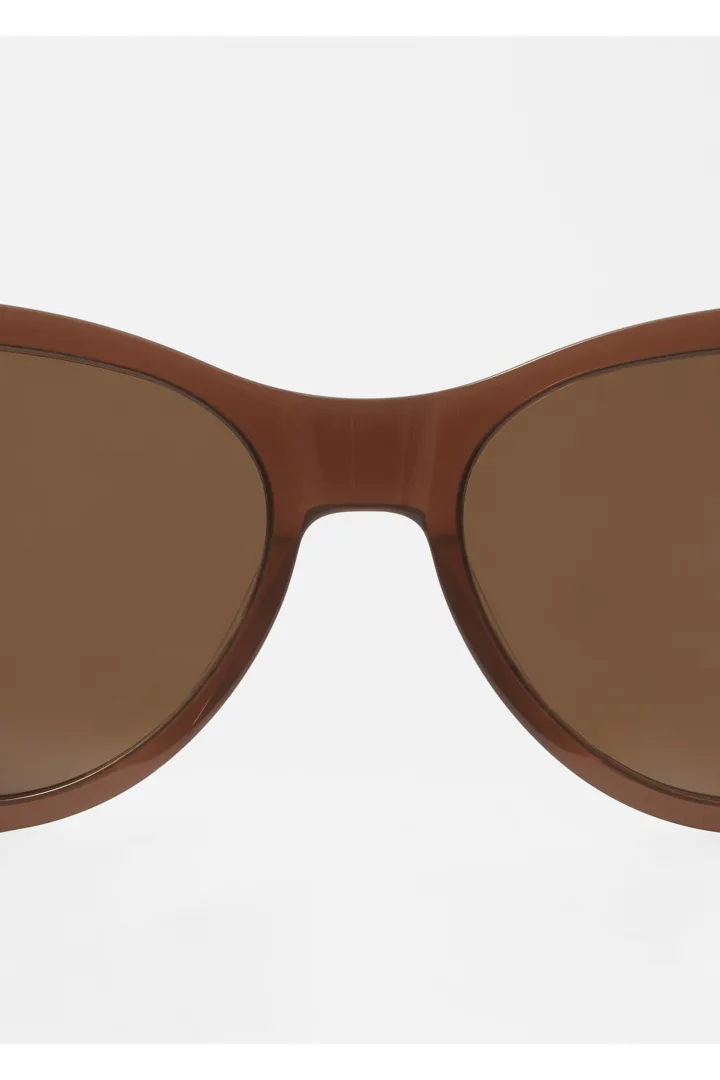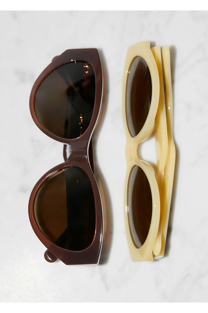 레트로 무드의 타원형 캣 아이 프레임이 볼드한 와이드 템플과 매끄럽게 어우러지는 선글라스예요. 아세테이트 소재로 탄생했으며, 토널 컬러의 편광 렌즈가 자리해 있어 햇볕을 스타일리시하게 차단해 준답니다.
