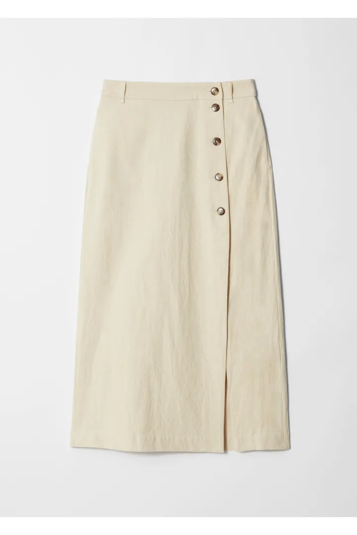 헴프 & 코튼 혼방 소재로 탄생한 미디 스커트예요. A 라인 실루엣, 장식 단추, 앞면의 깊은 슬릿이 특징이며 측면 솔기의 포켓과 뒷면의 웰트 포켓이 자리해 있어요.
