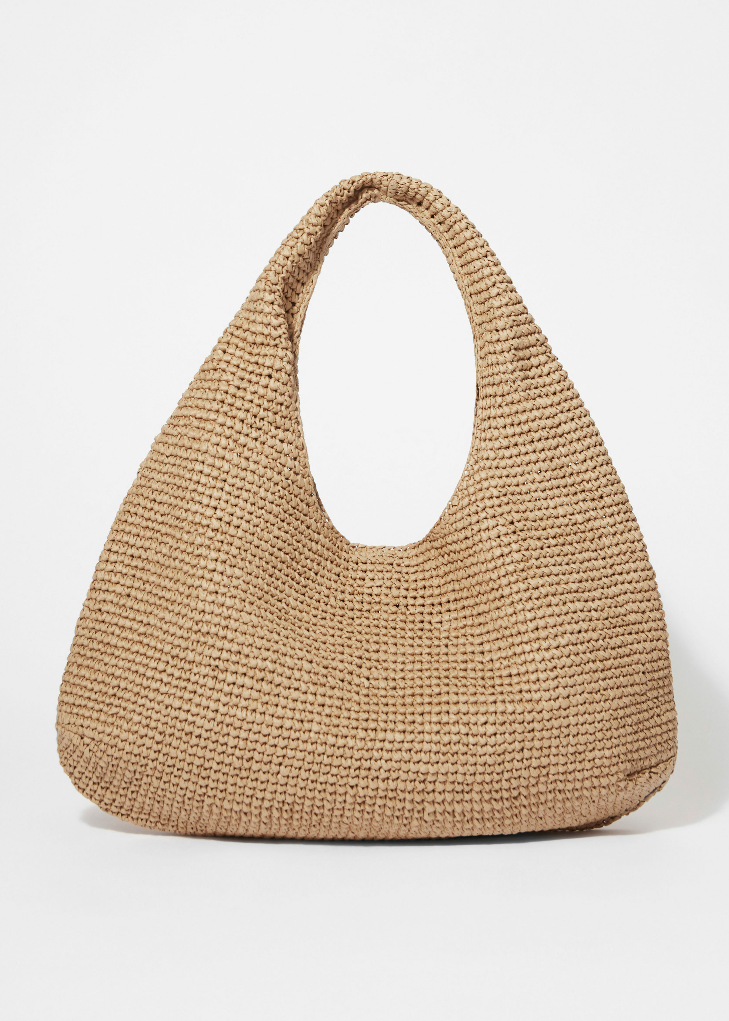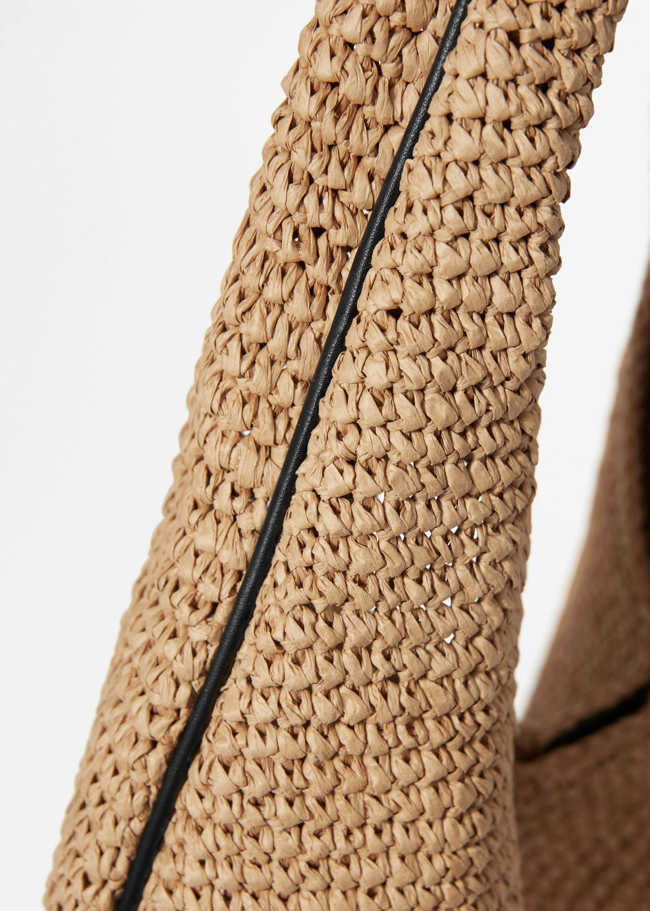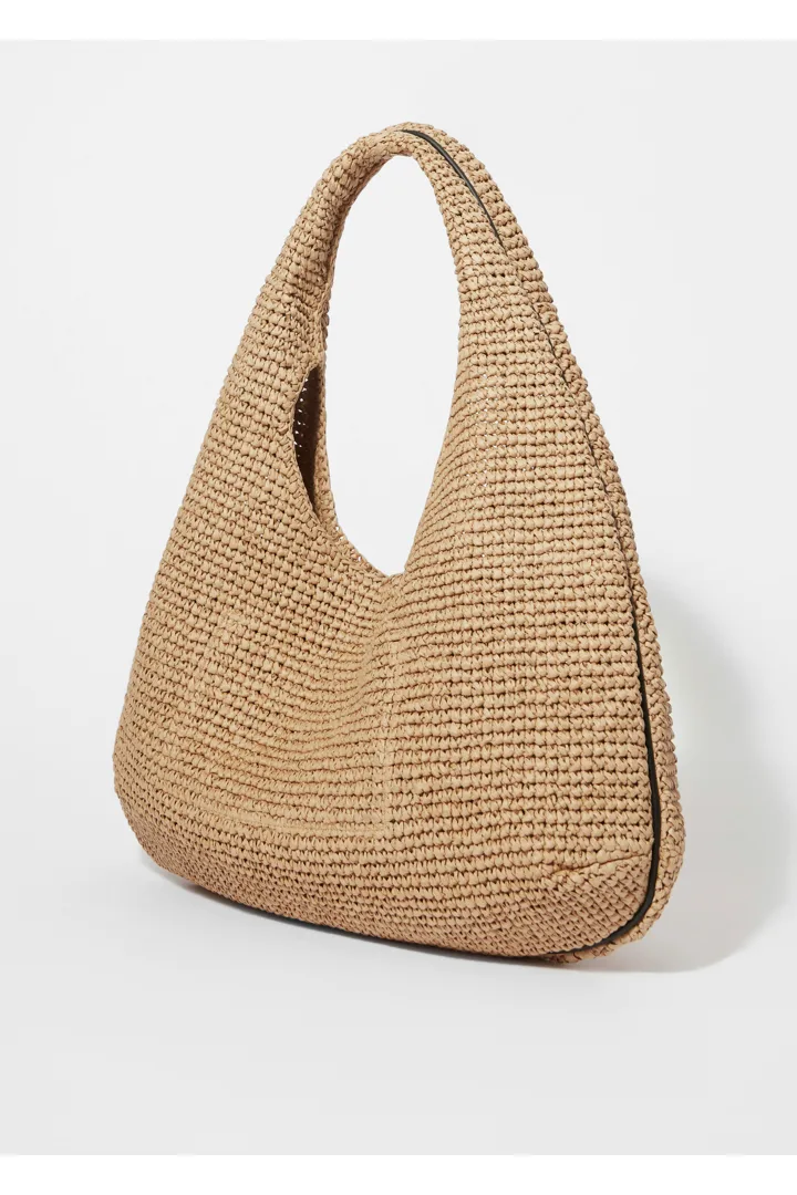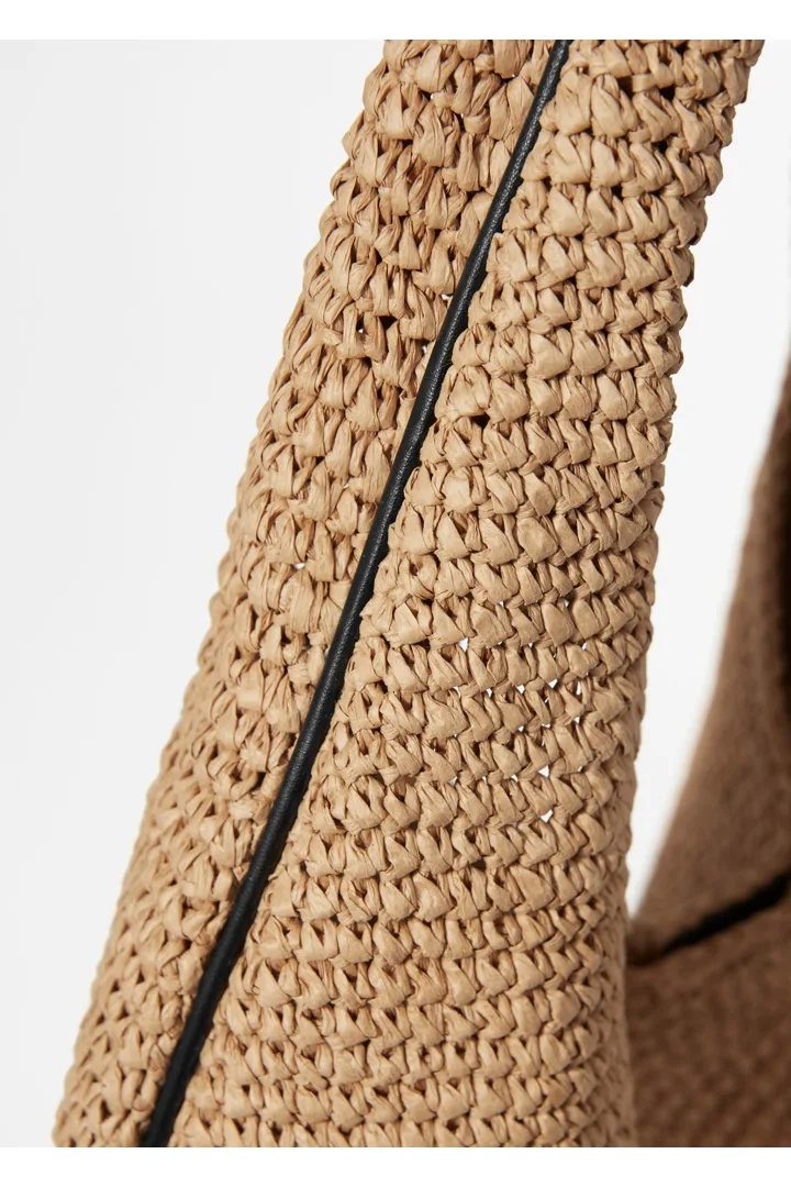 우븐 페이퍼 스트로 소재의 숄더 백이에요. 테두리의 섬세한 가죽 파이핑으로 심플하면서도 대담한 디테일을 더해주어요. 상단의 컨실드 스냅 클로저를 열면 소지품을 안전하게 수납하기 좋은 넉넉한 내부 공간과 이너 포켓이 드러난답니다. 손잡이를 접어 볼륨감 있는 클러치로 연출할 수도 있어요.