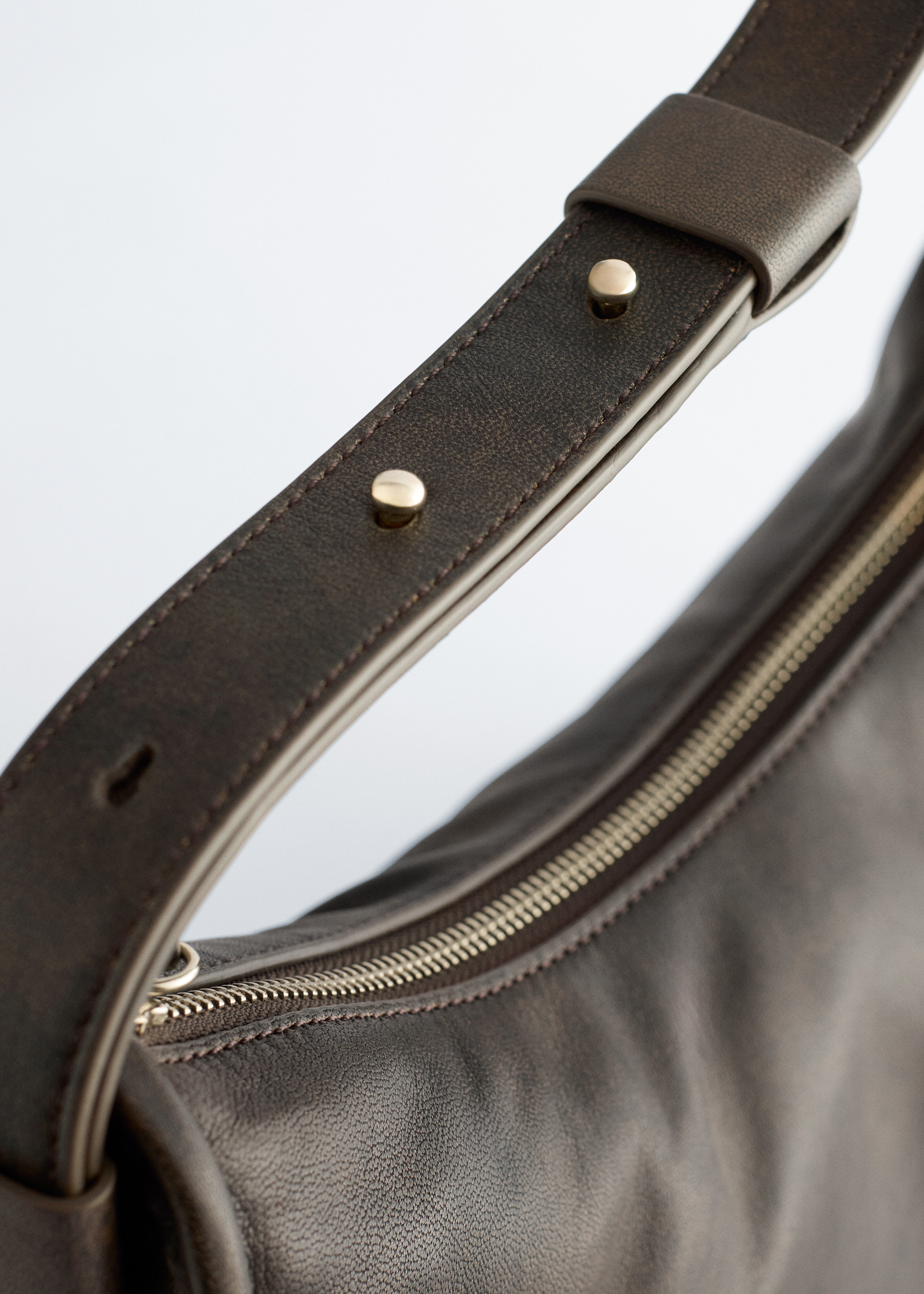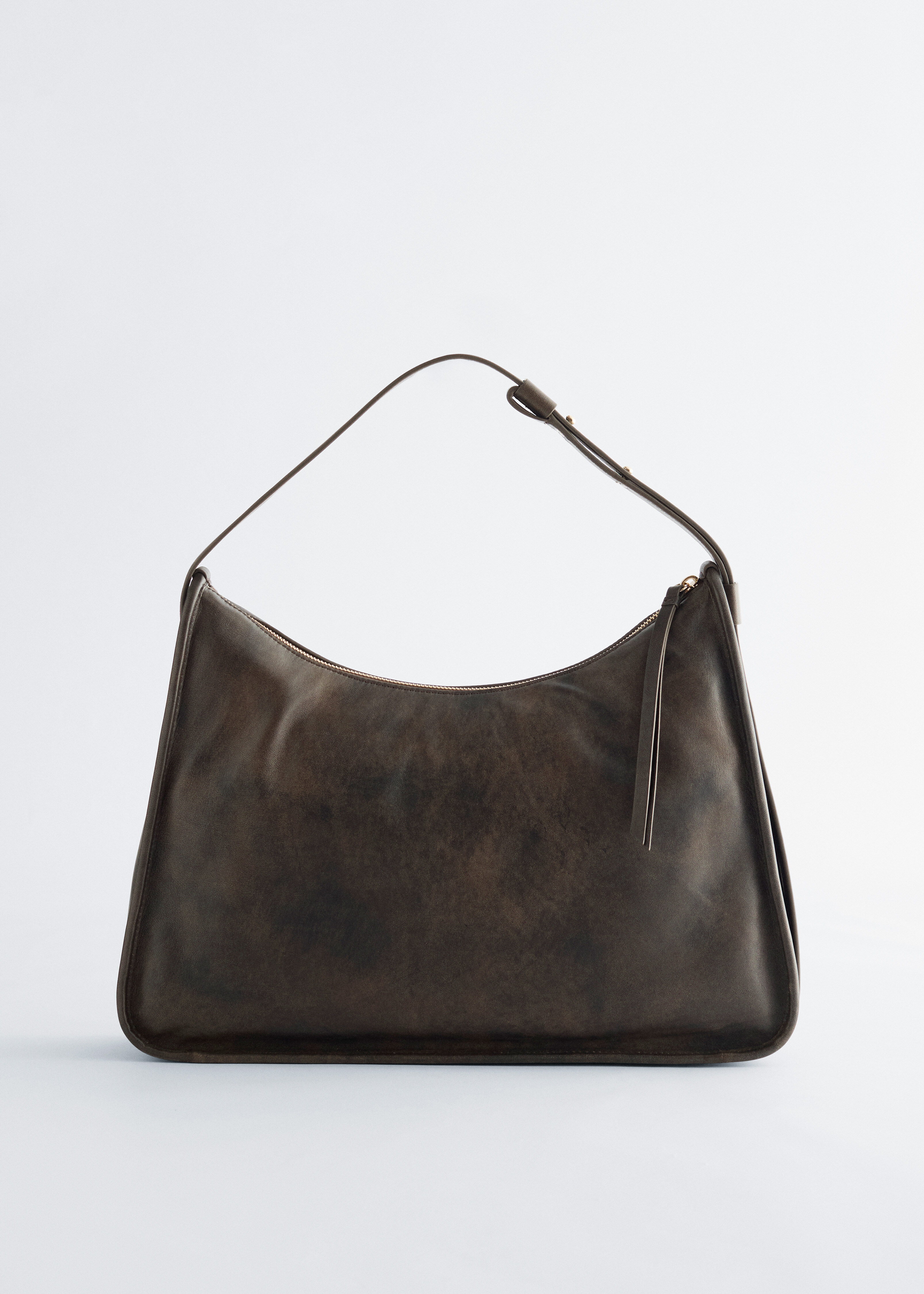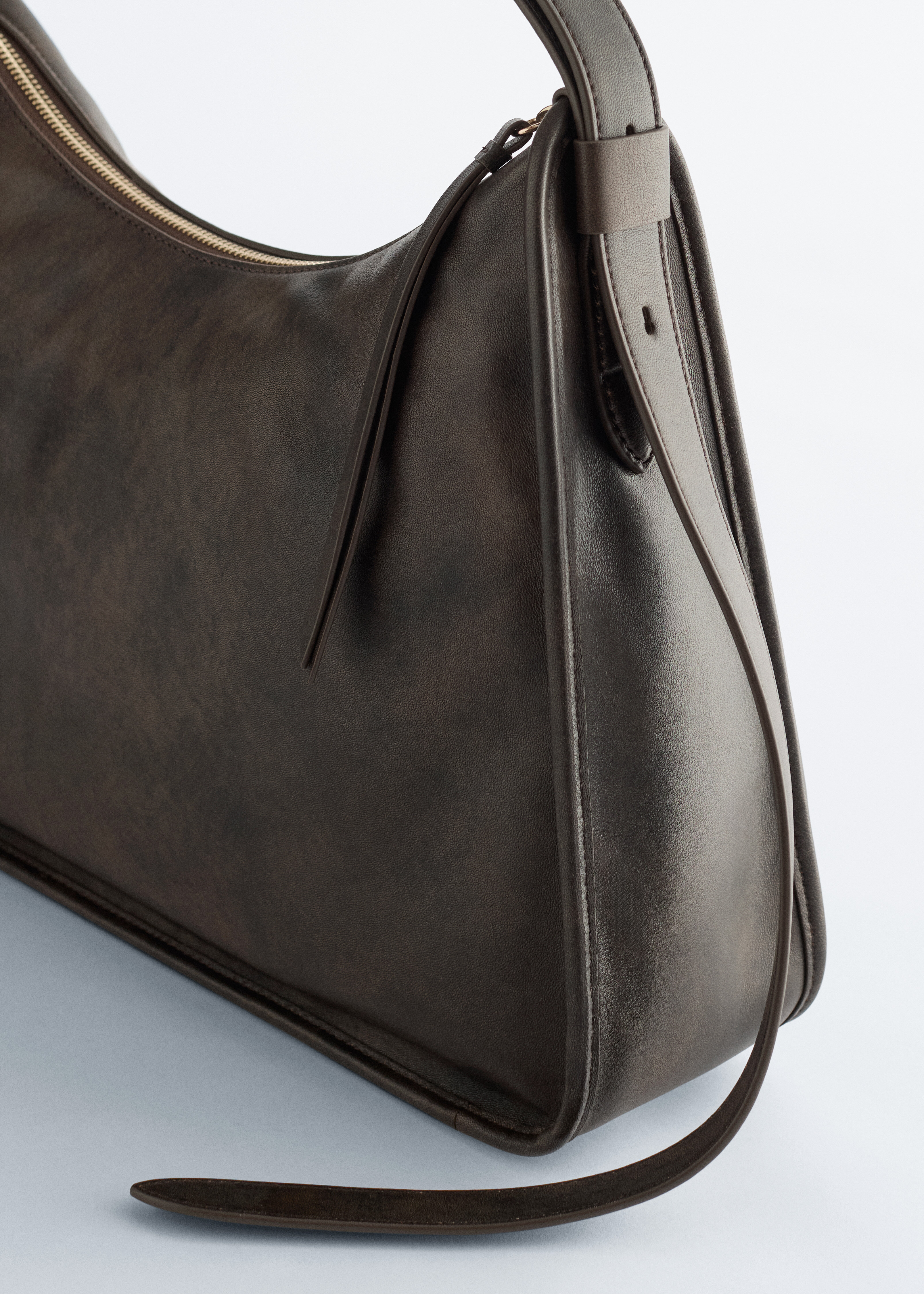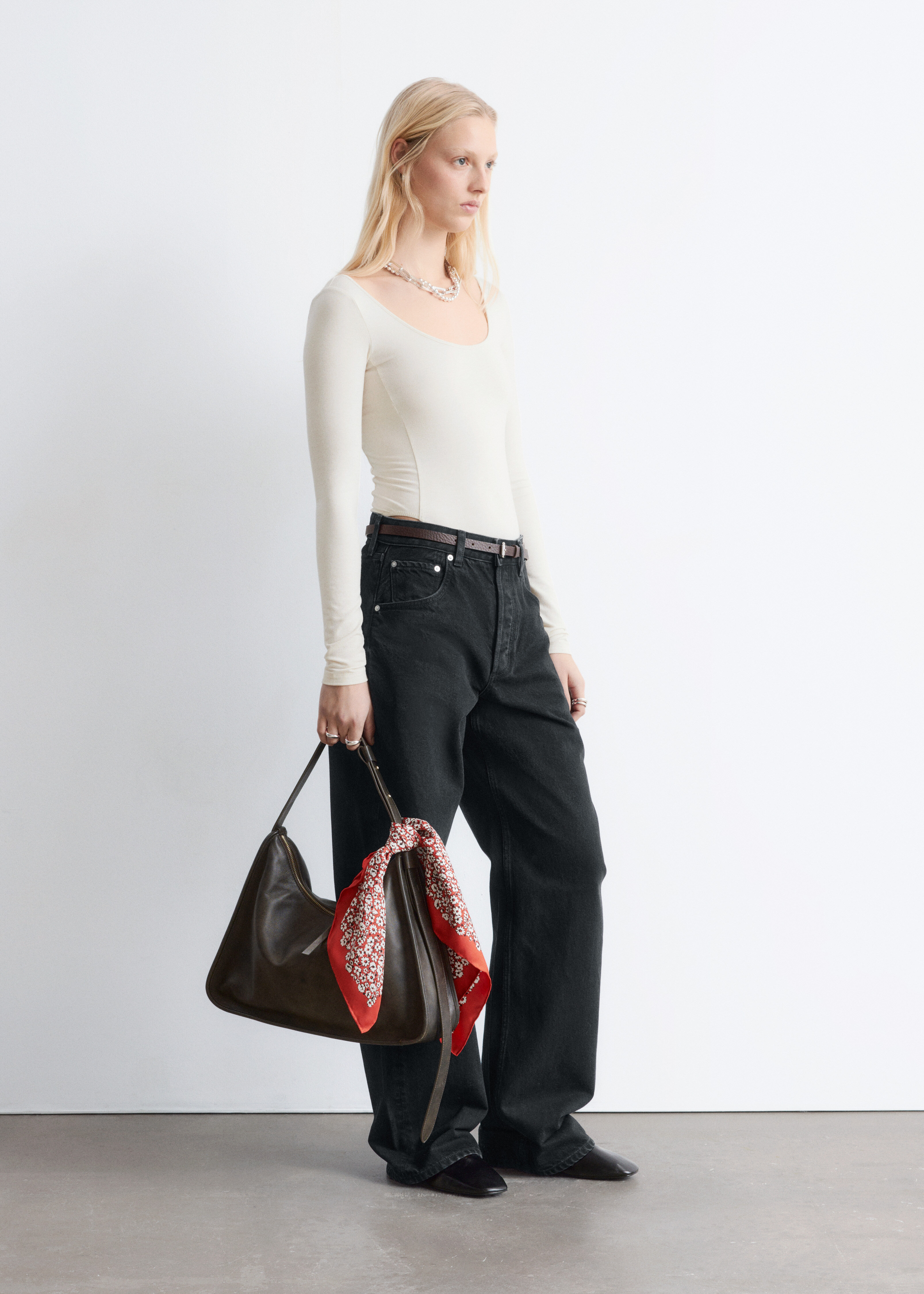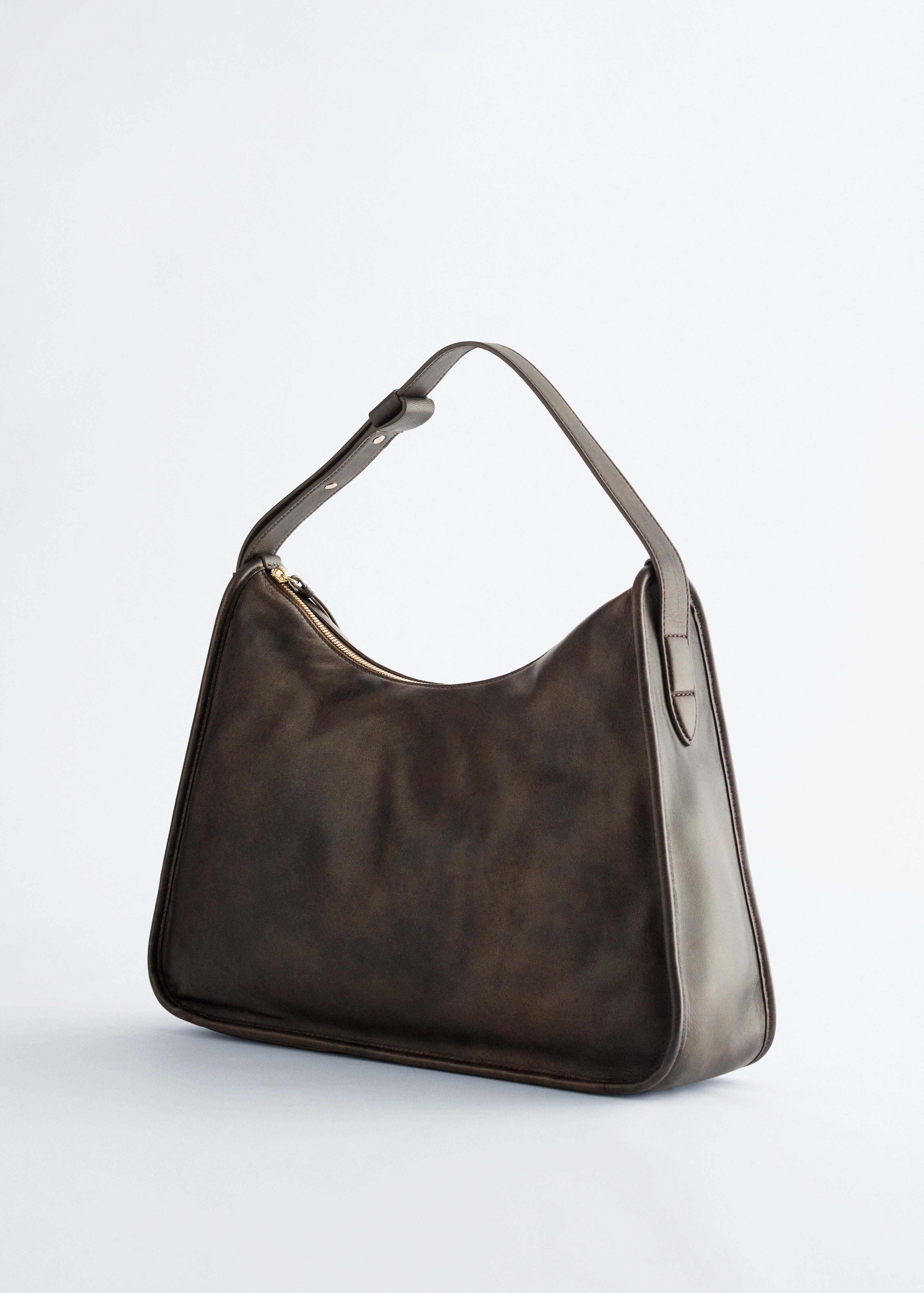인도에서 부드러운 가죽으로 제작된 로우 라인 토트 백이에요. 각진 모서리와 은은한 트리밍이 특징이죠. 지퍼 디테일, 조절형 숄더 스트랩, 지퍼 이너 포켓이 특징으로 일상의 필수 소지품을 휴대하기 좋답니다.
