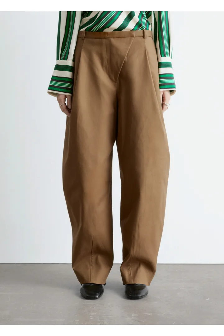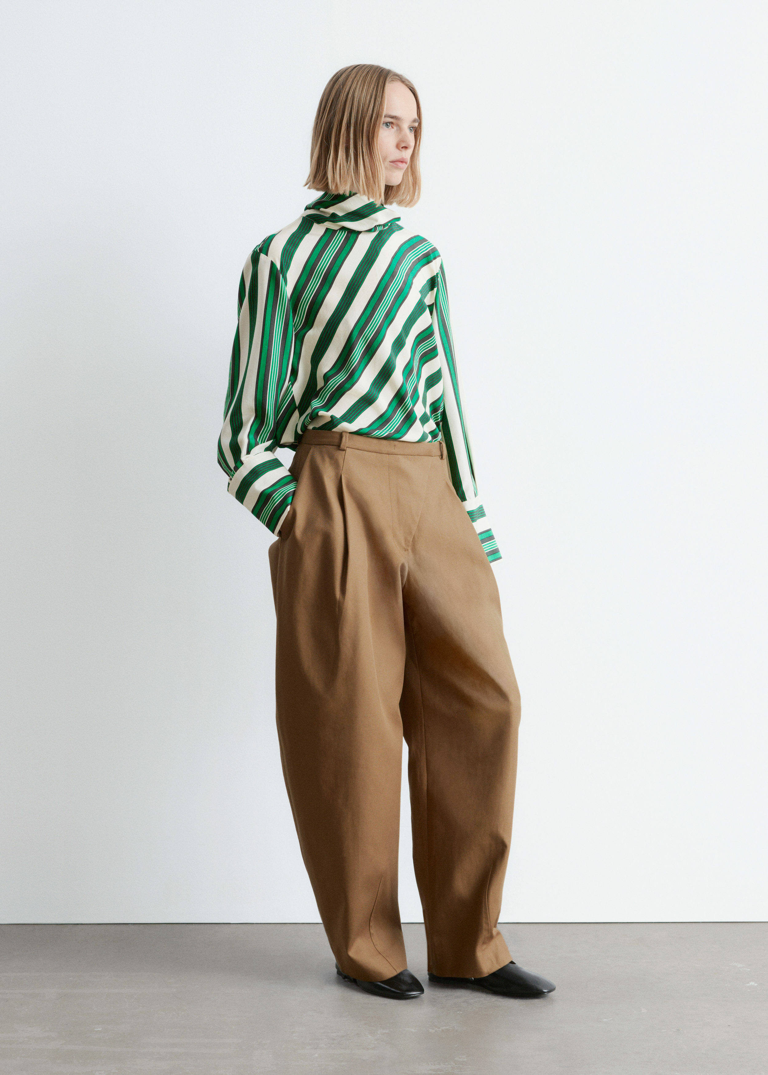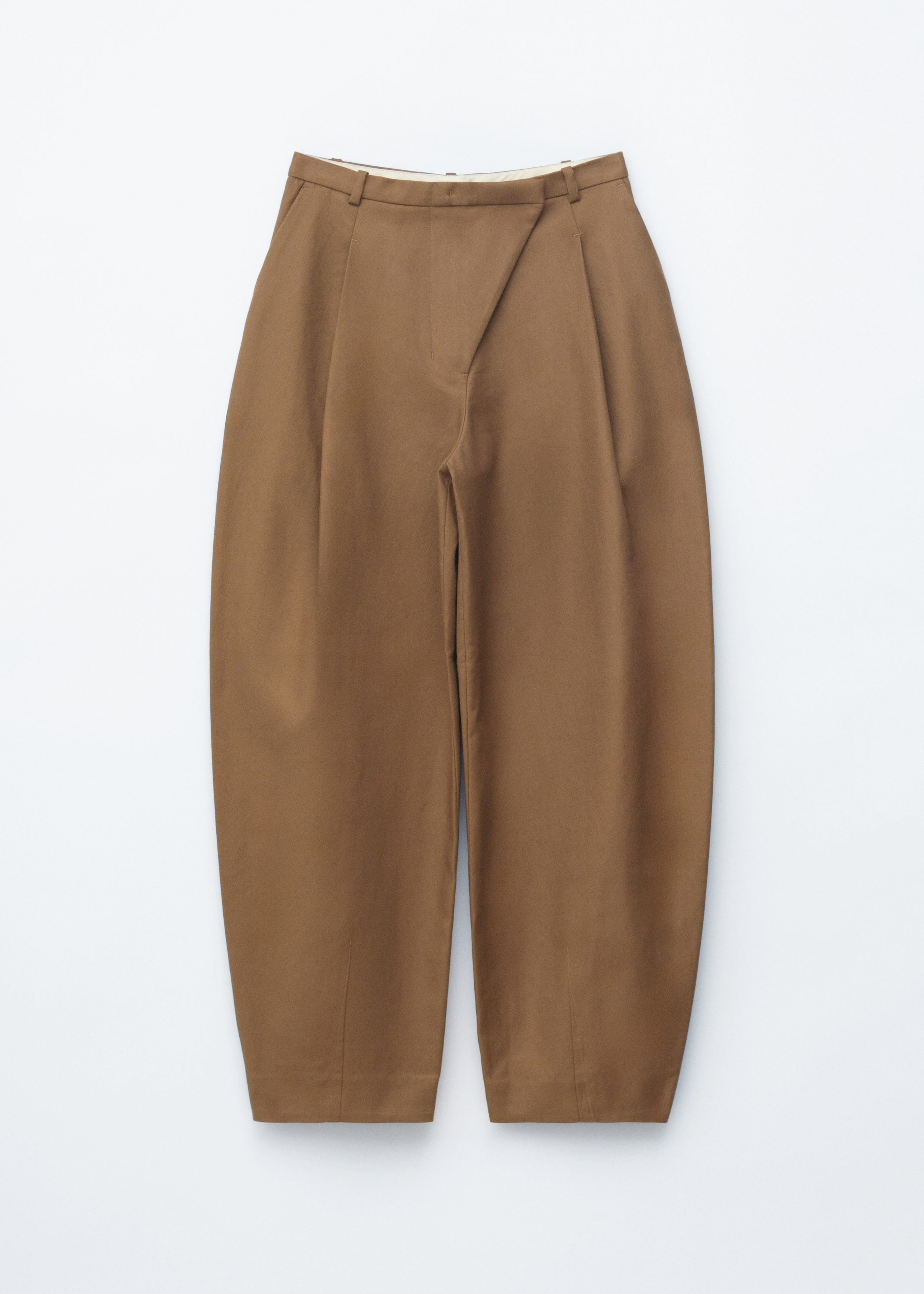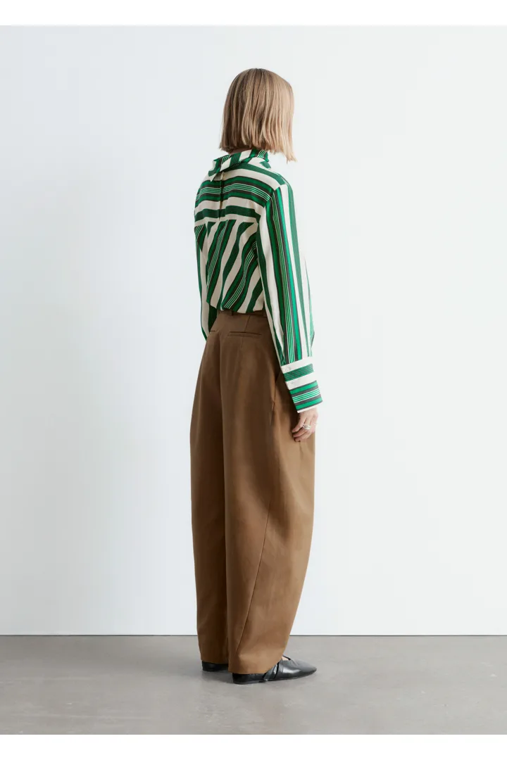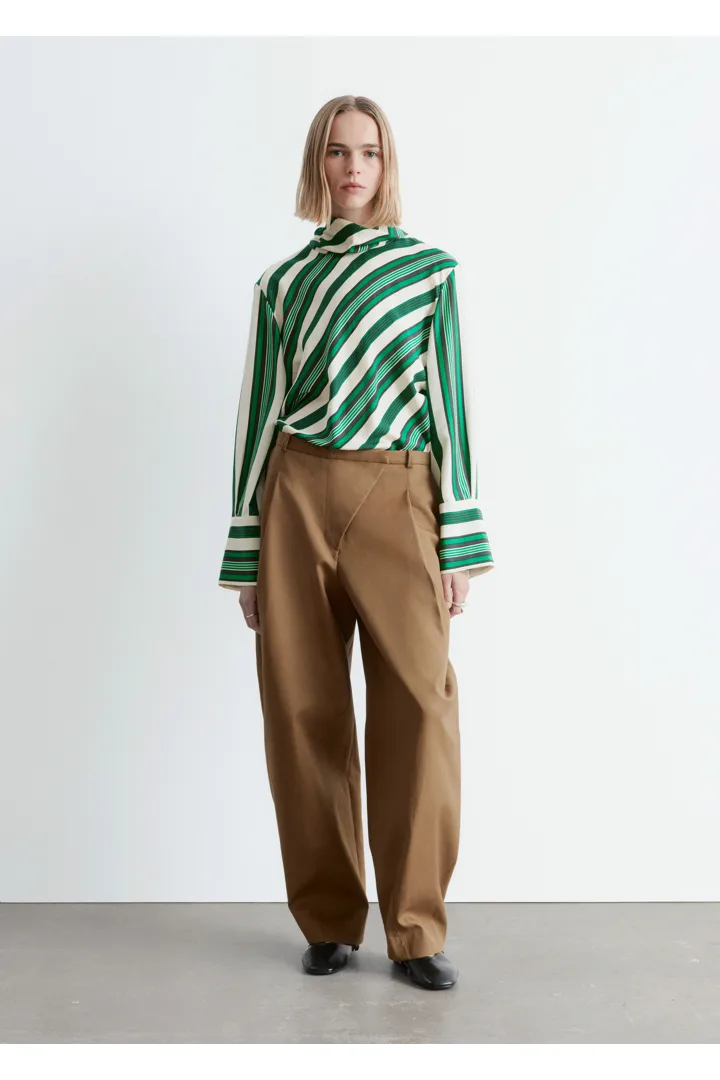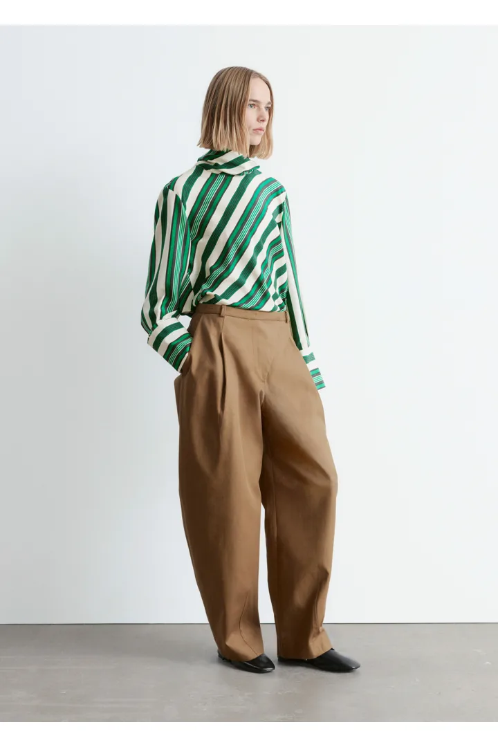 코튼 트윌 소재의 트라우저예요. 루즈 핏, 그리고 롱 배럴 레그 앞면에 자리한 박스 플리츠가 멋스럽답니다. 측면 솔기 포켓, 뒷면의 웰트 포켓, 사선 플라이, 지퍼와 단추, 그리고 후크 앤 바 클로저가 자리해 있어요.