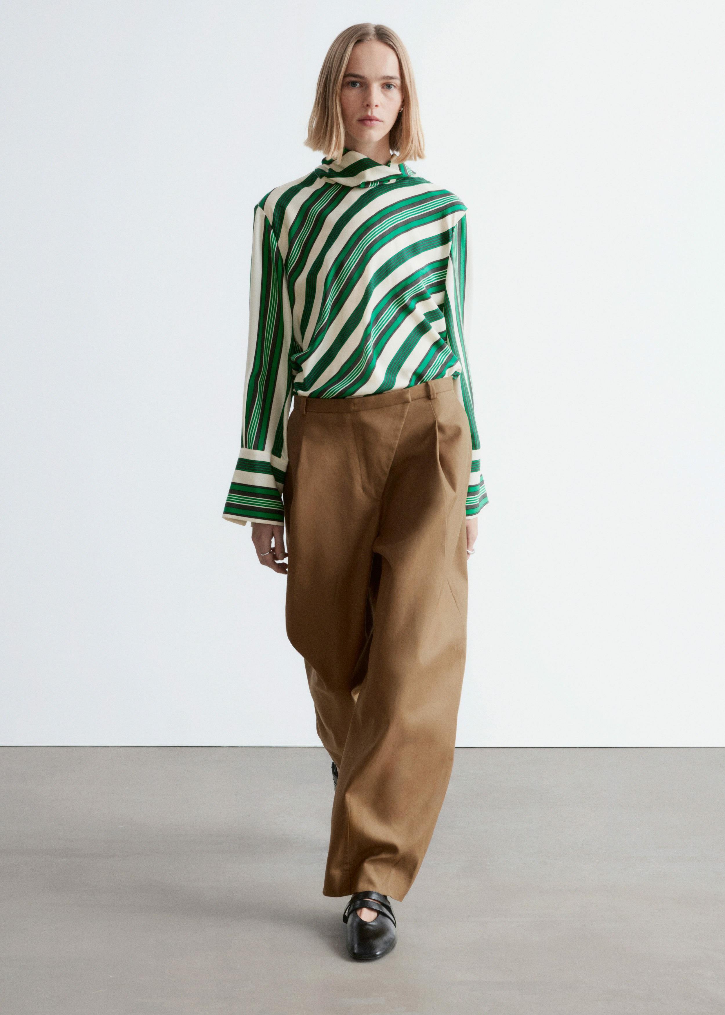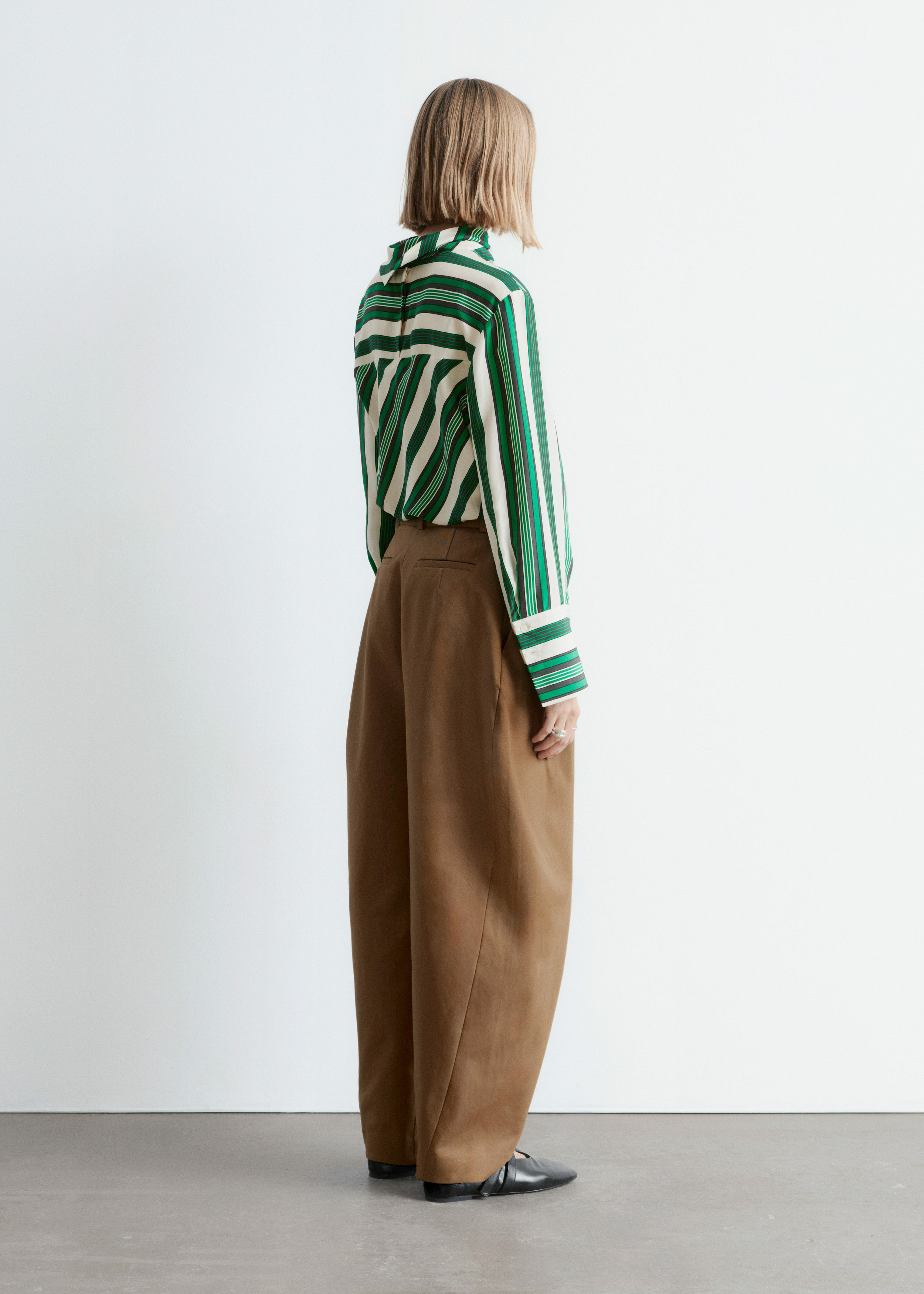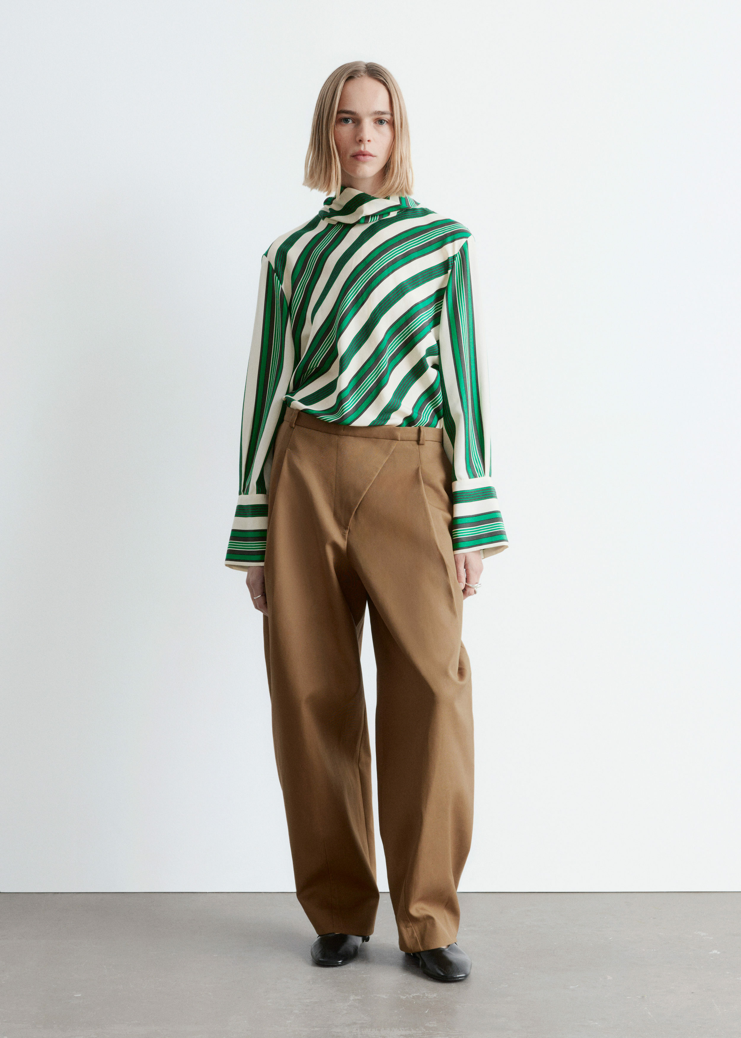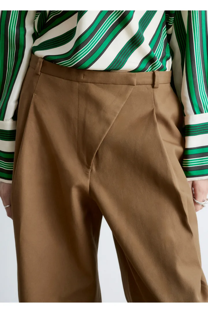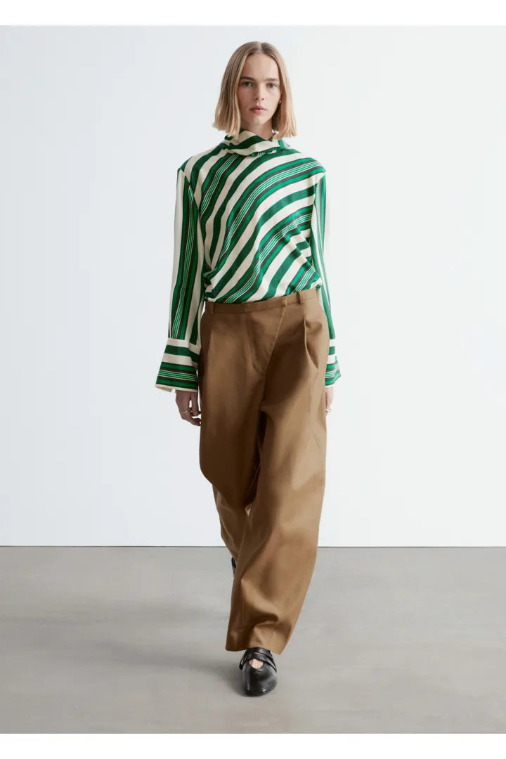 코튼 트윌 소재의 트라우저예요. 루즈 핏, 그리고 롱 배럴 레그 앞면에 자리한 박스 플리츠가 멋스럽답니다. 측면 솔기 포켓, 뒷면의 웰트 포켓, 사선 플라이, 지퍼와 단추, 그리고 후크 앤 바 클로저가 자리해 있어요.
