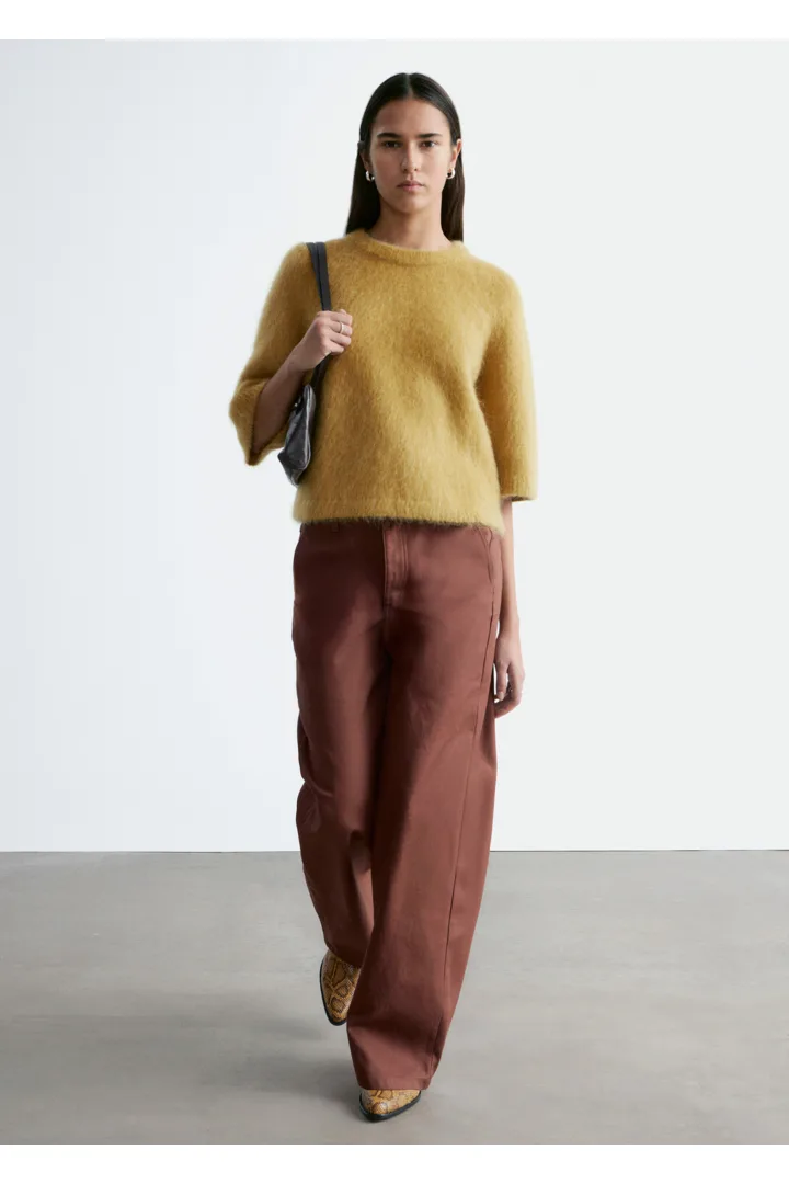 브러시드 모헤어 & 울 혼방 니트 소재의 티셔츠예요. 루즈한 실루엣, 라운드 네크라인, 립 트리밍, 그리고 팔꿈치까지 오는 슬리브가 특징이랍니다.