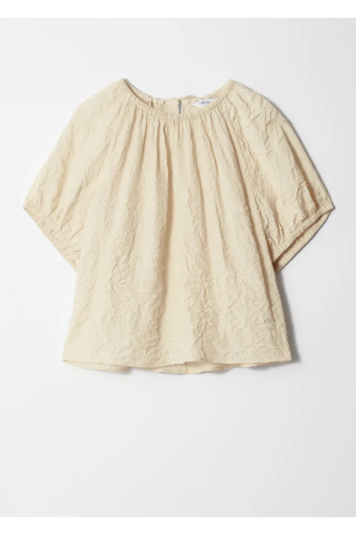 가볍고 시원한 소재로 탄생한 블라우스예요. 부드러운 크링클 마감으로 자연스러운 텍스처를 연출한답니다. 루즈한 실루엣, 부드러운 쉐입의 쇼트 슬리브, 그리고 오프 숄더로도 연출할 수 있는 엘라스틱 네크라인이 특징이에요. 네크라인에는 키홀 클로저와 타이 밴드가 자리해 있어요.