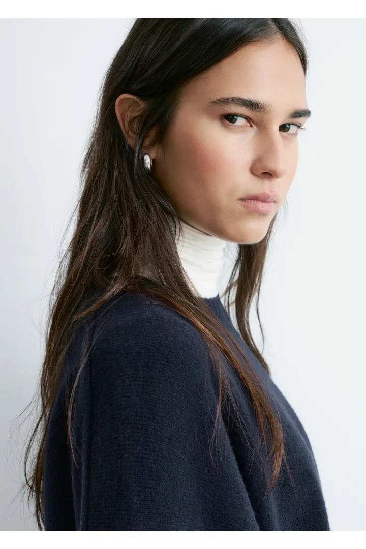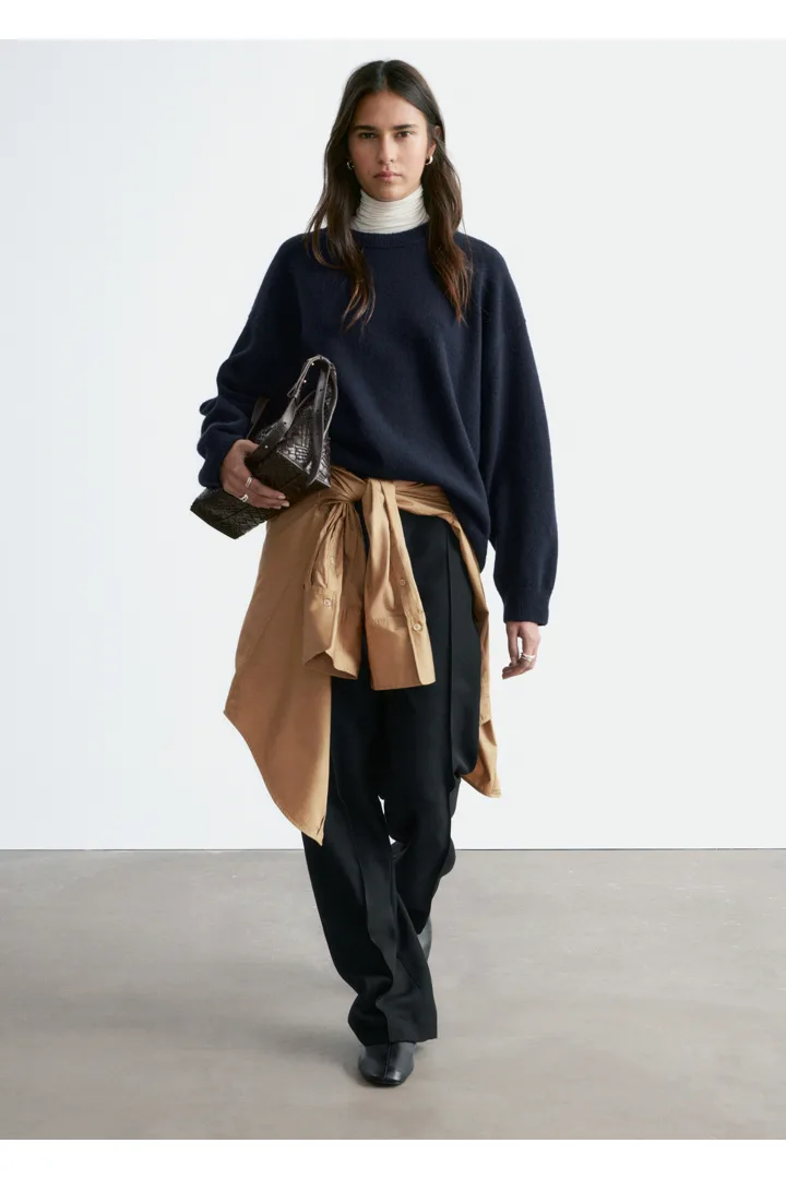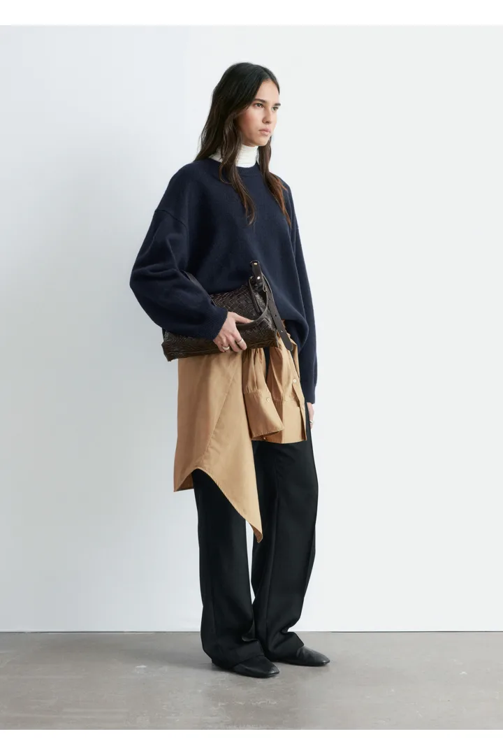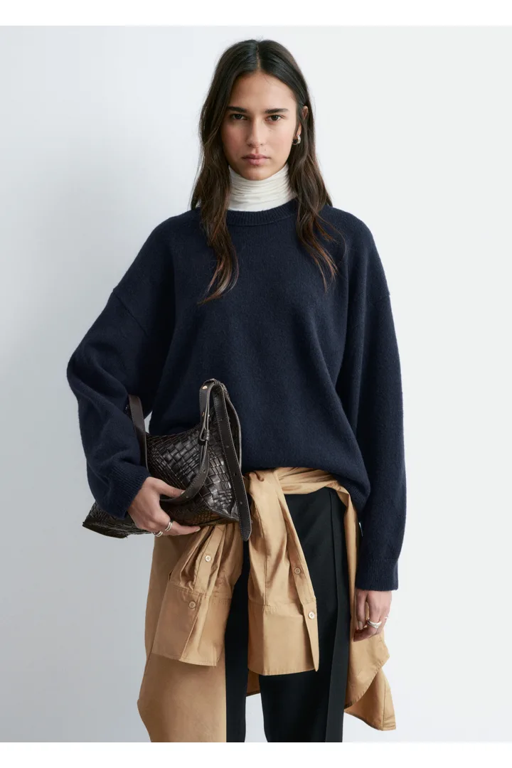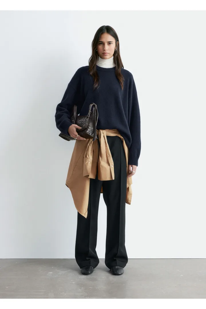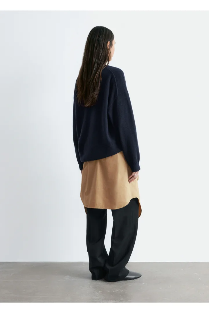 울 & 코튼 혼방 니트로 탄생한 스웨터예요. 오버사이즈 실루엣이 멋스러운 아이템으로 링크 스티치로 둘러 장식된 립 트리밍의 라운드 네크라인, 드롭 숄더, 롱 슬리브가 특징이랍니다. 커프스와 헴라인에 립 디테일이 자리해 있으며, 뒷면의 살짝 더 긴 헴라인으로 여유로운 쉐입을 연출해주어요. 넉넉한 핏이 특징인 제품으로, 몸에 더 맞게 정돈된 실루엣으로 연출하시려면 한 사이즈 작게 주문하시는 것을 추천드립니다.