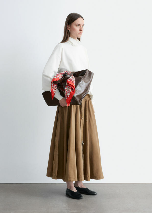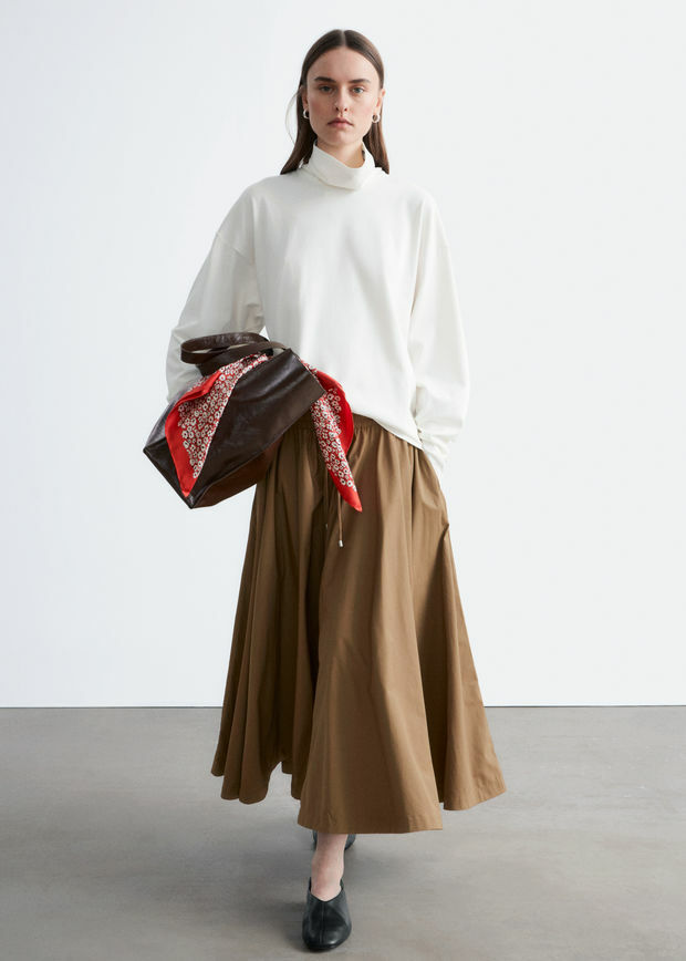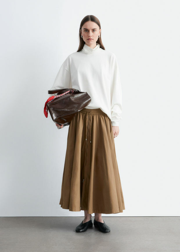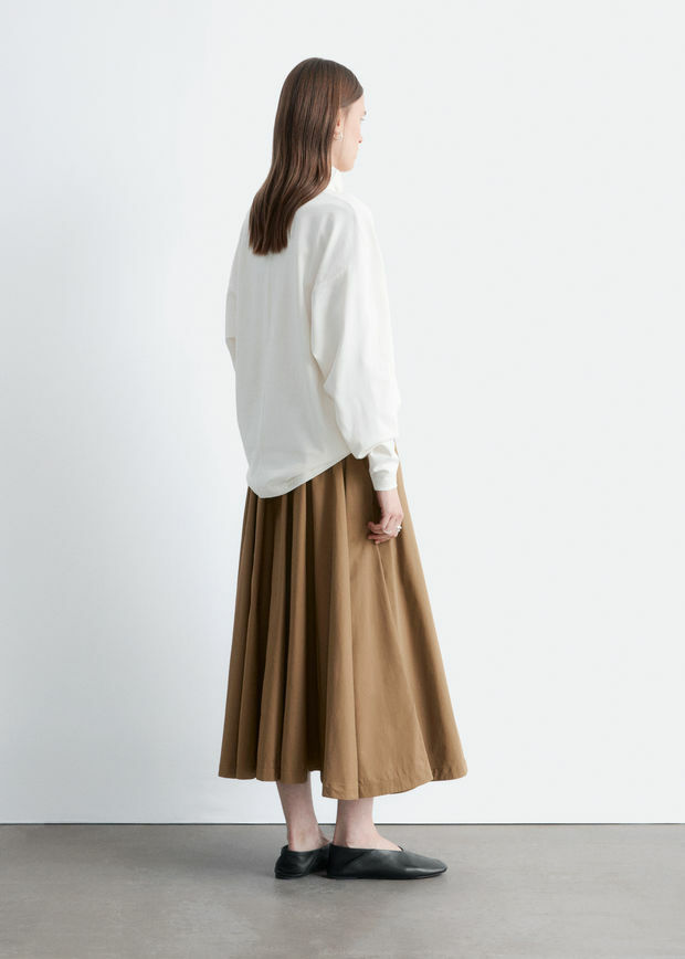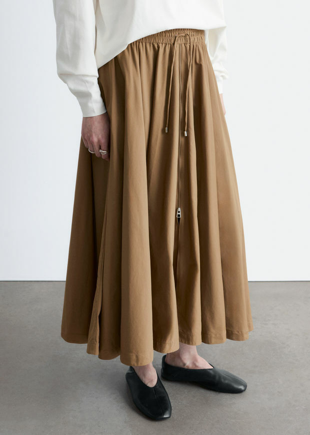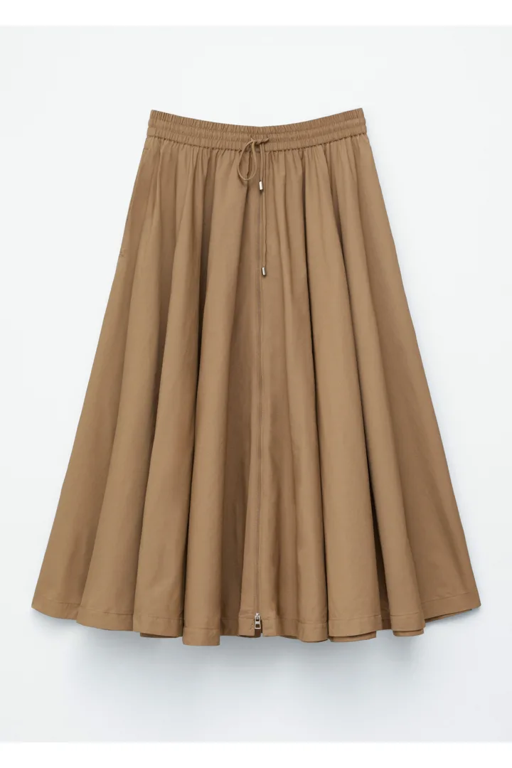 산뜻한 나일론 원단 소재의 미드 기장 스커트예요. 허리의 드로스트링과 볼륨감 있는 A 라인 쉐입, 부드러운 플리츠가 특징이에요. 측면 솔기의 포켓, 그리고 앞면의 은은한 하프 지퍼가 자리해 있답니다.