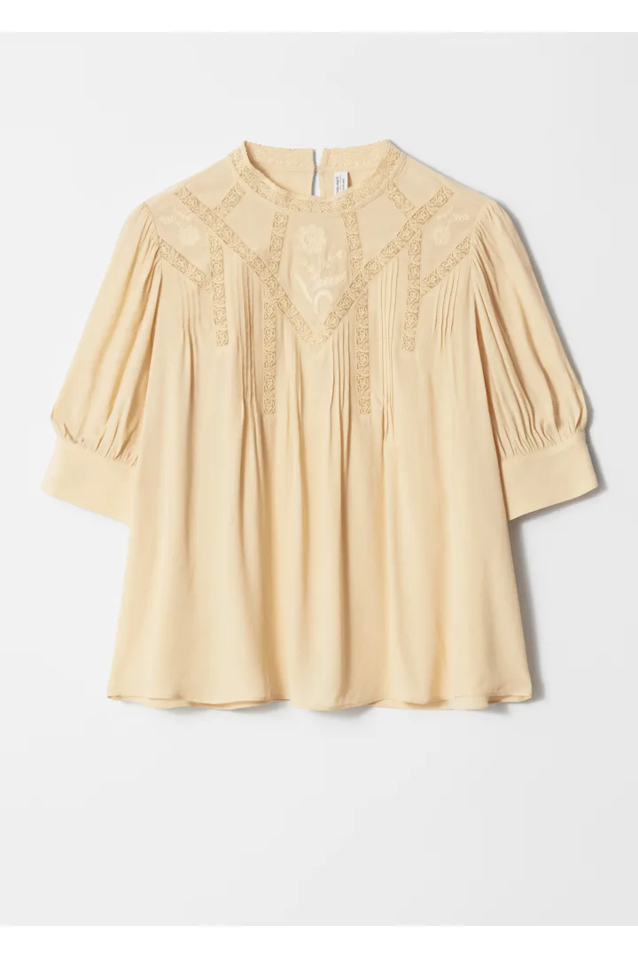 여유로운 실루엣의 블라우스예요. 드레이프 주름과 가슴의 섬세한 레이스 디테일이 매력적이며 클래식한 밴드 카라, 쇼트 슬리브와 버튼 커프스, 네크라인의 키홀 단추가 특징이랍니다.
