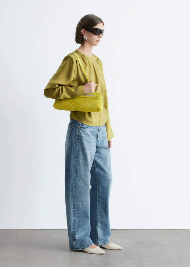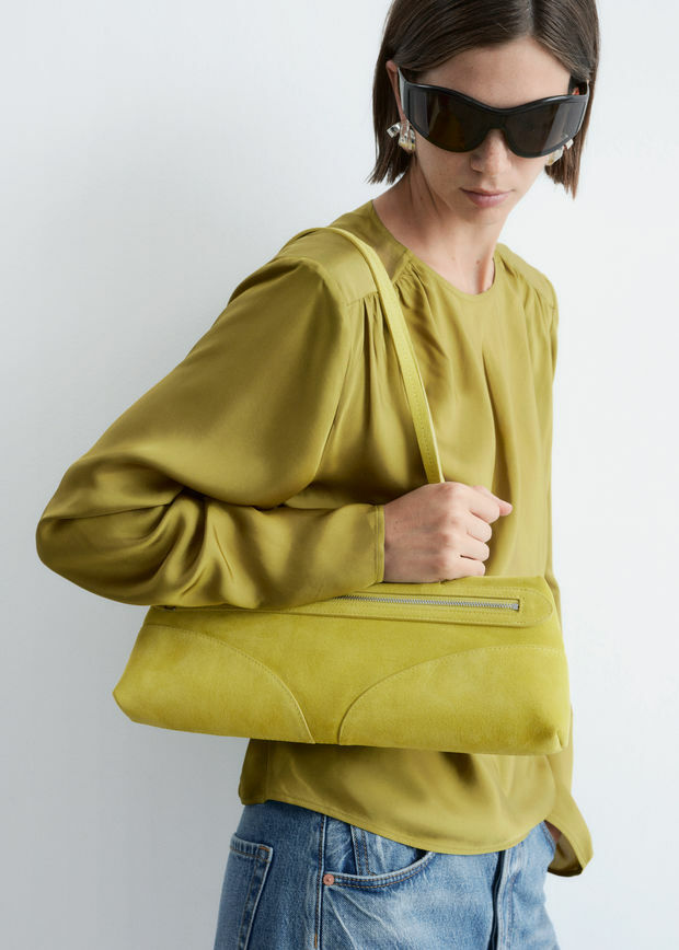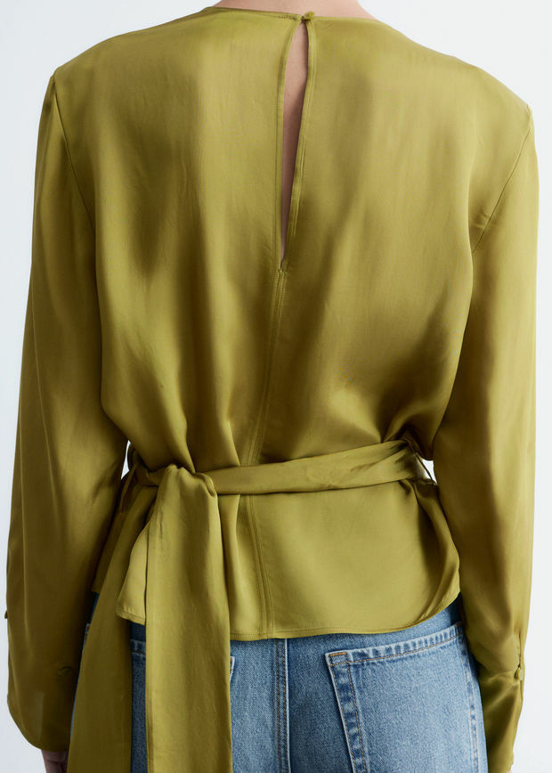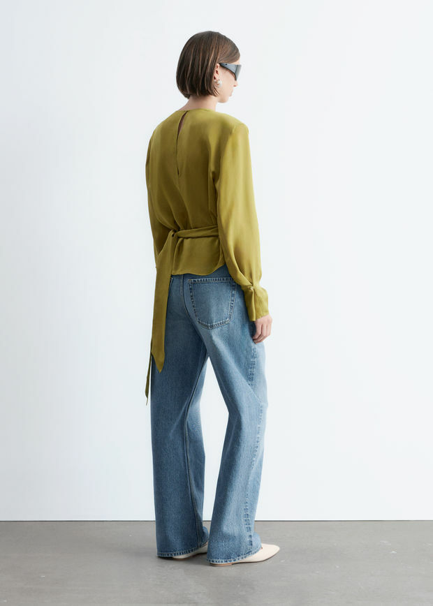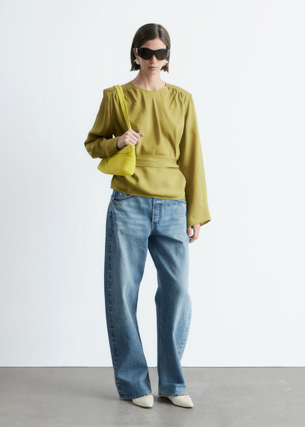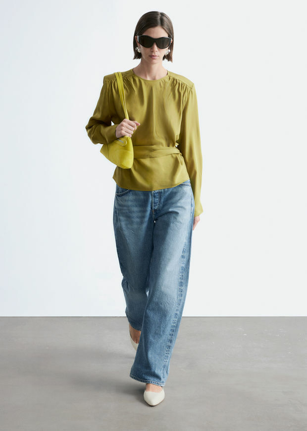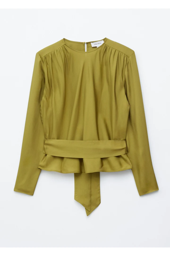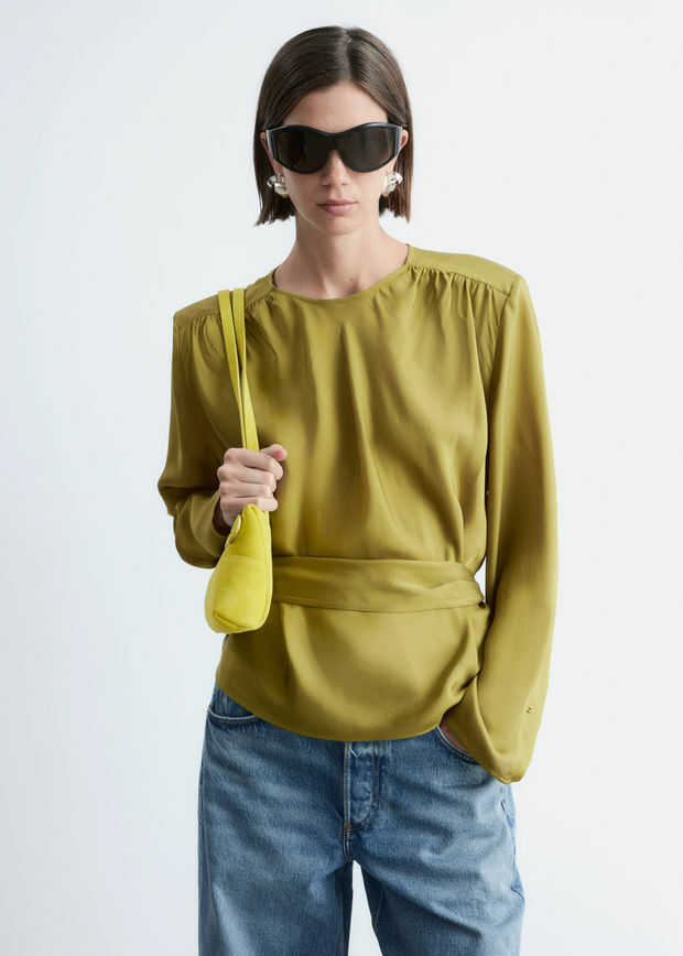가벼운 트윌 소재의 블라우스예요. 우아하게 흐르는 실루엣, 구조감을 더하는 부드러운 숄더 패드, 허리를 강조하는 와이드 패브릭 타이 벨트, 텍스처가 느껴지는 은은한 셔링, 뒷면의 오픈 슬릿과 네크라인 단추가 특징이랍니다.