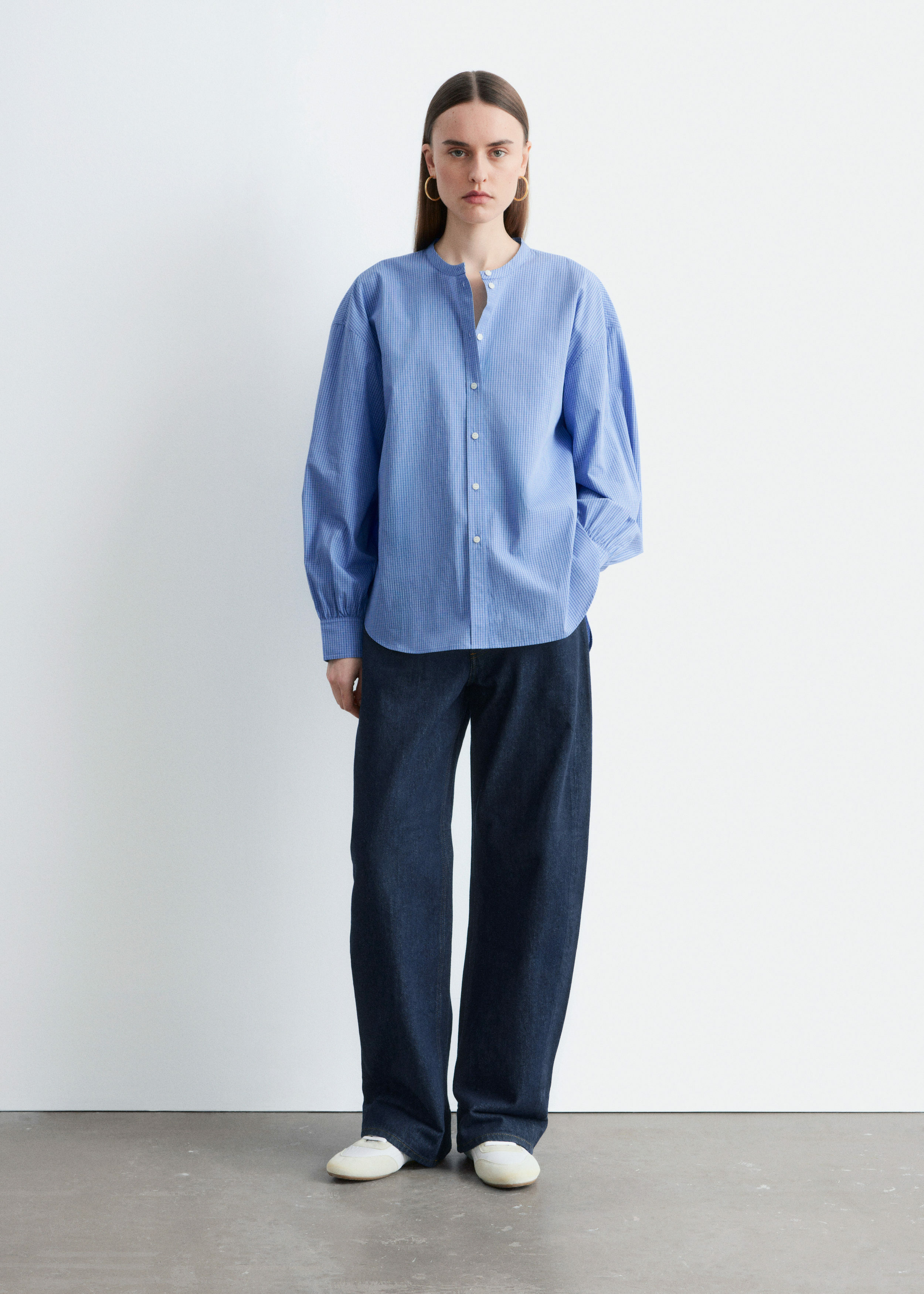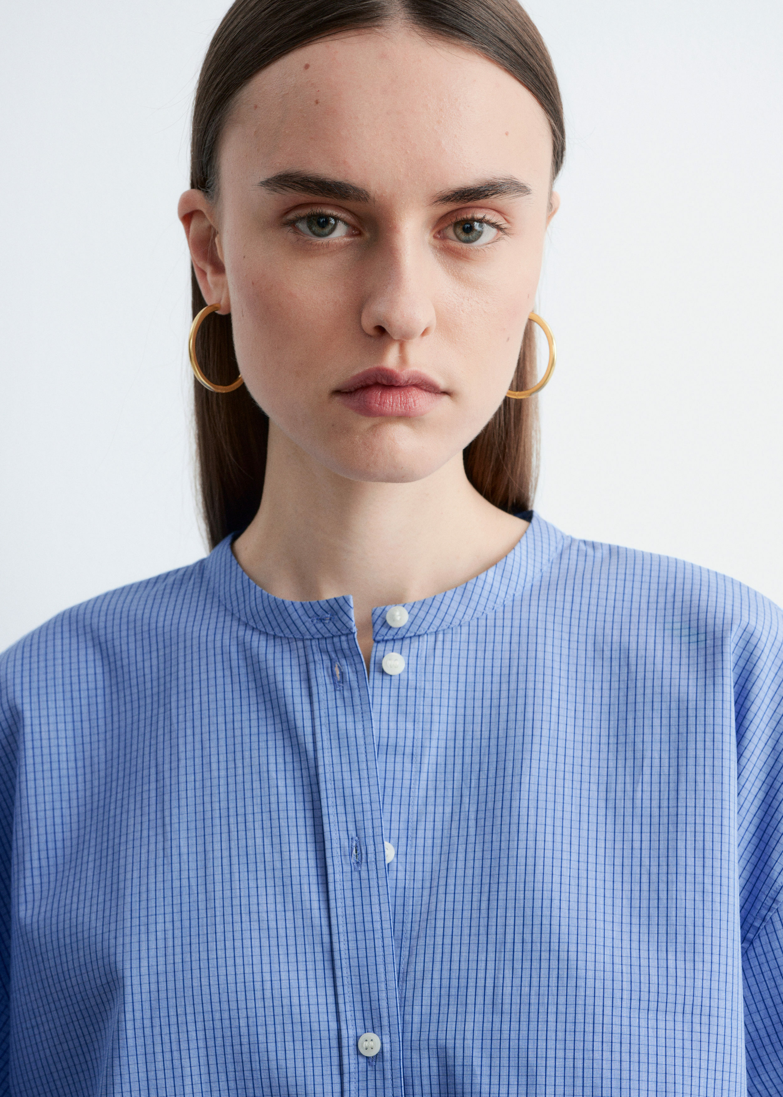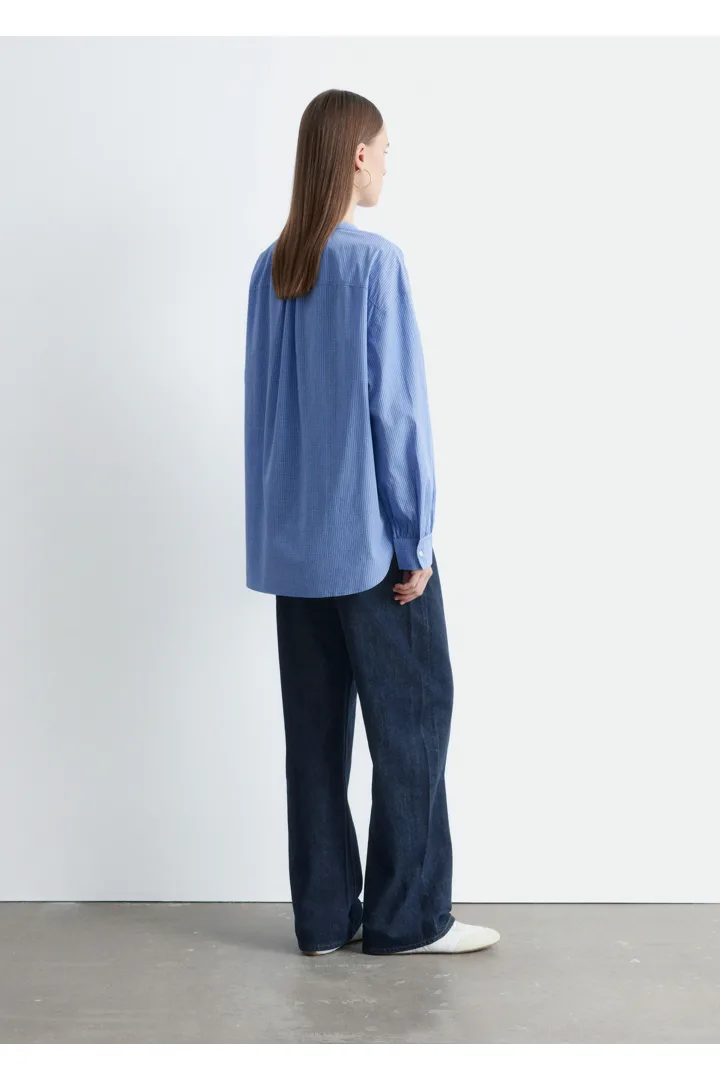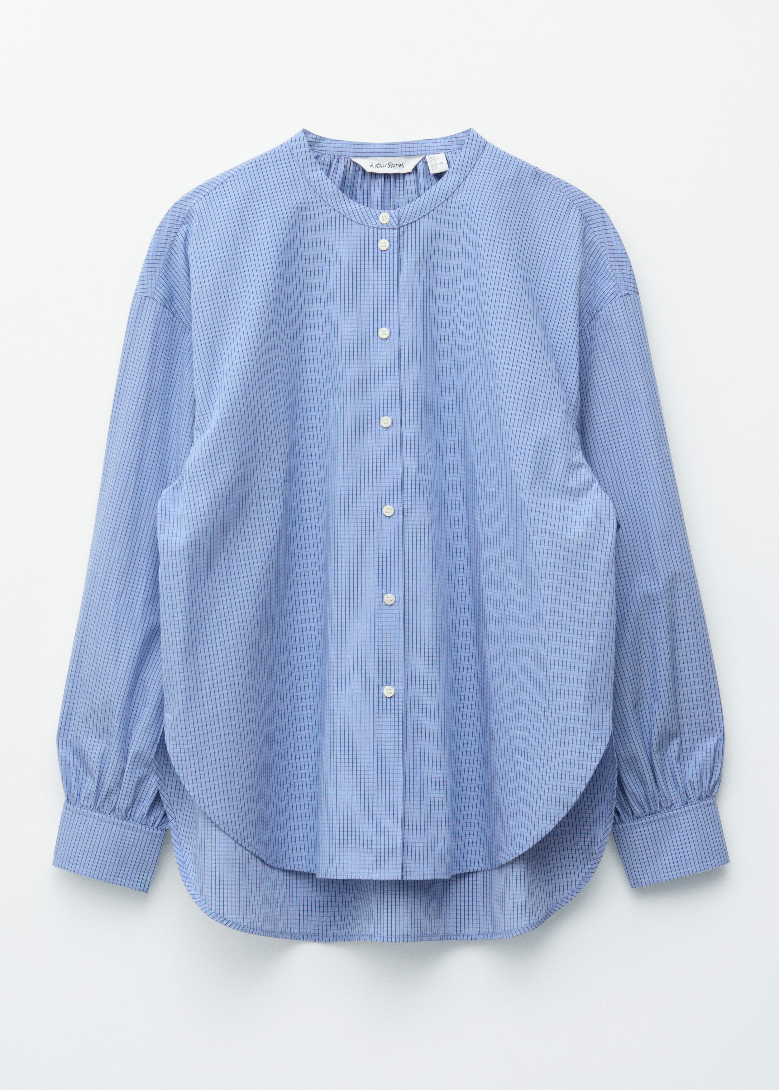 오버사이즈 실루엣의 코튼 셔츠예요. 밴드 칼라, 앞면의 단추, 드롭 숄더에서 이어지는 롱 슬리브와 버튼 커프스가 자리해 있어요. 네크라인 뒷면의 은은한 셔링, 뒷면부 요크, 그리고 뒷면이 더 긴 라운드 헴라인이 특징이에요.