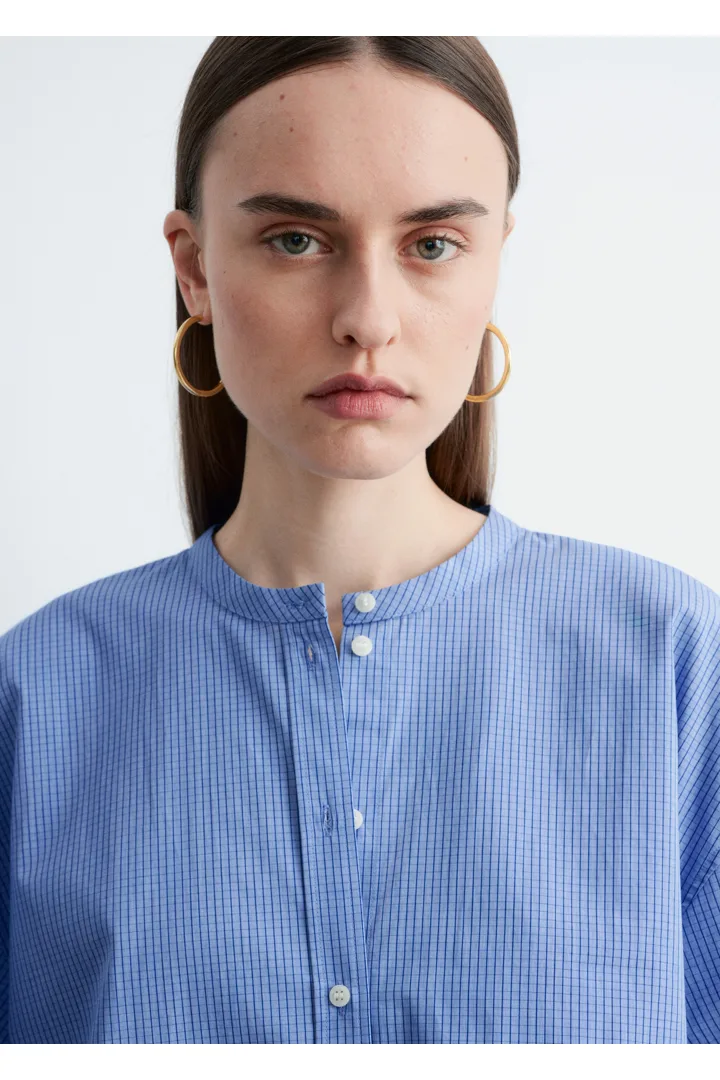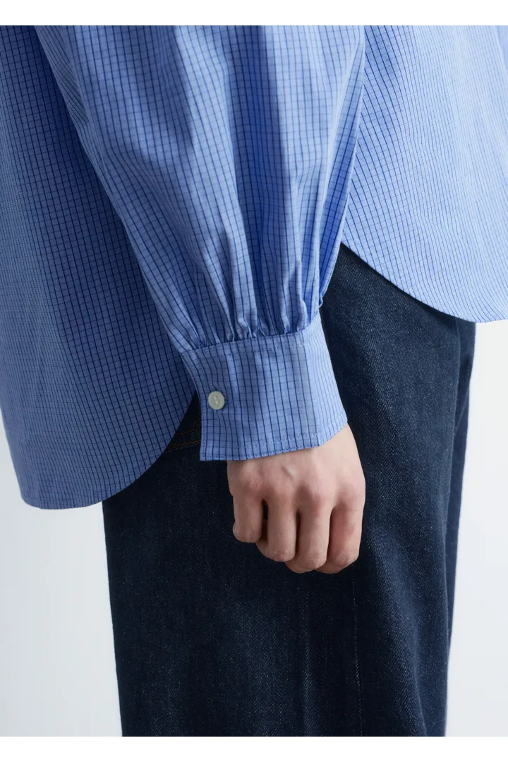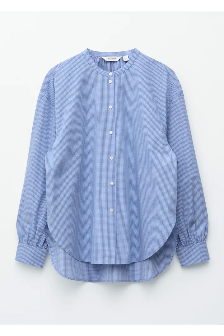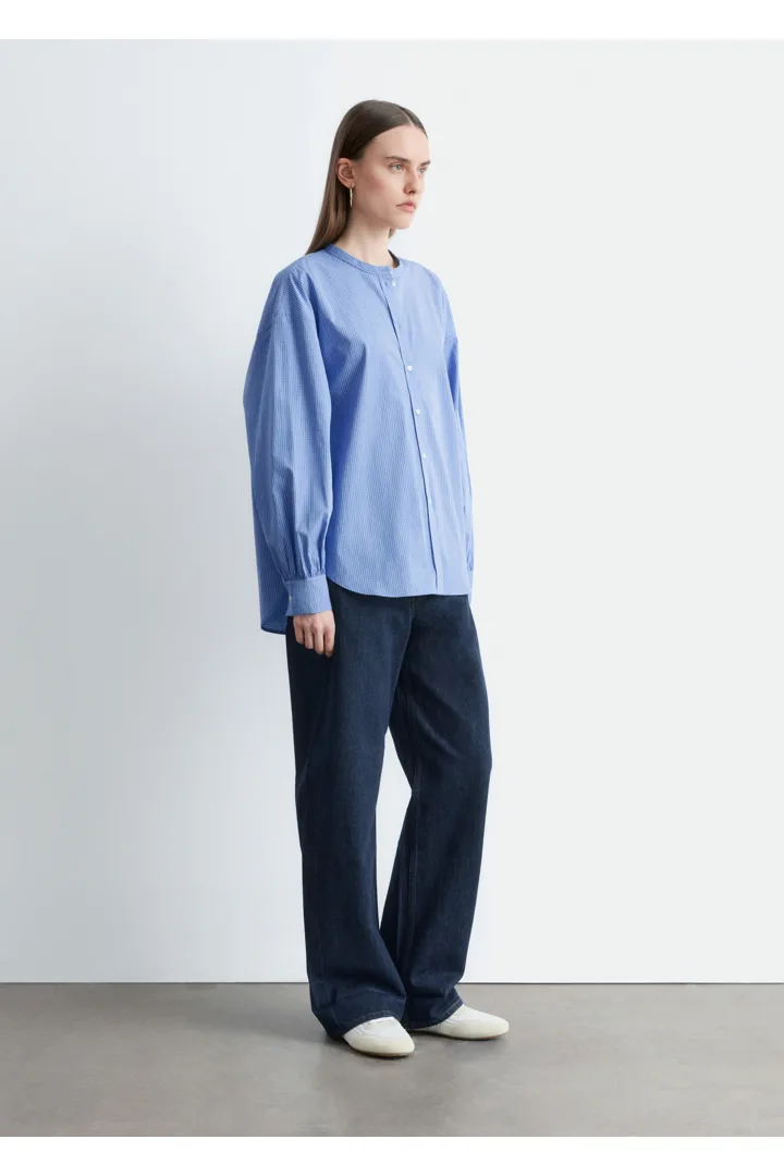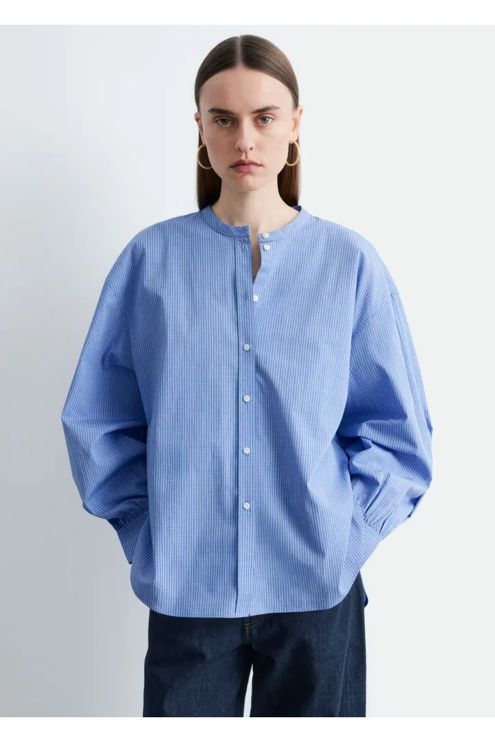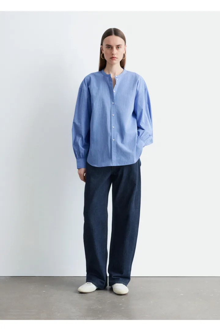 오버사이즈 실루엣의 코튼 셔츠예요. 밴드 칼라, 앞면의 단추, 드롭 숄더에서 이어지는 롱 슬리브와 버튼 커프스가 자리해 있어요. 네크라인 뒷면의 은은한 셔링, 뒷면부 요크, 그리고 뒷면이 더 긴 라운드 헴라인이 특징이에요.