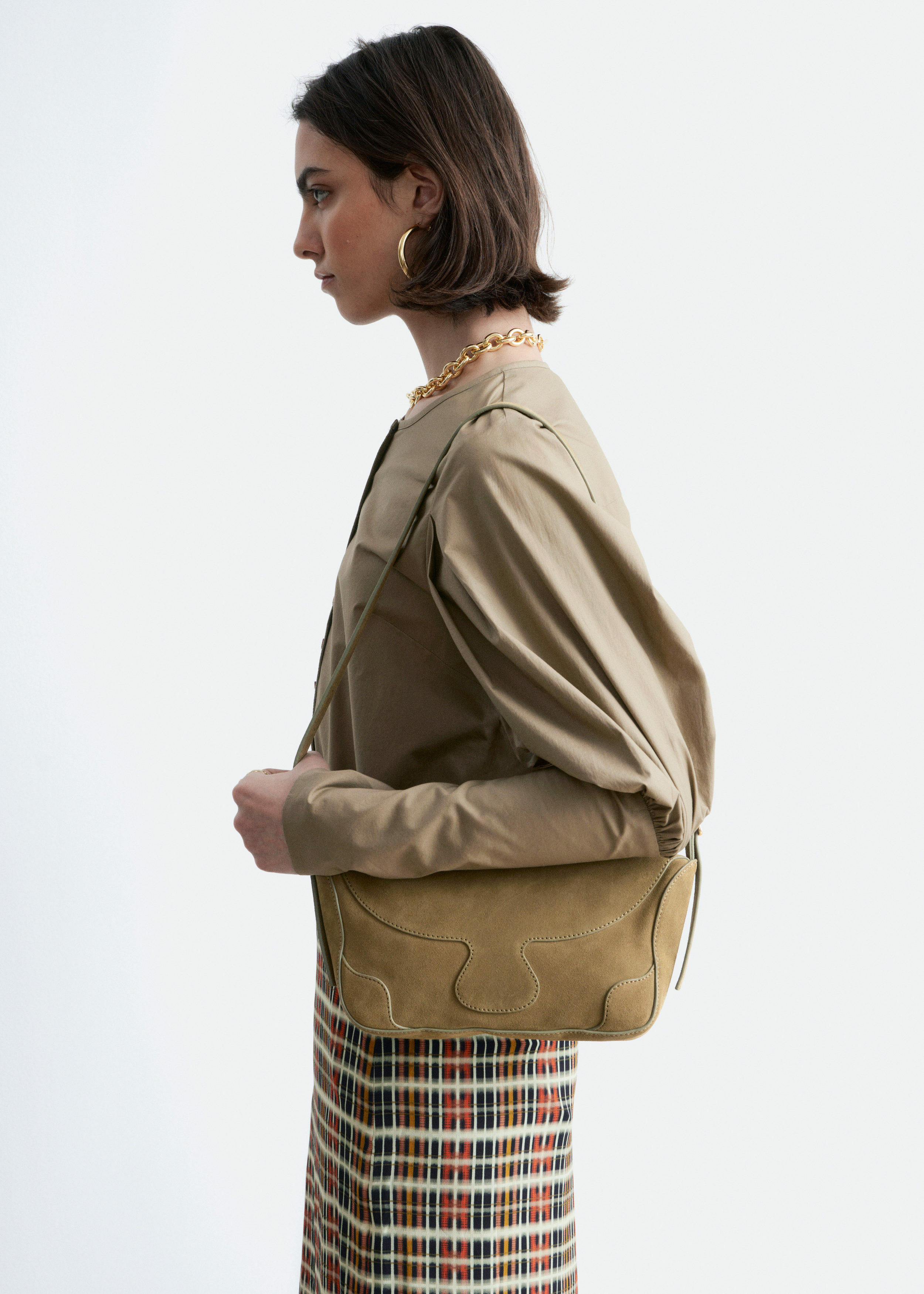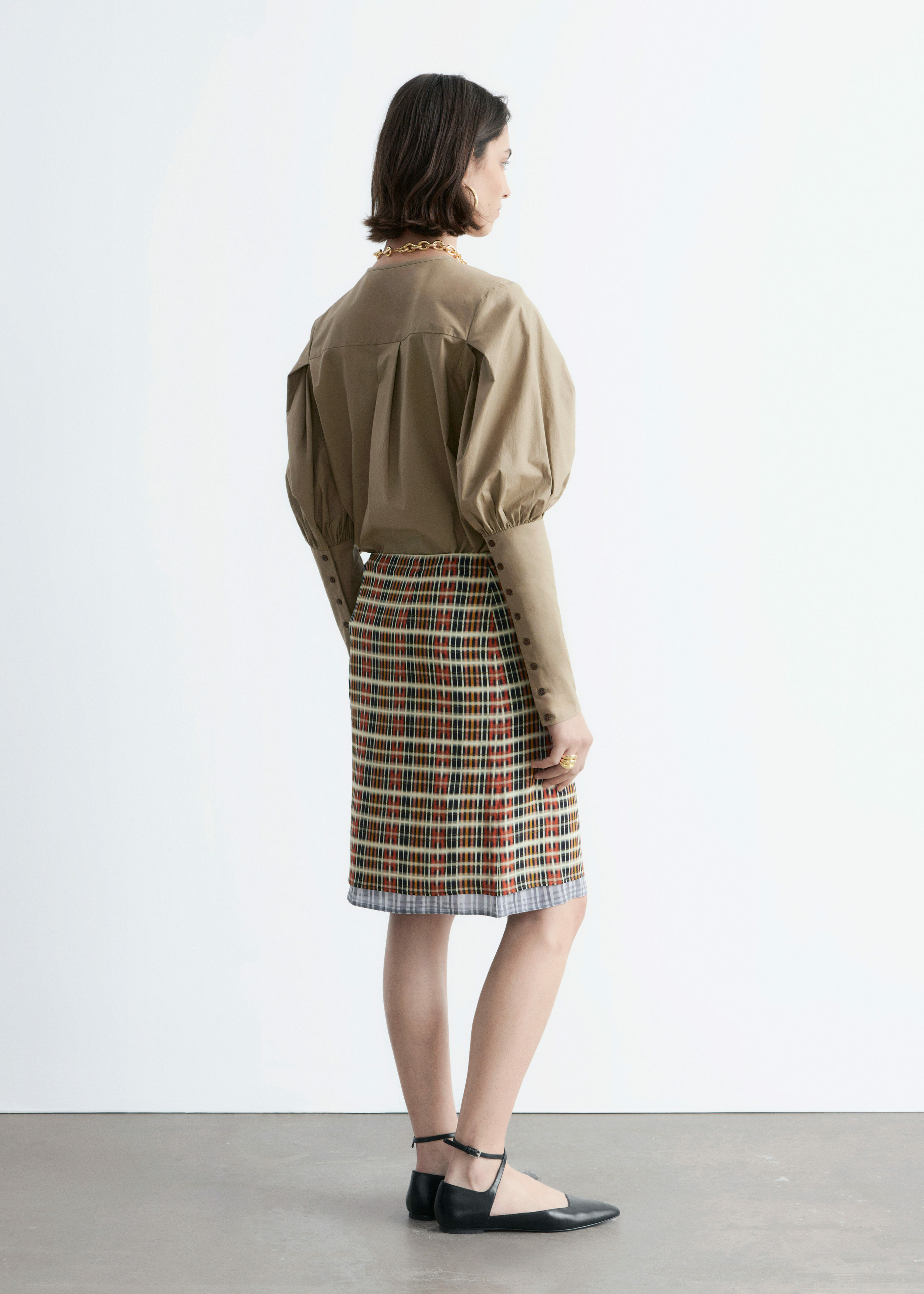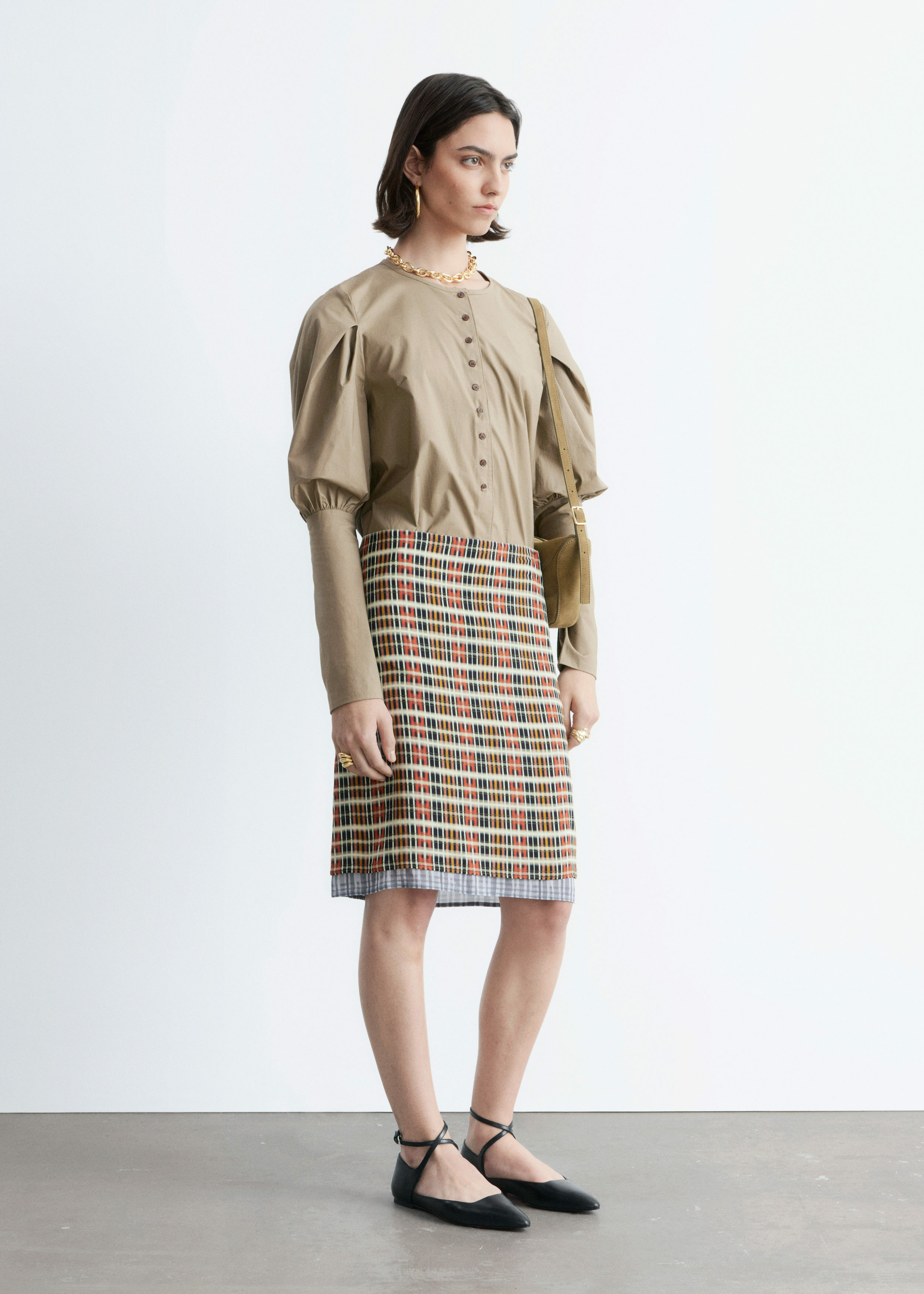 가볍고 바스락거리는 코튼 혼방 소재로 탄생한 블라우스예요. 구조적인 실루엣과 볼륨감 있는 퍼프 숄더가 돋보이는 제품이랍니다. 라운드 네크라인, 앞면의 하프 플래킷 단추, 라운드 헴라인이 특징이며, 핏 되는 롱 커프스의 뒷면에는 단추가 자리해 있어요.