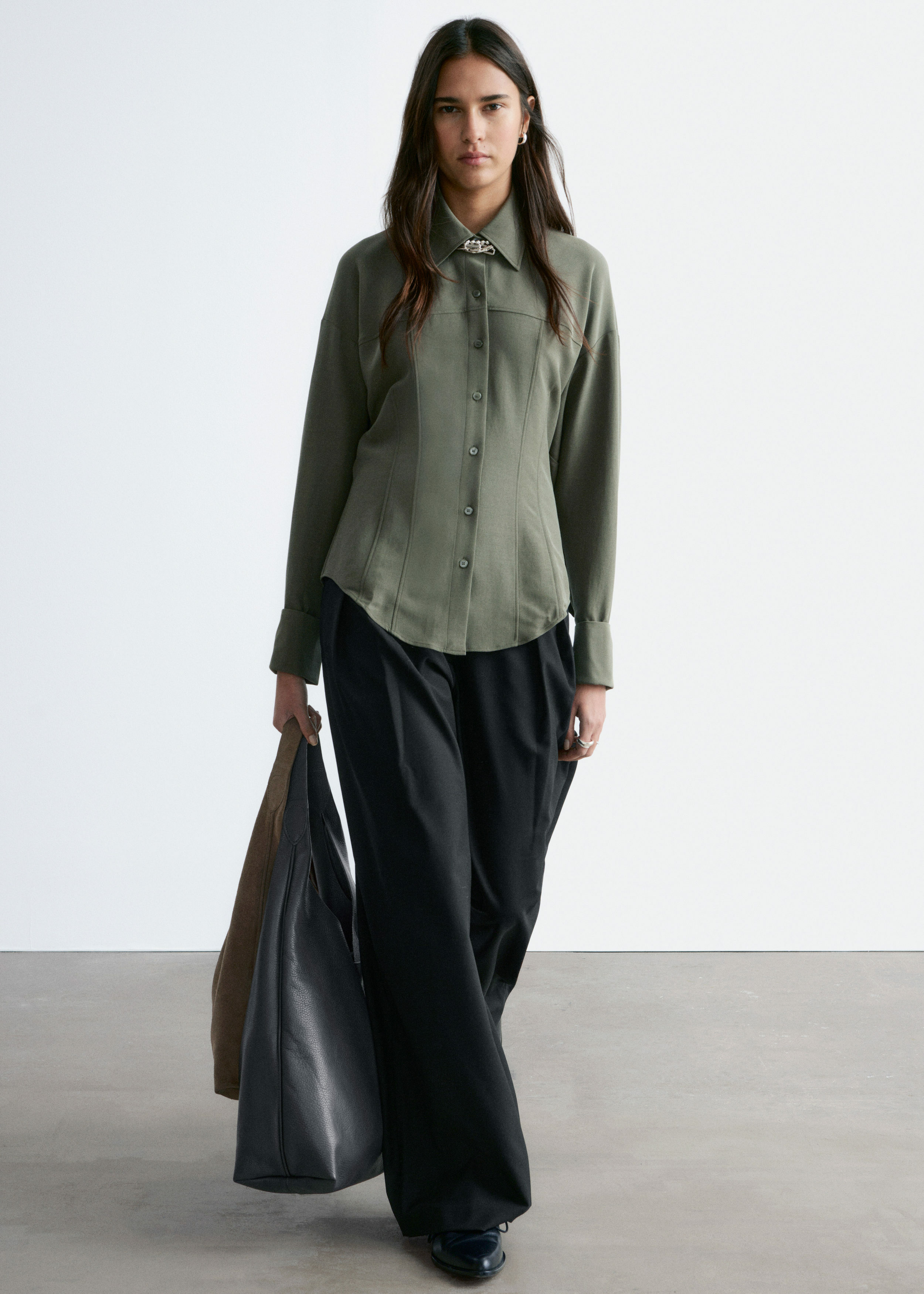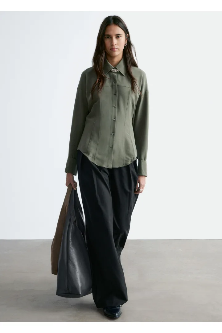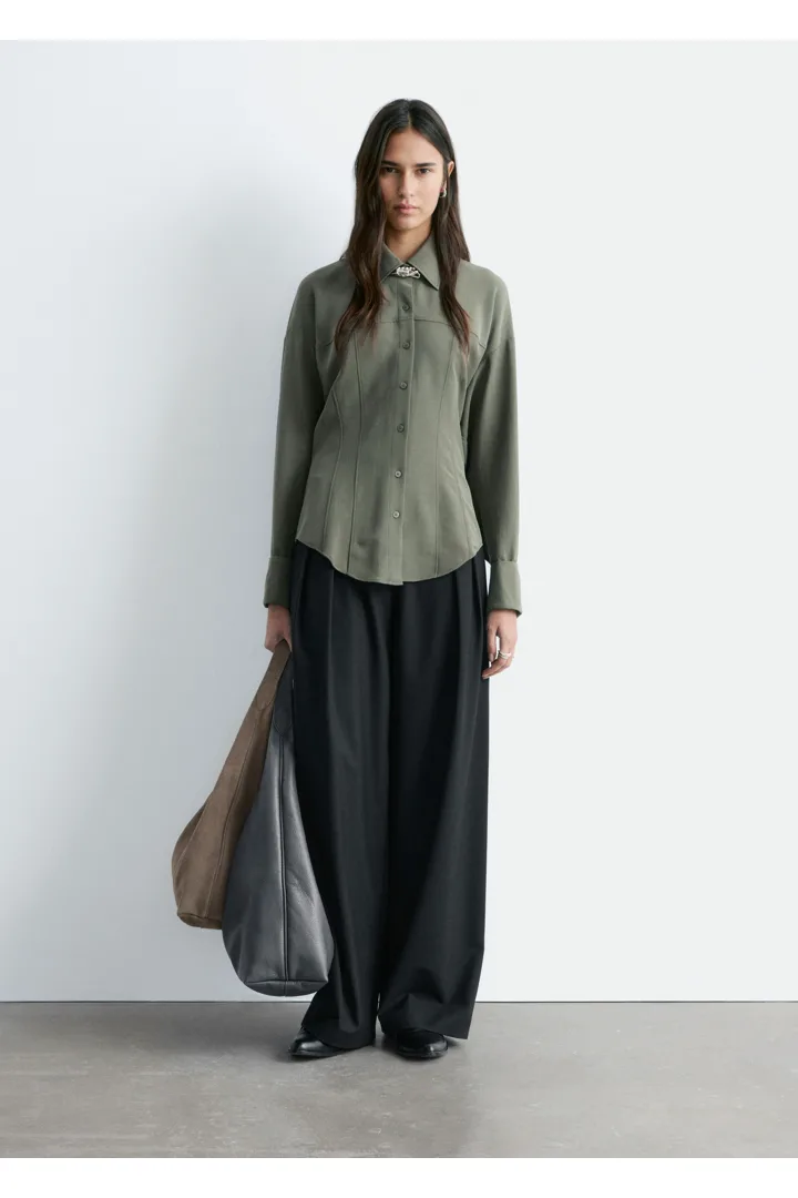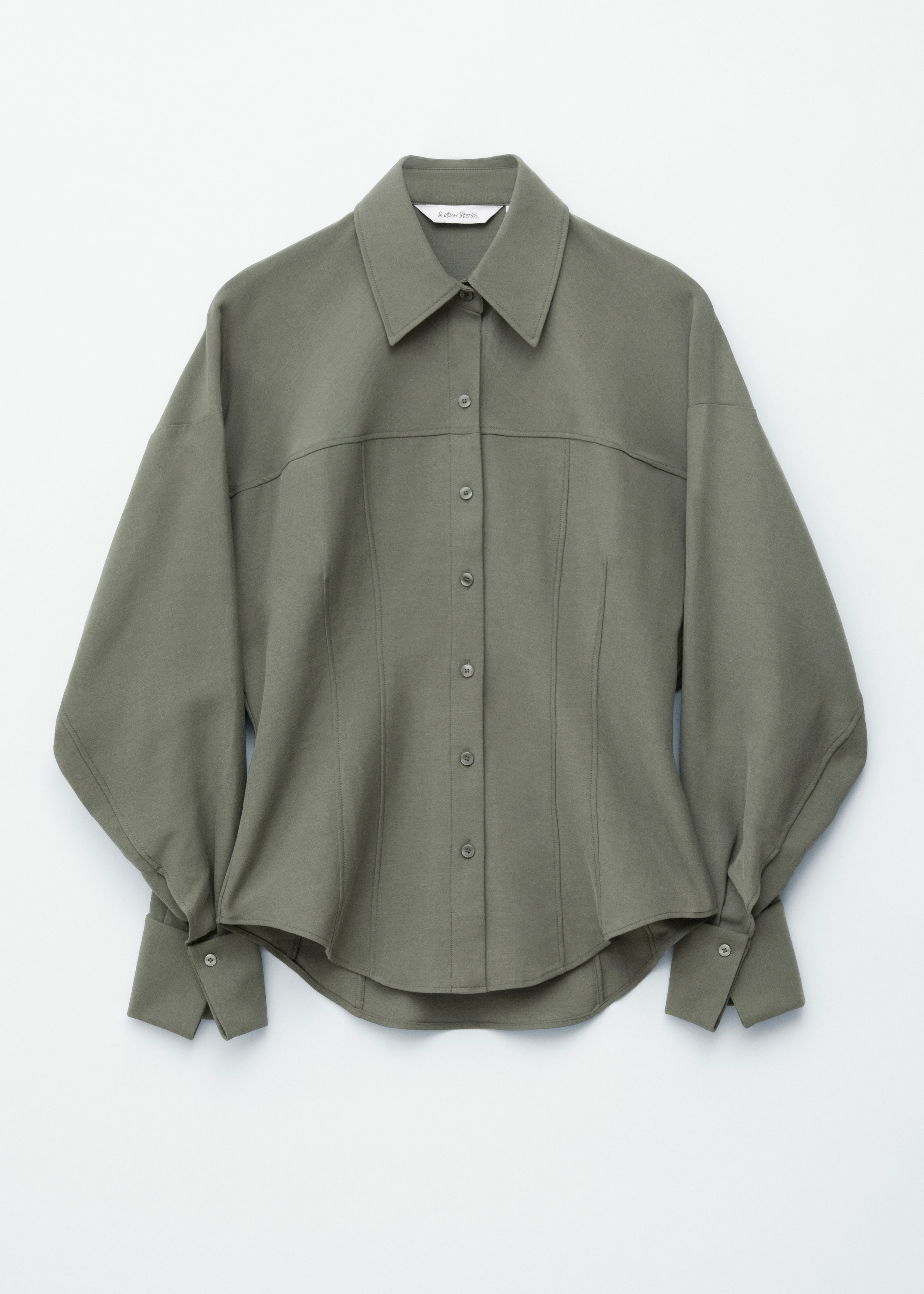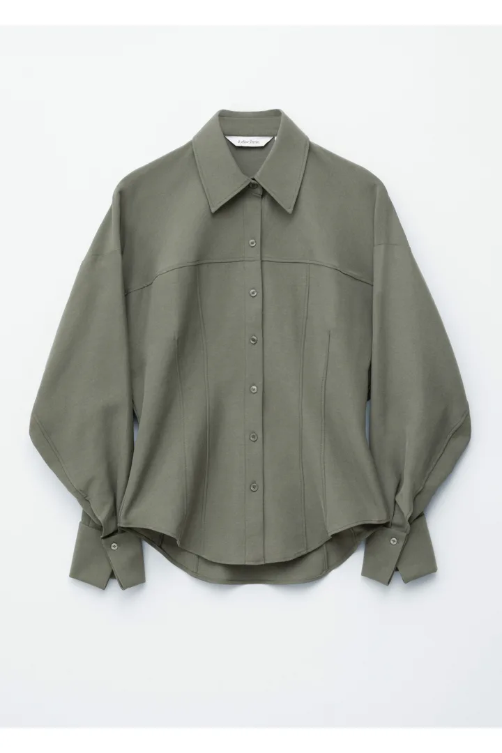 구조적인 감각의 셔츠예요. 테이퍼드 웨이스트, 롱 벌룬 슬리브, 그리고 버튼 셔링 커프스가 특징이에요. 포인트 카라, 앞면의 단추, 드롭 숄더, 라운드 헴라인, 탑스티치 커트 라인 솔기가 자리해 있답니다.