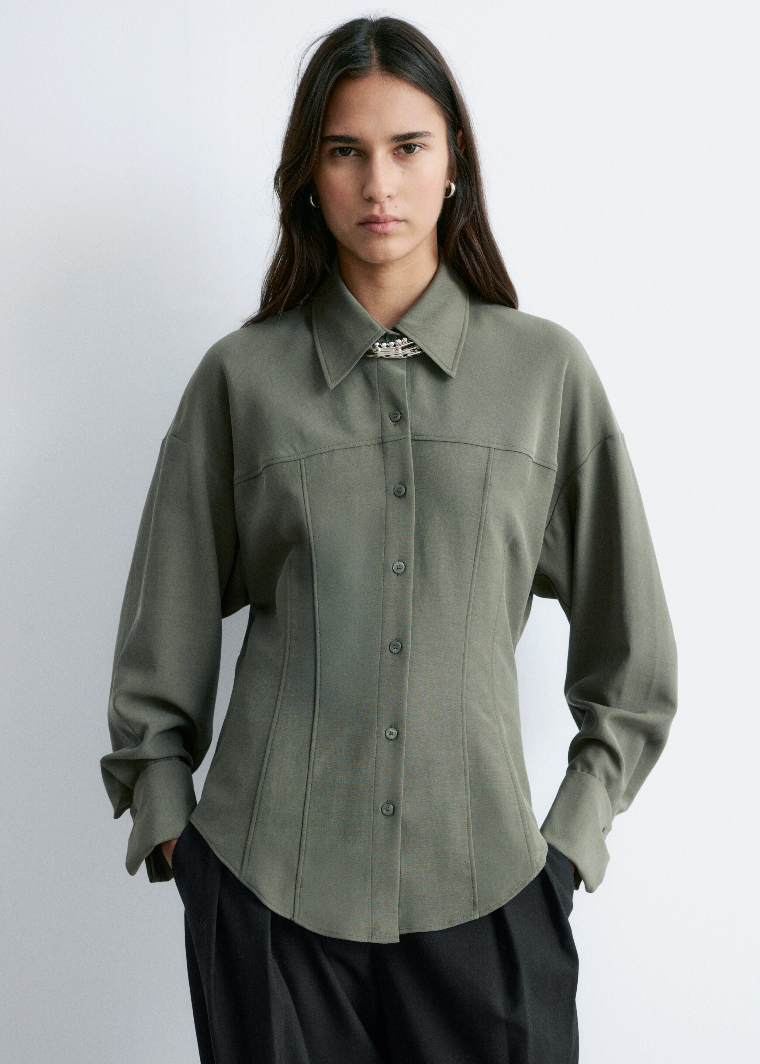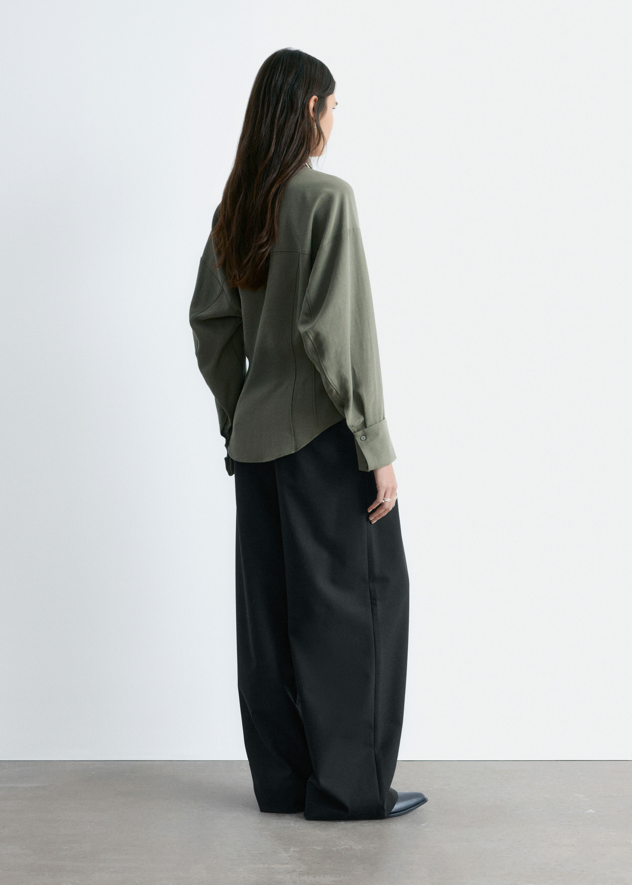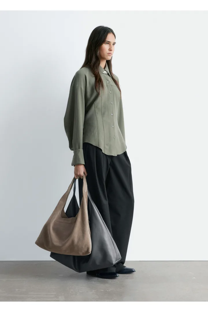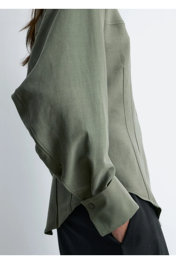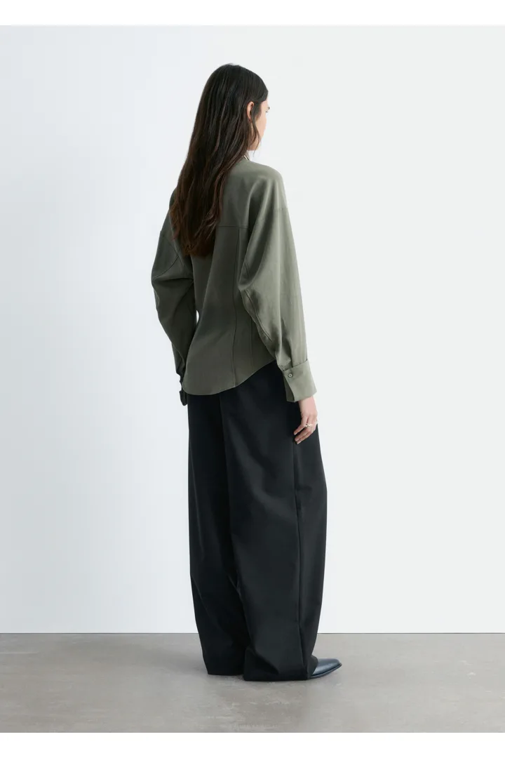구조적인 감각의 셔츠예요. 테이퍼드 웨이스트, 롱 벌룬 슬리브, 그리고 버튼 셔링 커프스가 특징이에요. 포인트 카라, 앞면의 단추, 드롭 숄더, 라운드 헴라인, 탑스티치 커트 라인 솔기가 자리해 있답니다.