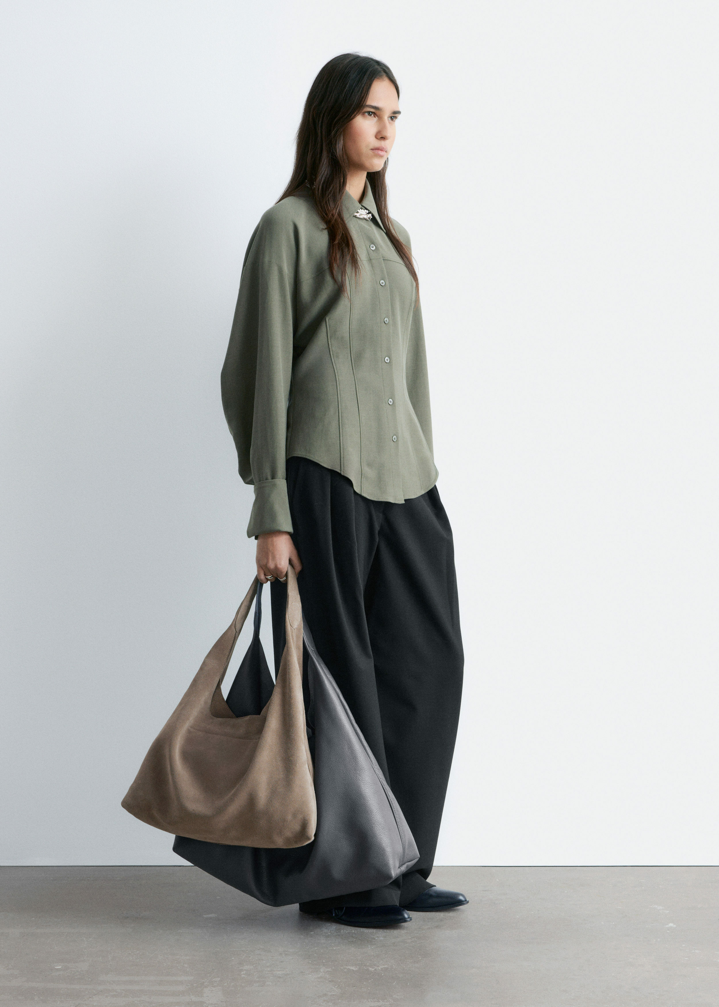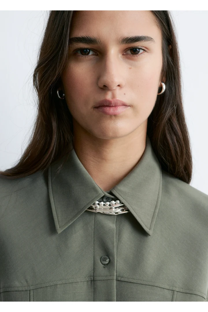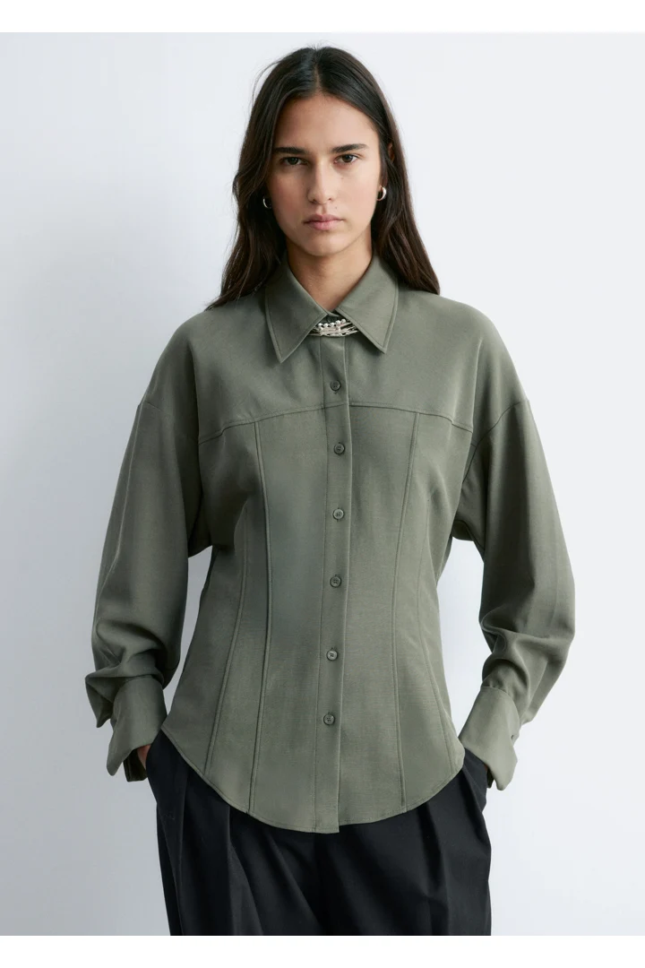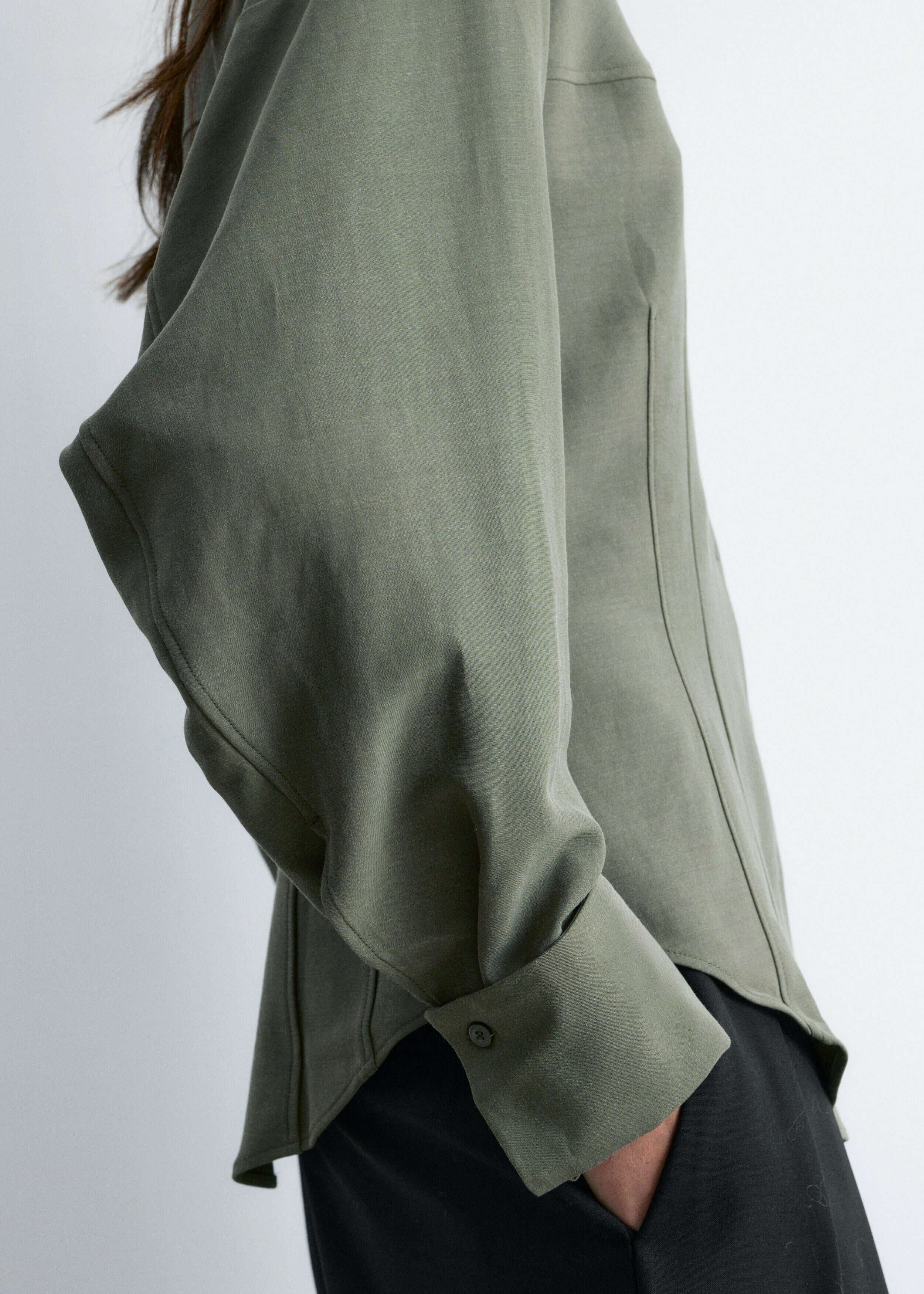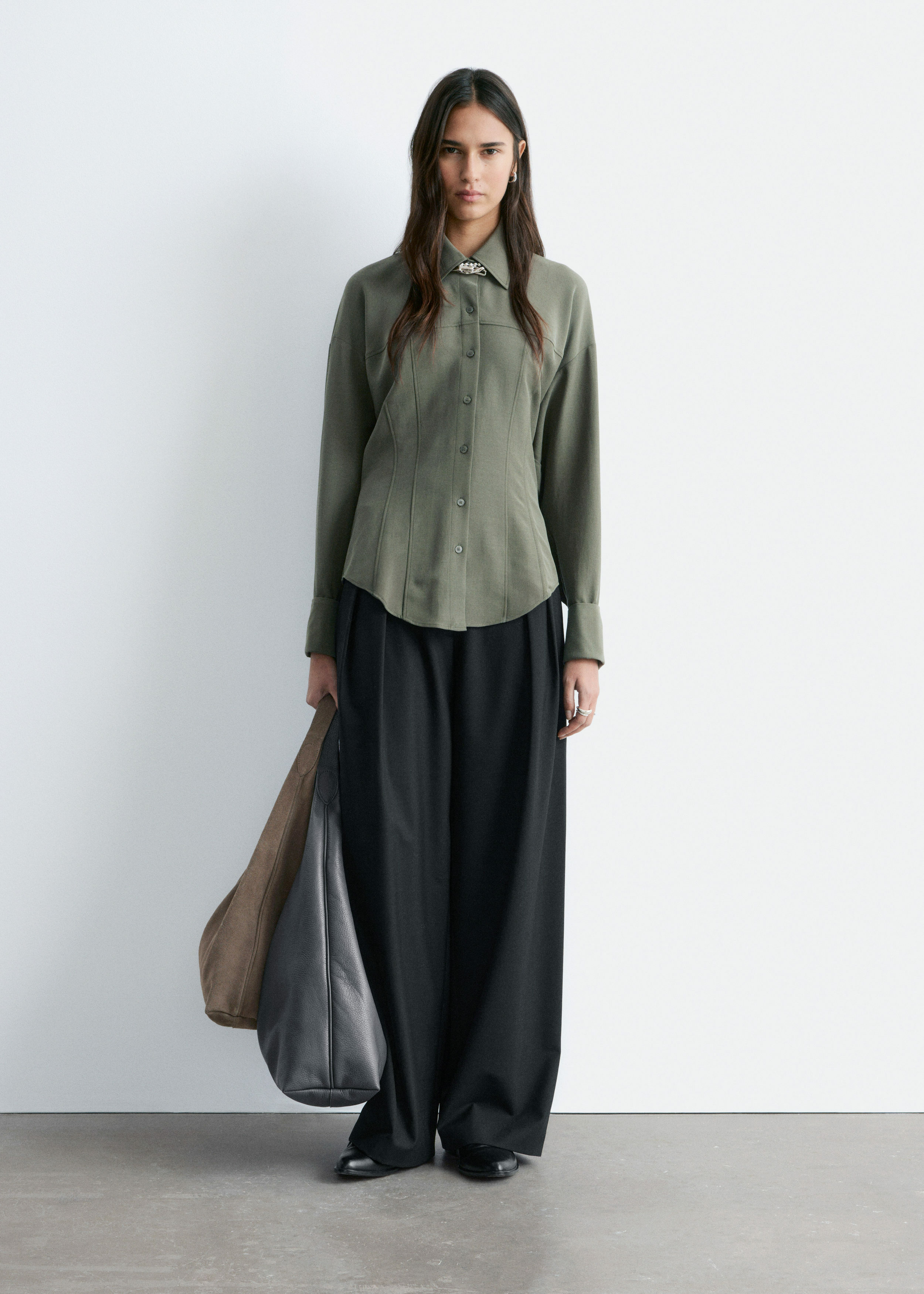 구조적인 감각의 셔츠예요. 테이퍼드 웨이스트, 롱 벌룬 슬리브, 그리고 버튼 셔링 커프스가 특징이에요. 포인트 카라, 앞면의 단추, 드롭 숄더, 라운드 헴라인, 탑스티치 커트 라인 솔기가 자리해 있답니다.