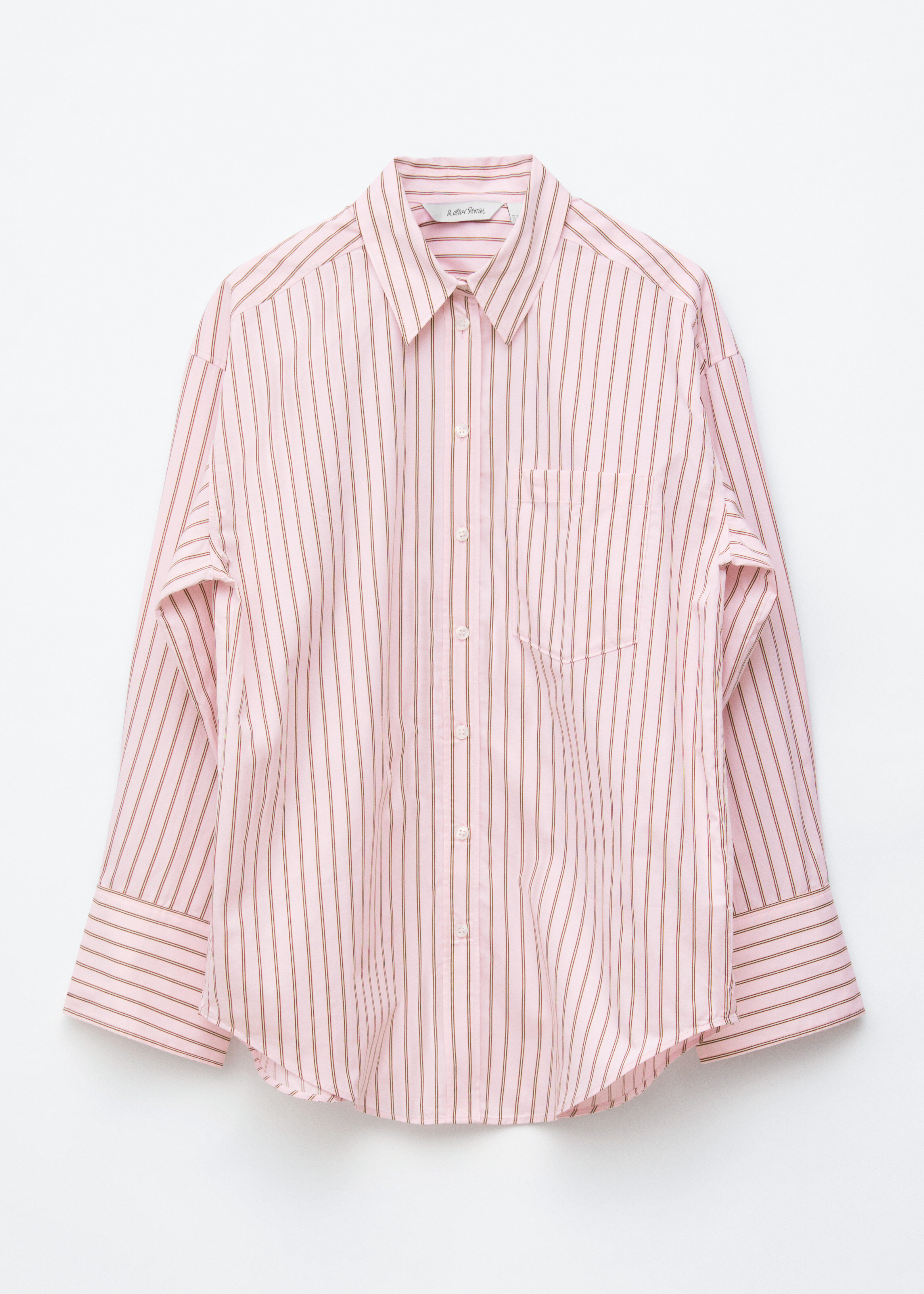 가벼운 코튼 소재의 셔츠예요. 루즈한 실루엣, 탑스티치 솔기, 버튼 커프스, 가슴의 패치 포켓이 특징이에요. 앞면에는 토널 컬러의 단추가 자리해 있답니다.