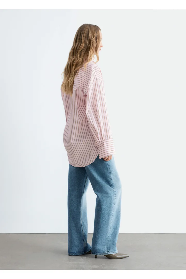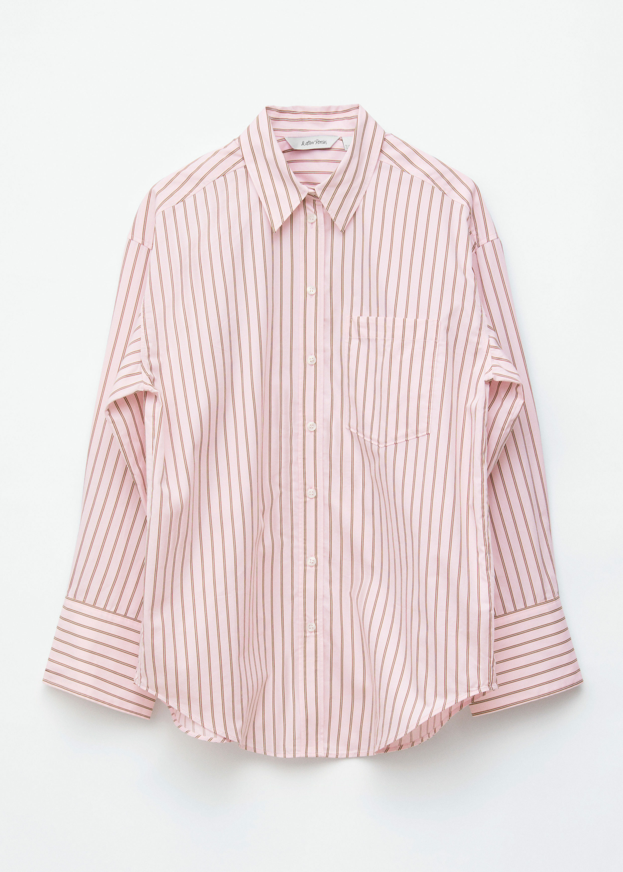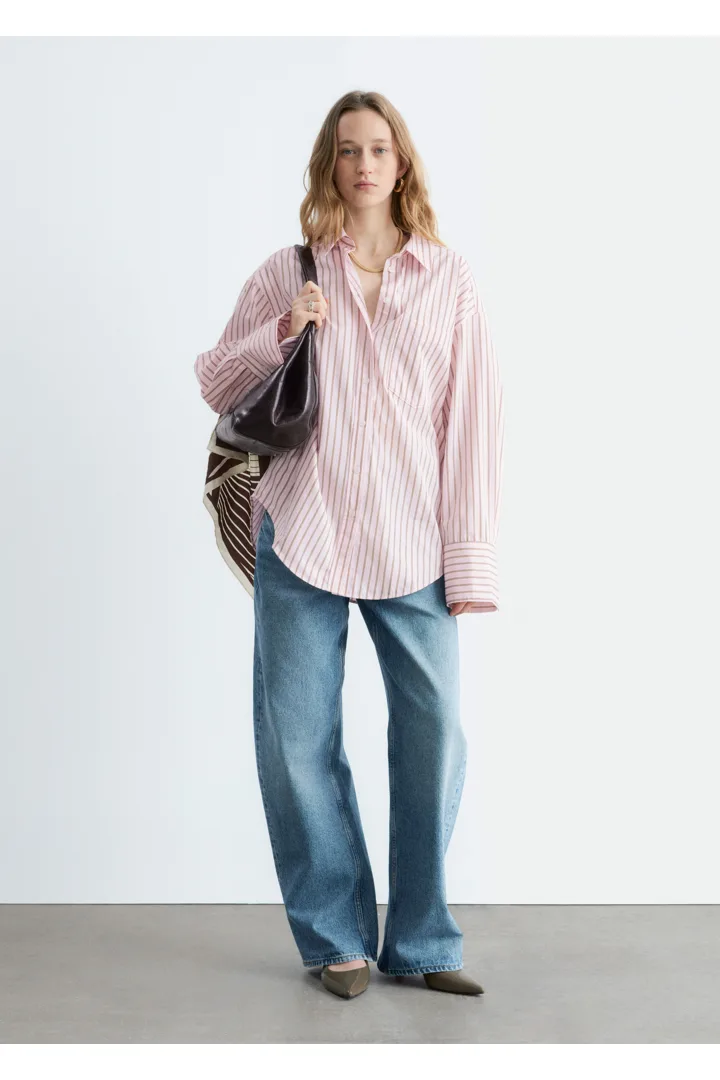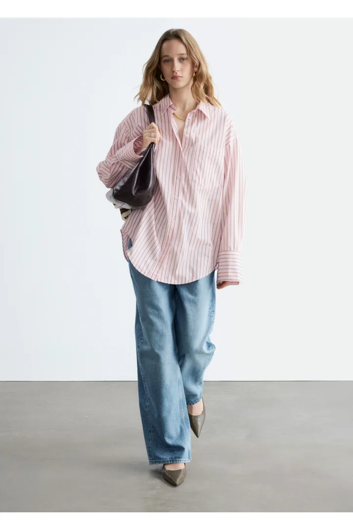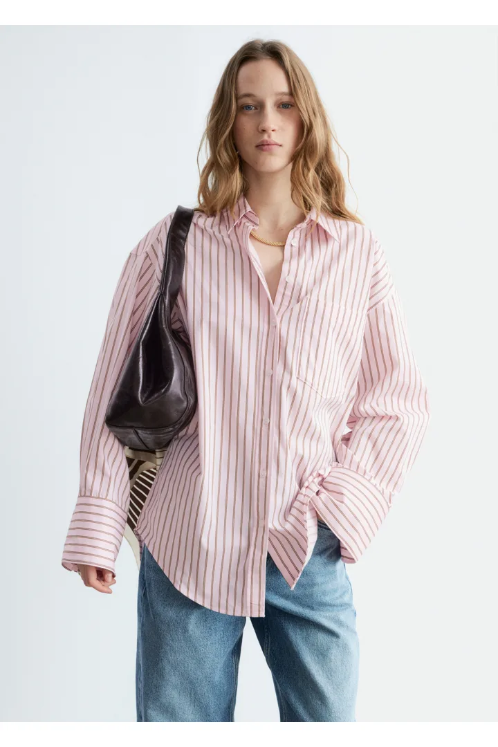 가벼운 코튼 소재의 셔츠예요. 루즈한 실루엣, 탑스티치 솔기, 버튼 커프스, 가슴의 패치 포켓이 특징이에요. 앞면에는 토널 컬러의 단추가 자리해 있답니다.