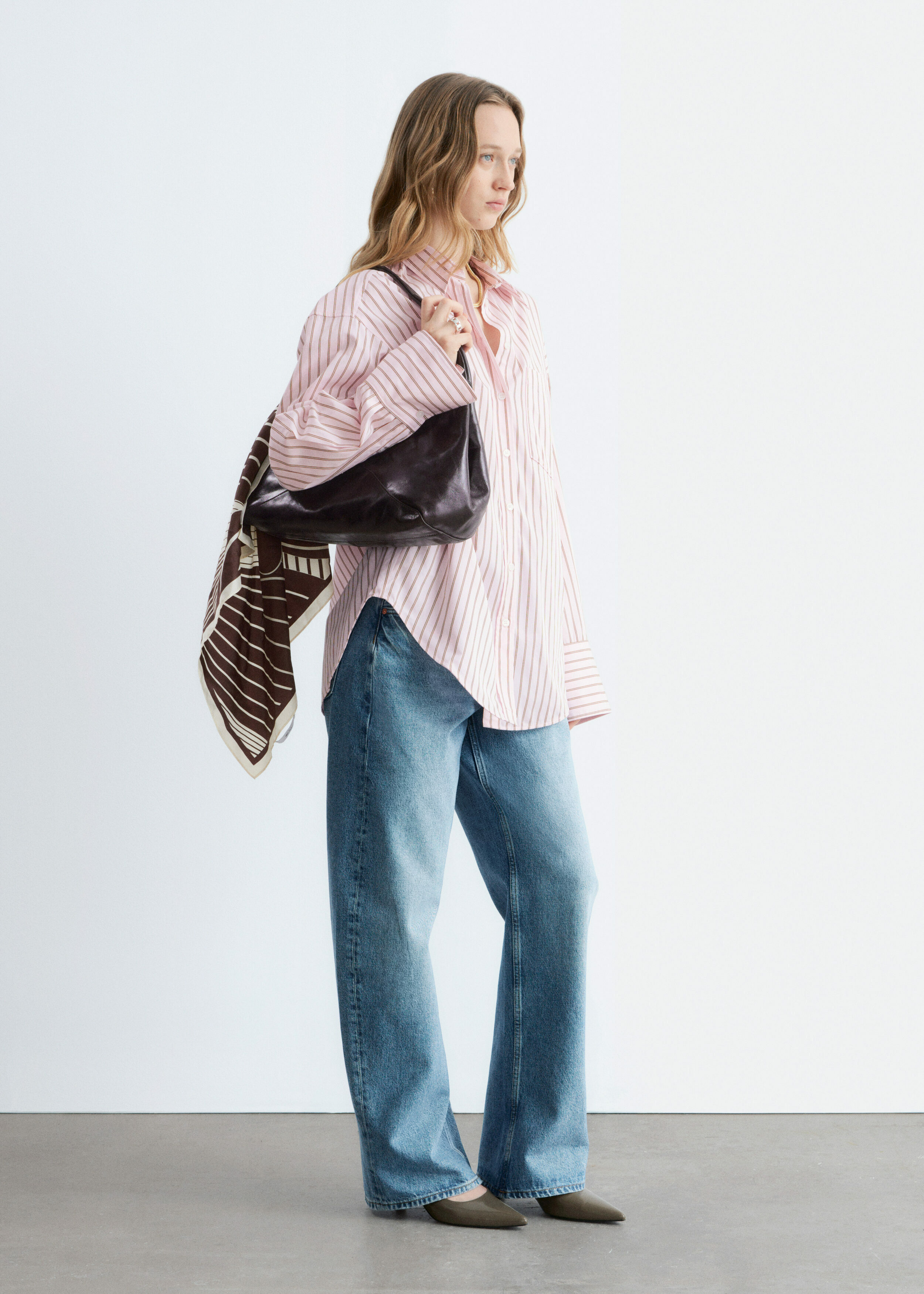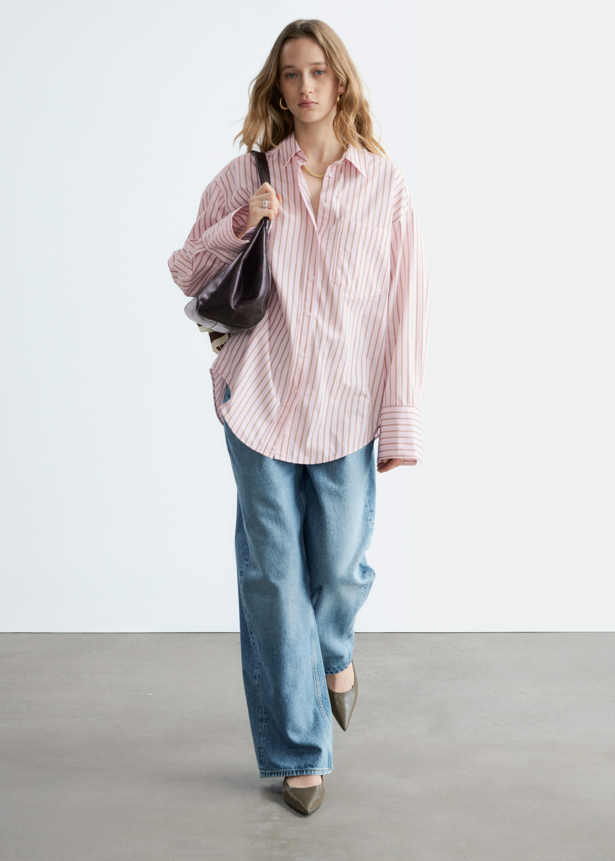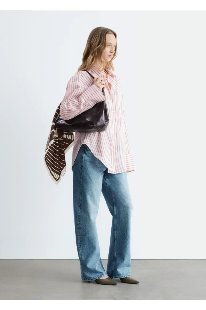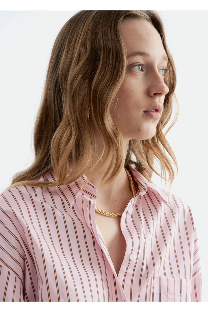 가벼운 코튼 소재의 셔츠예요. 루즈한 실루엣, 탑스티치 솔기, 버튼 커프스, 가슴의 패치 포켓이 특징이에요. 앞면에는 토널 컬러의 단추가 자리해 있답니다.