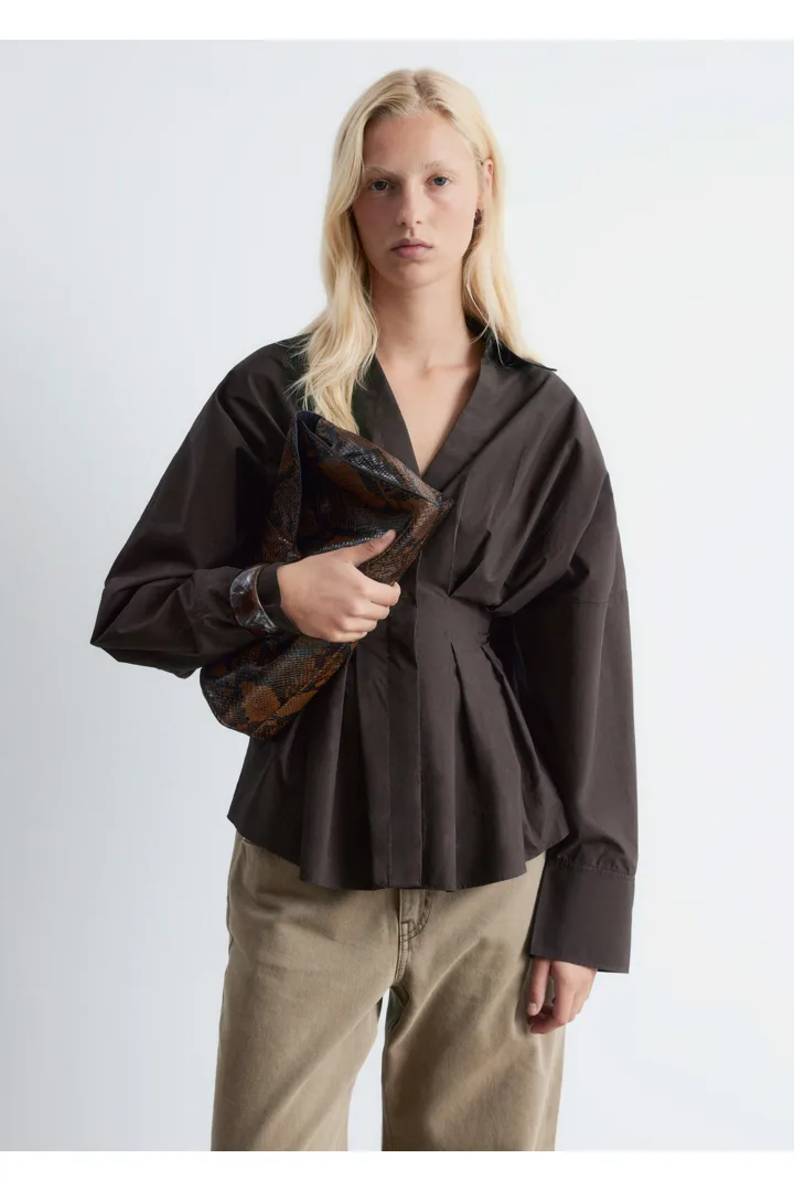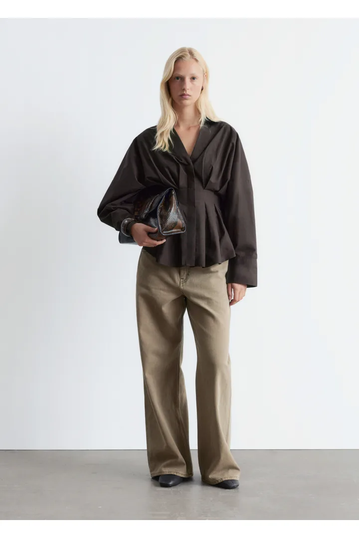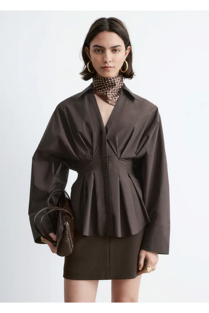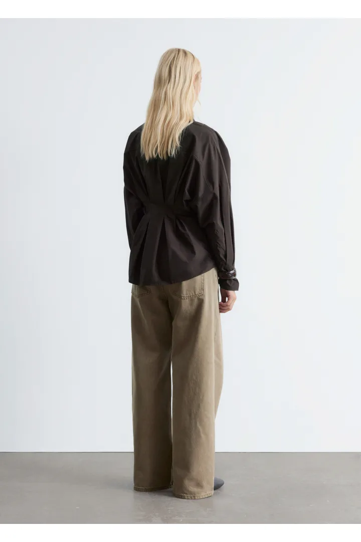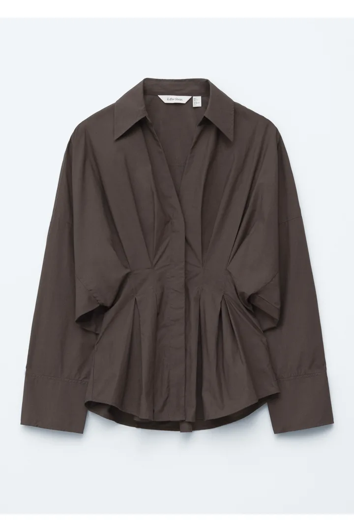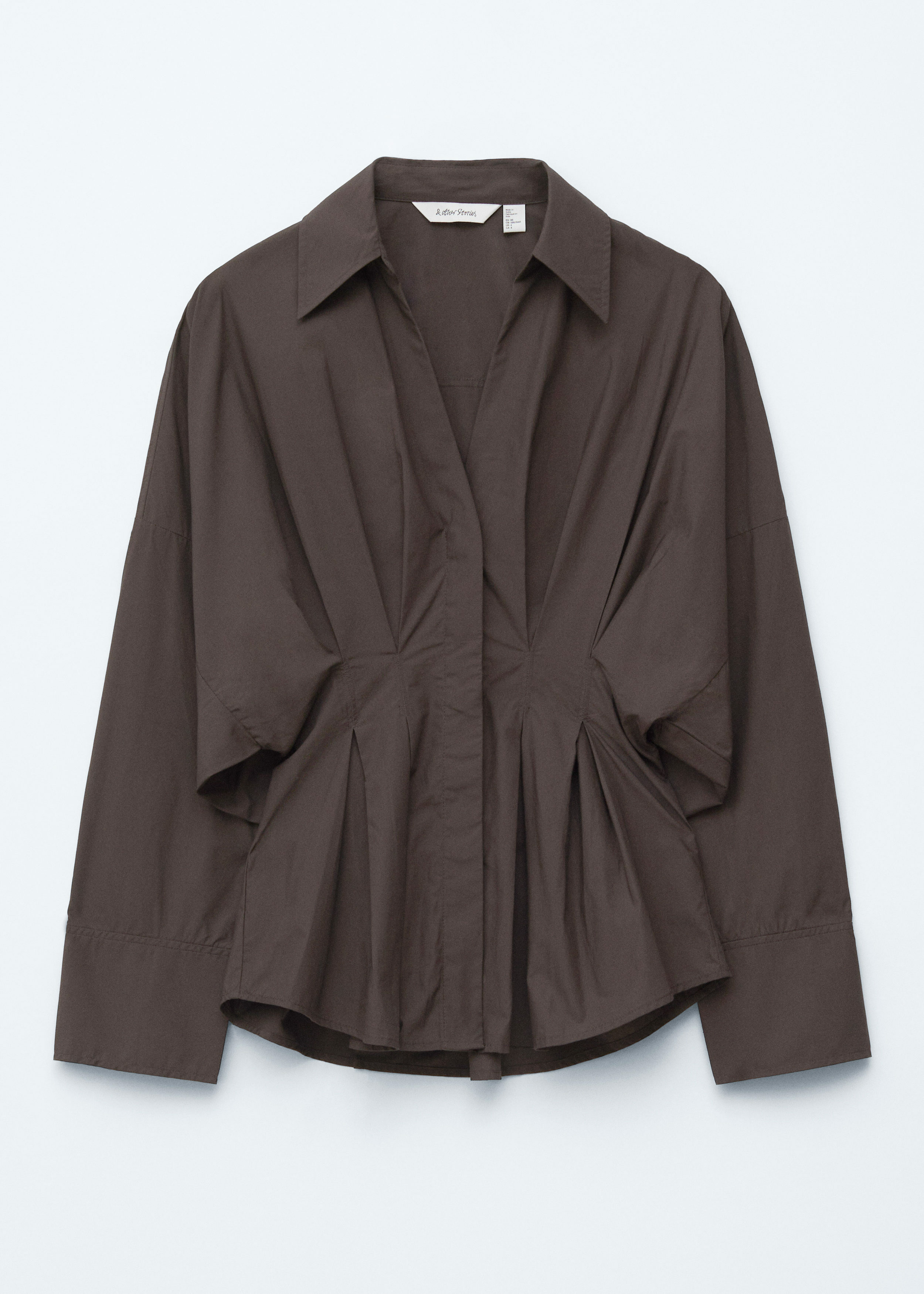 가볍고 산뜻한 100% 코튼 소재로 탄생한 셔츠예요. 구조적인 실루엣이 멋스러우며 오픈 카라, 컨실드 단추가 자리한 플래킷, 플리츠 디테일이 장식된 핏 되는 허리라인, 볼륨감 있는 롱 슬리브, 버튼 커프스가 특징이에요.