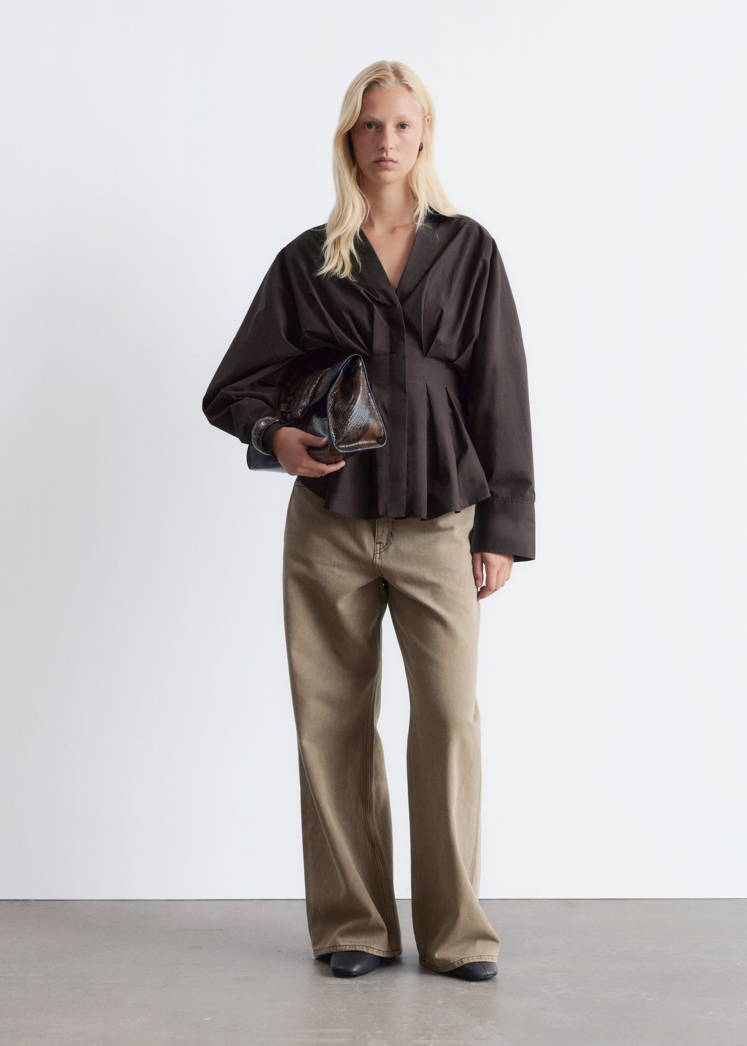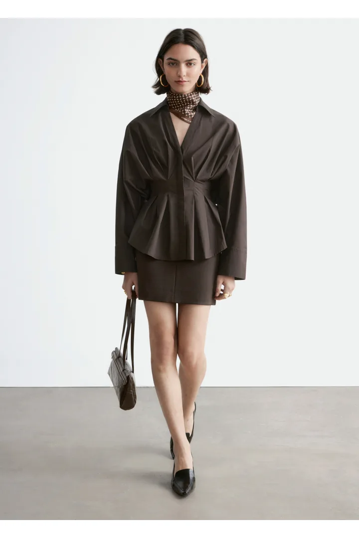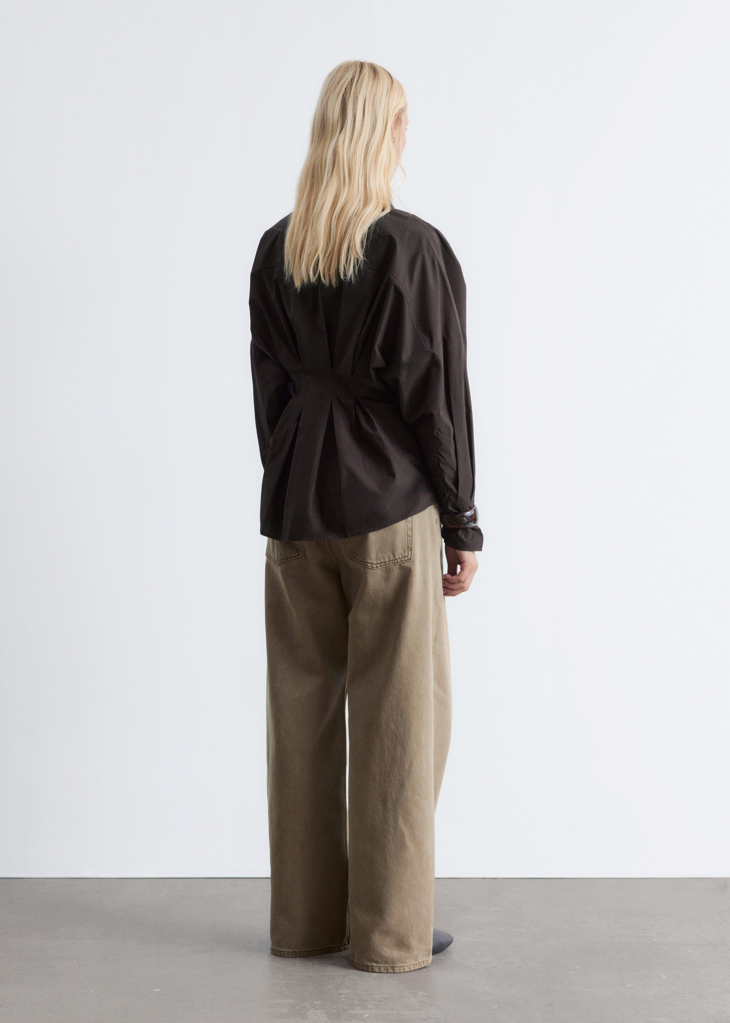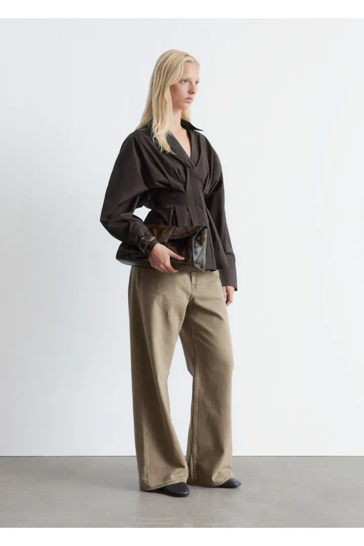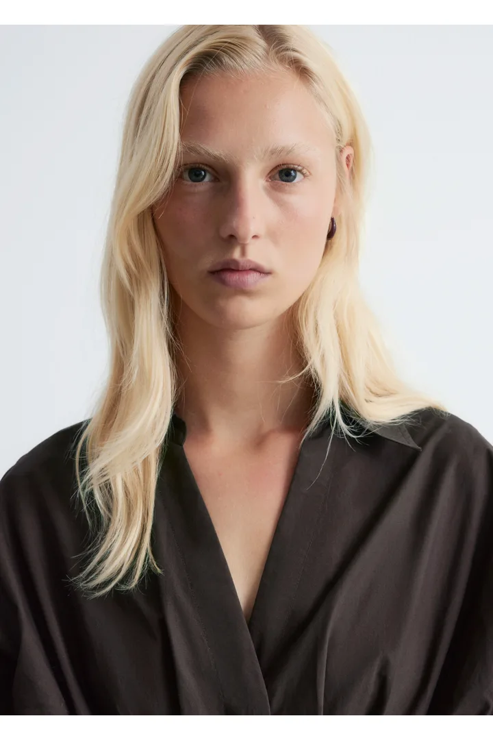 가볍고 산뜻한 100% 코튼 소재로 탄생한 셔츠예요. 구조적인 실루엣이 멋스러우며 오픈 카라, 컨실드 단추가 자리한 플래킷, 플리츠 디테일이 장식된 핏 되는 허리라인, 볼륨감 있는 롱 슬리브, 버튼 커프스가 특징이에요.