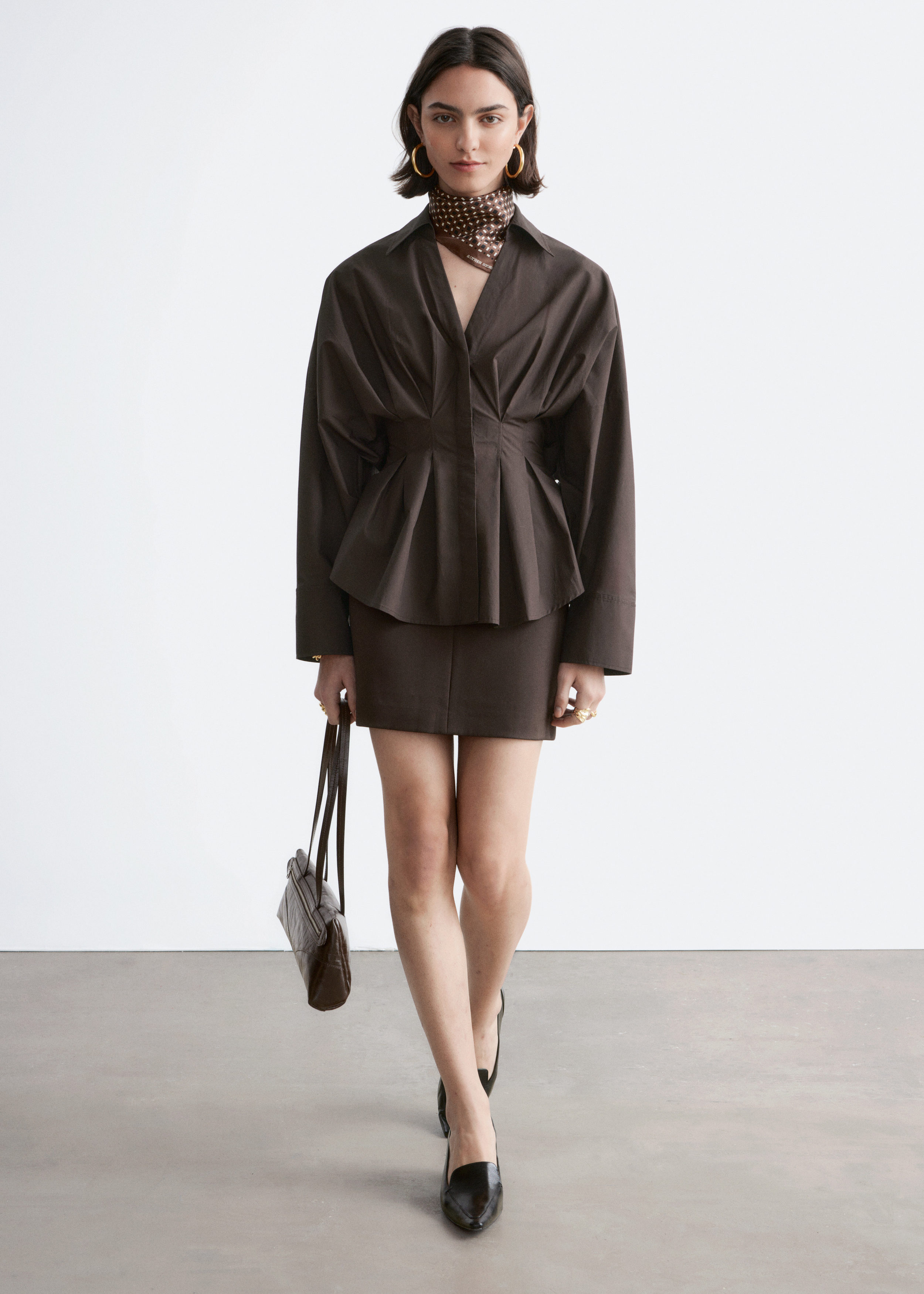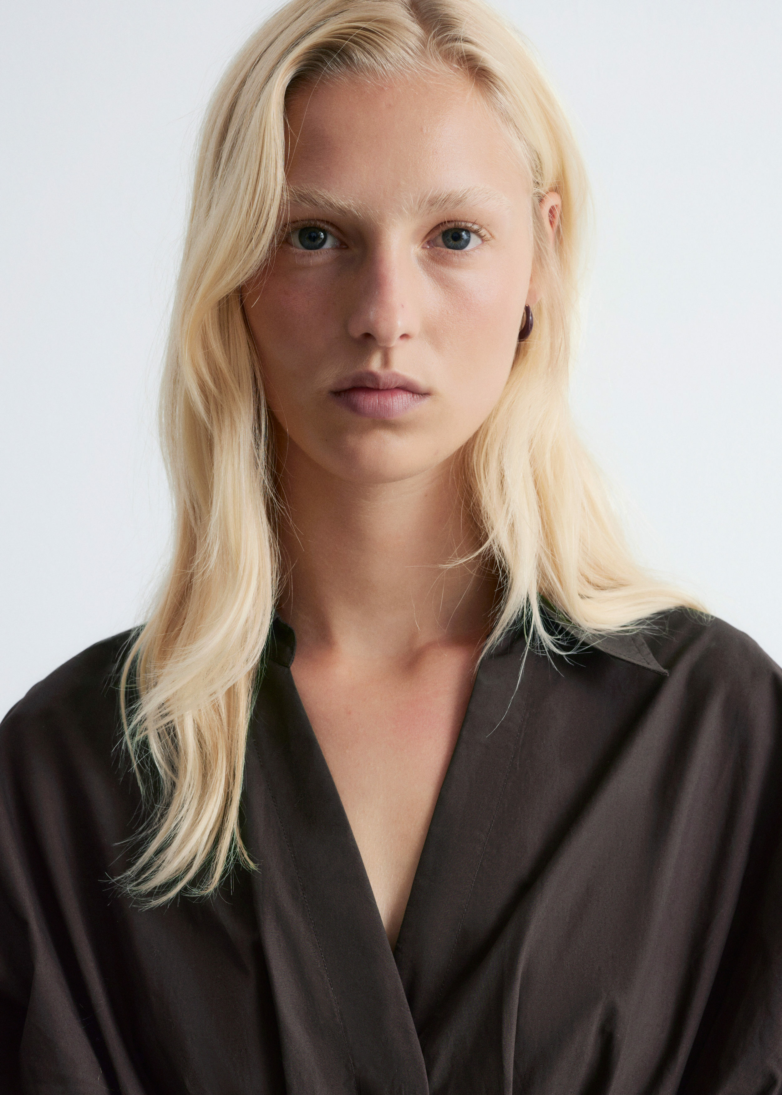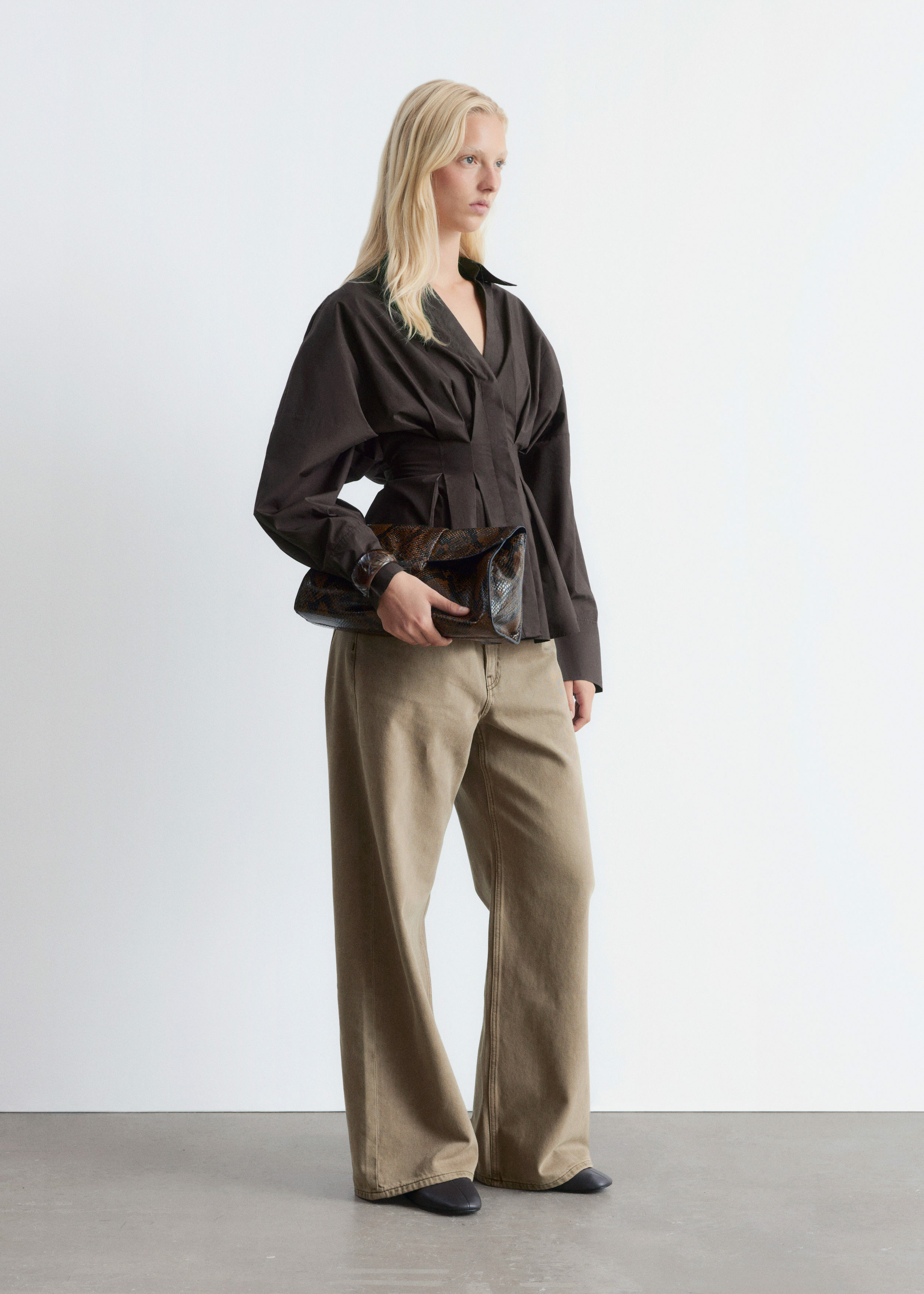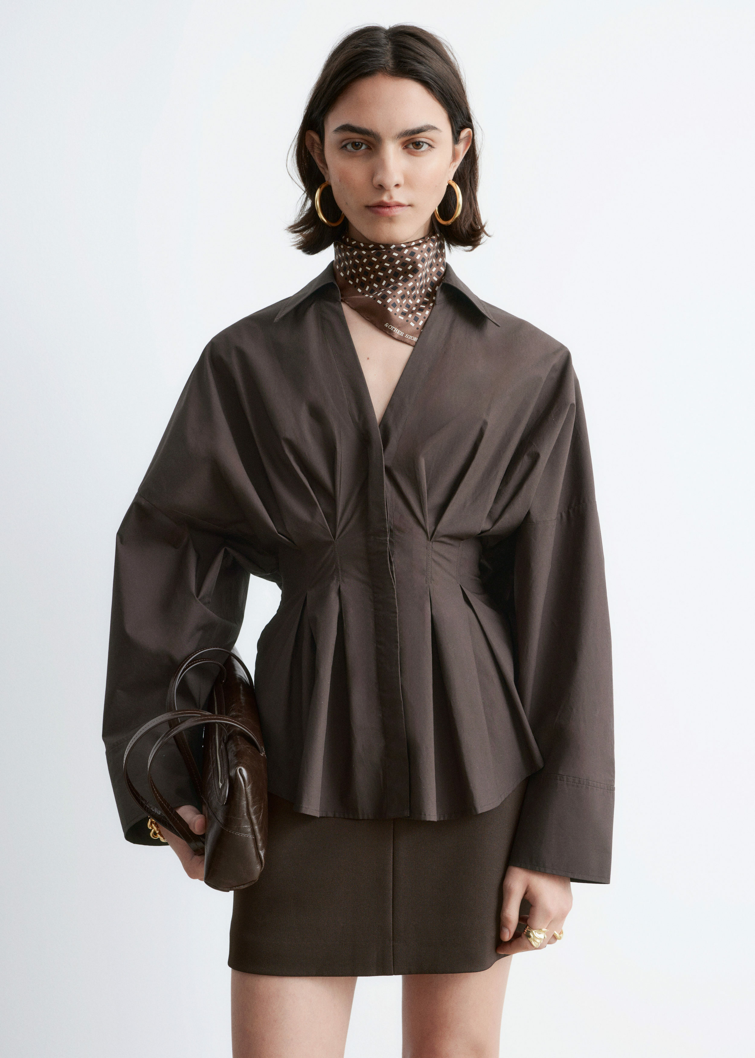 가볍고 산뜻한 100% 코튼 소재로 탄생한 셔츠예요. 구조적인 실루엣이 멋스러우며 오픈 카라, 컨실드 단추가 자리한 플래킷, 플리츠 디테일이 장식된 핏 되는 허리라인, 볼륨감 있는 롱 슬리브, 버튼 커프스가 특징이에요.