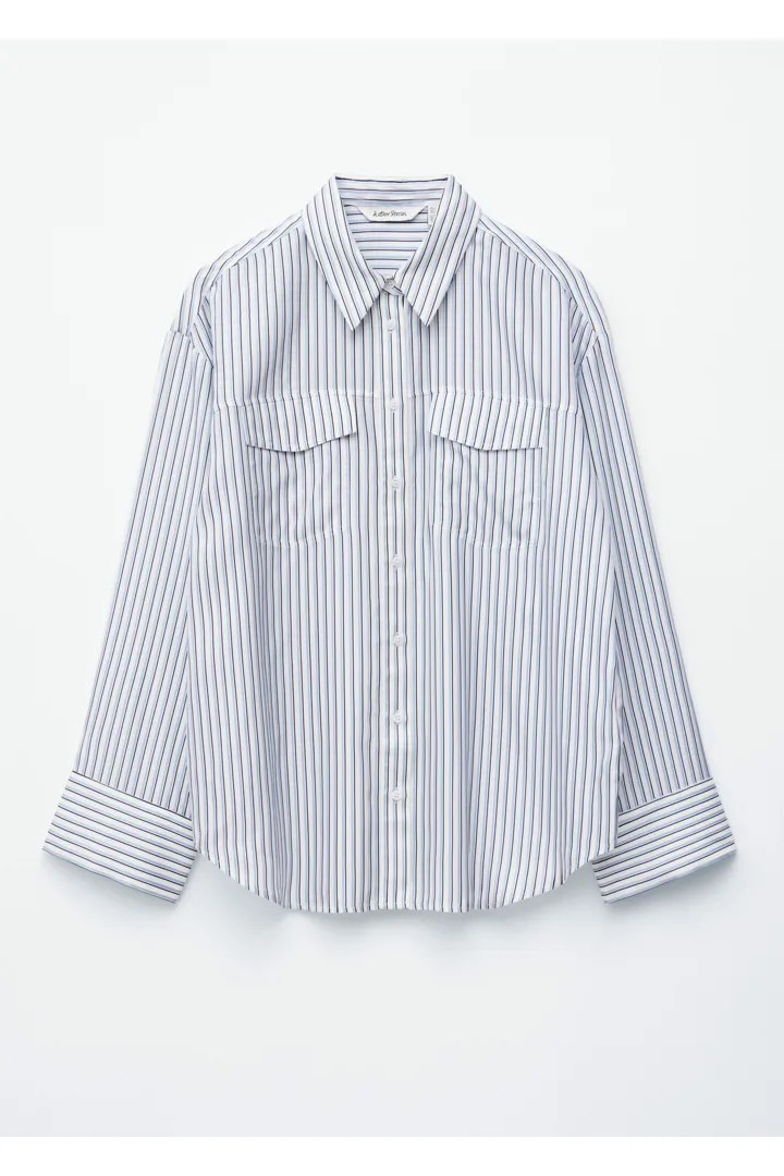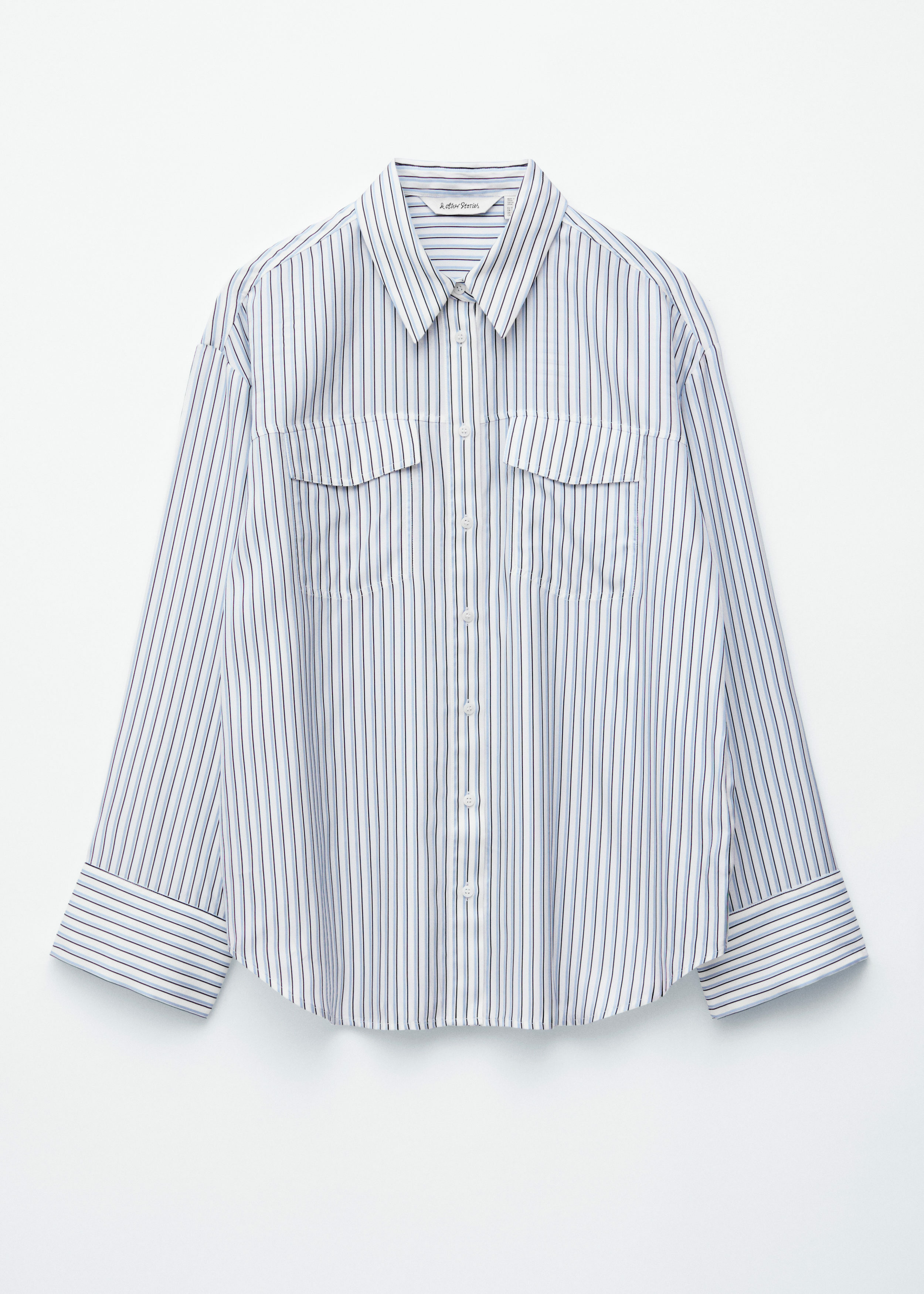 가벼운 소재로 탄생한 셔츠예요. 스트레이트 실루엣과 얇은 전면 스트라이프가 멋스럽답니다. 클래식 카라, 가슴의 패치 포캣 2개, 버튼 커프스가 자리해 있어요.