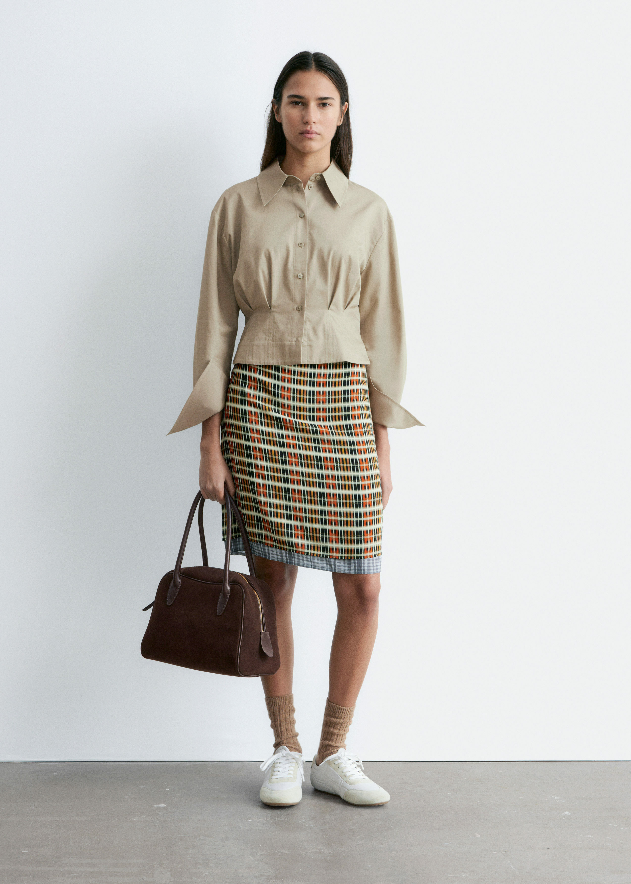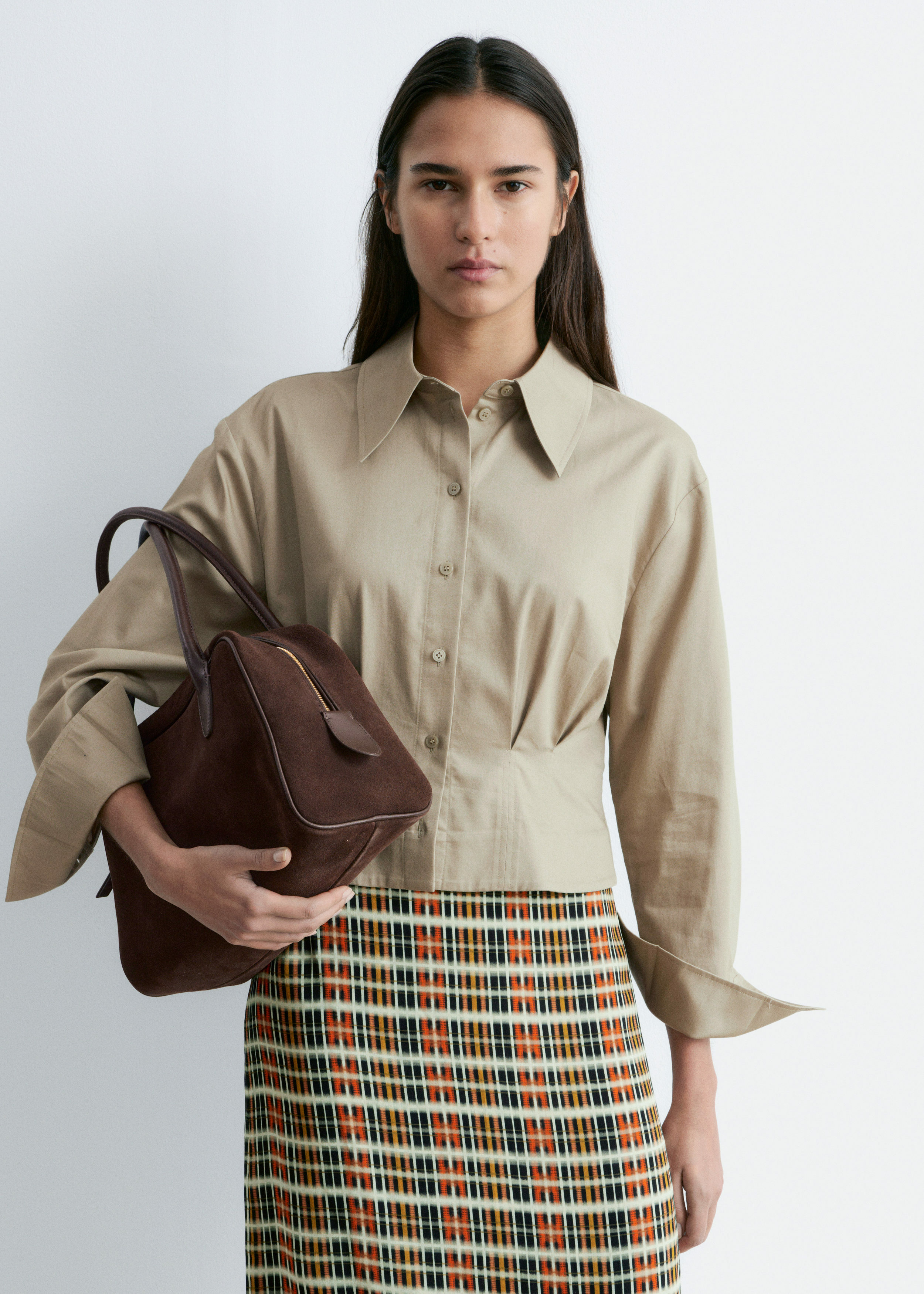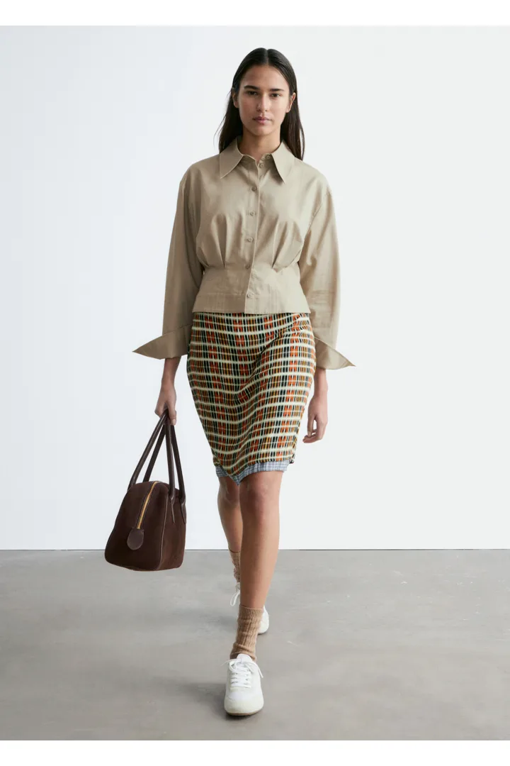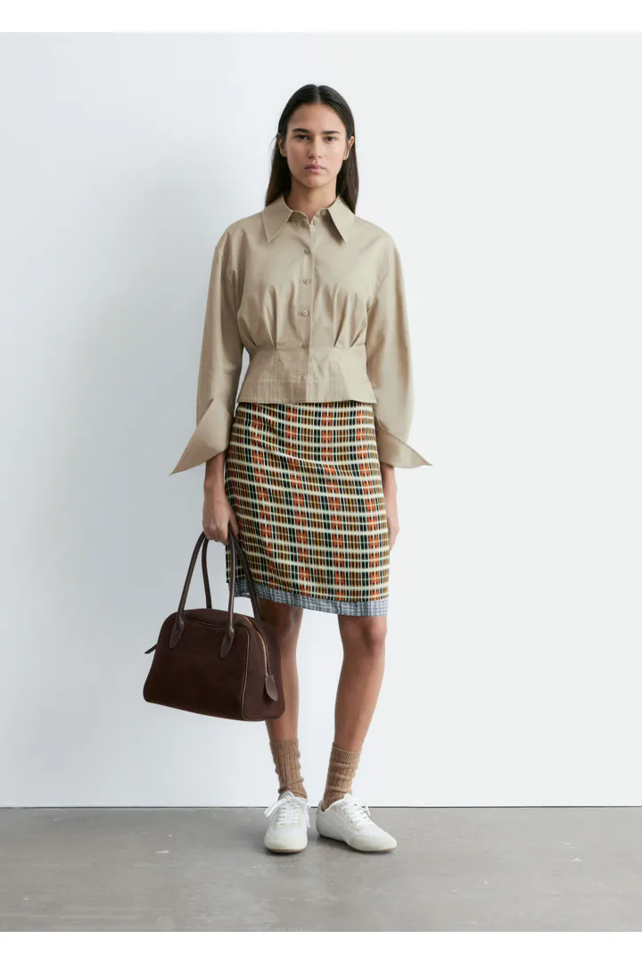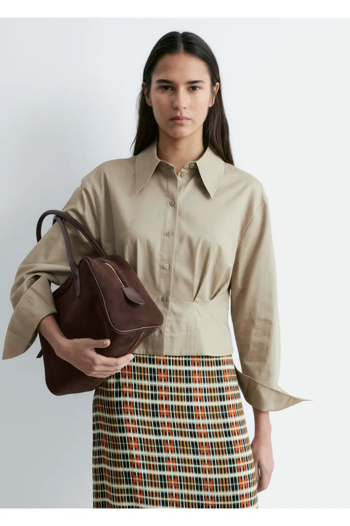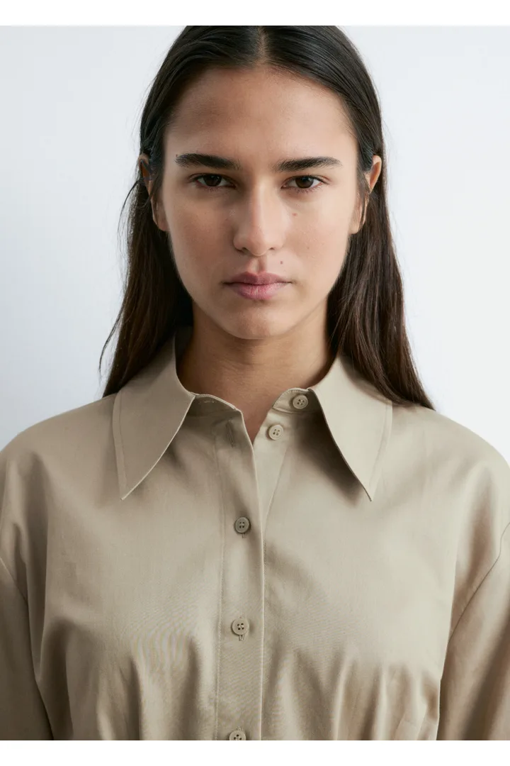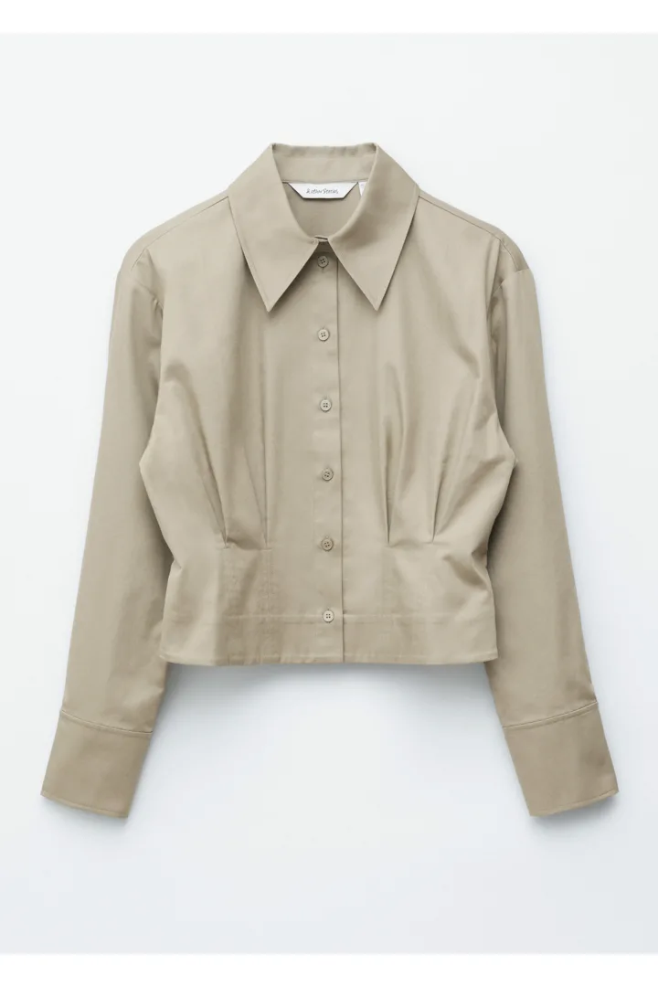 쇼트 실루엣의 셔츠예요. 포인트 턴 다운 카라, 앞면의 단추, 롱 슬리브와 버튼 커프스가 자리해 있어요. 테이퍼드 웨이스트에 자리한 플리츠가 멋스러움을 더한답니다.
