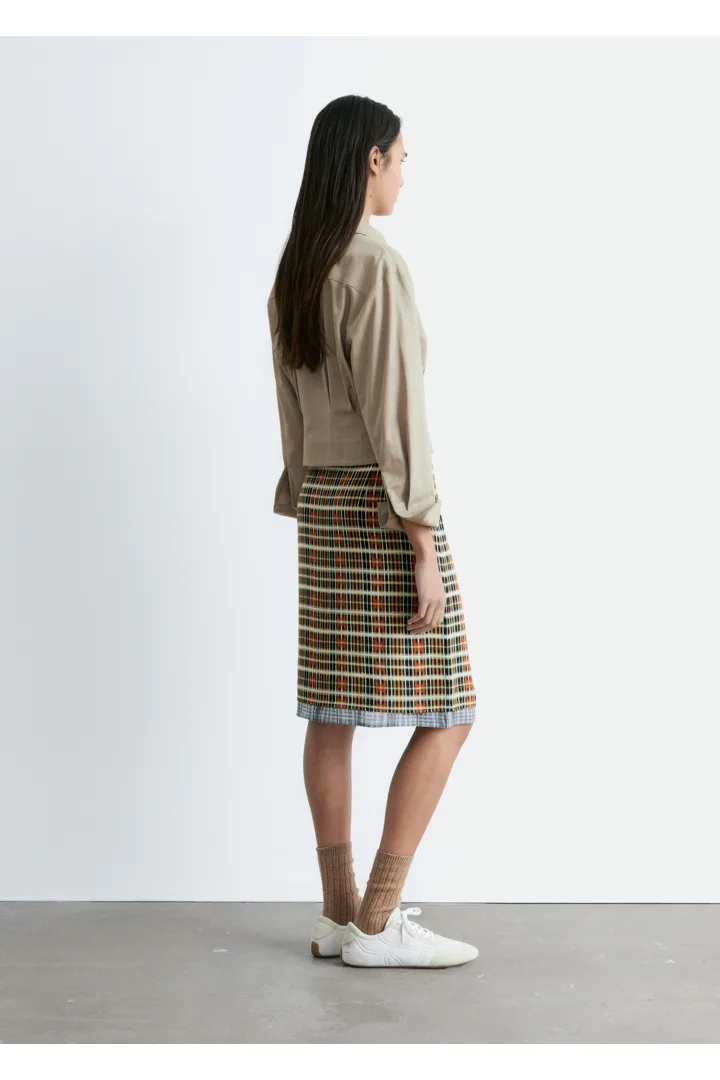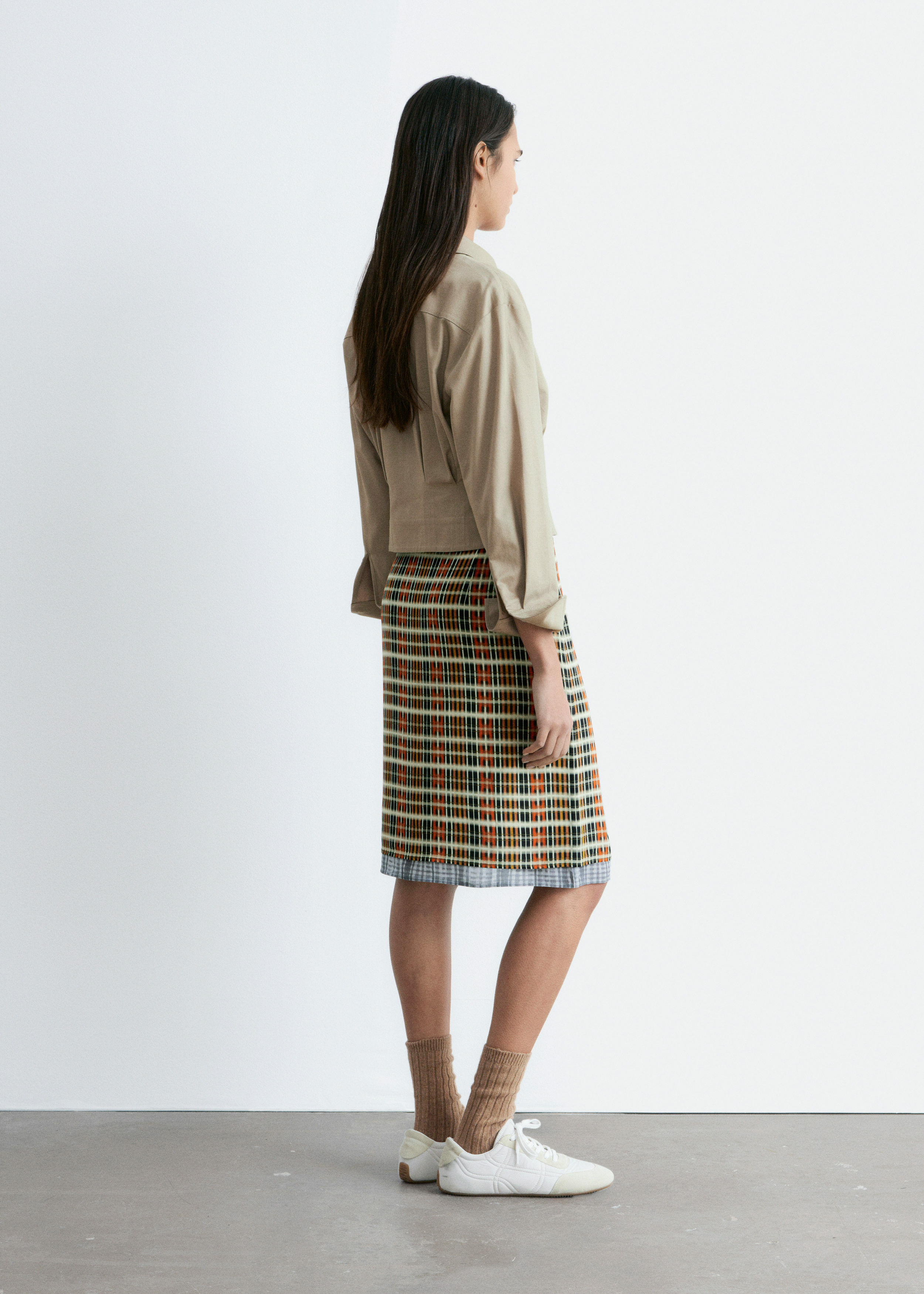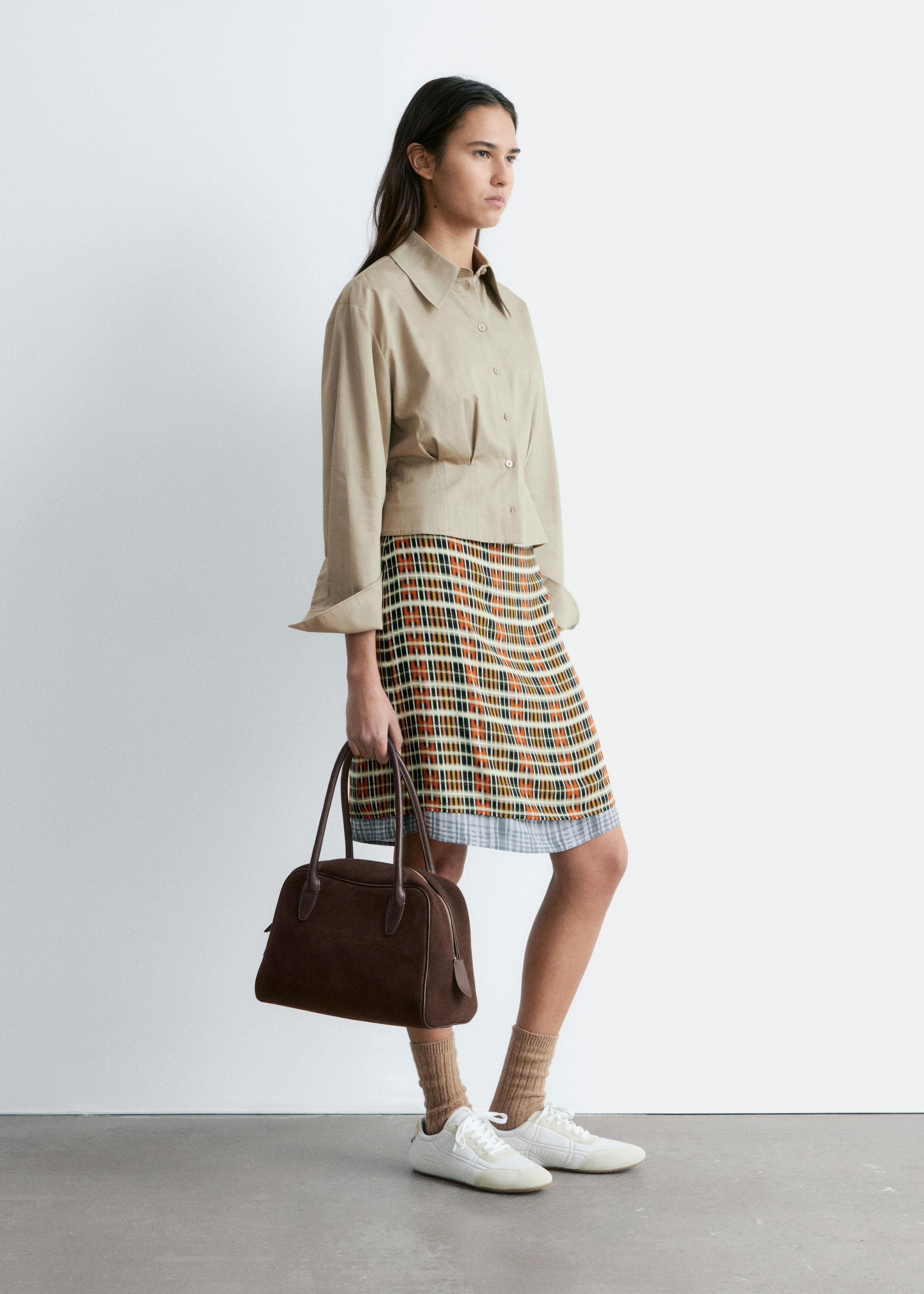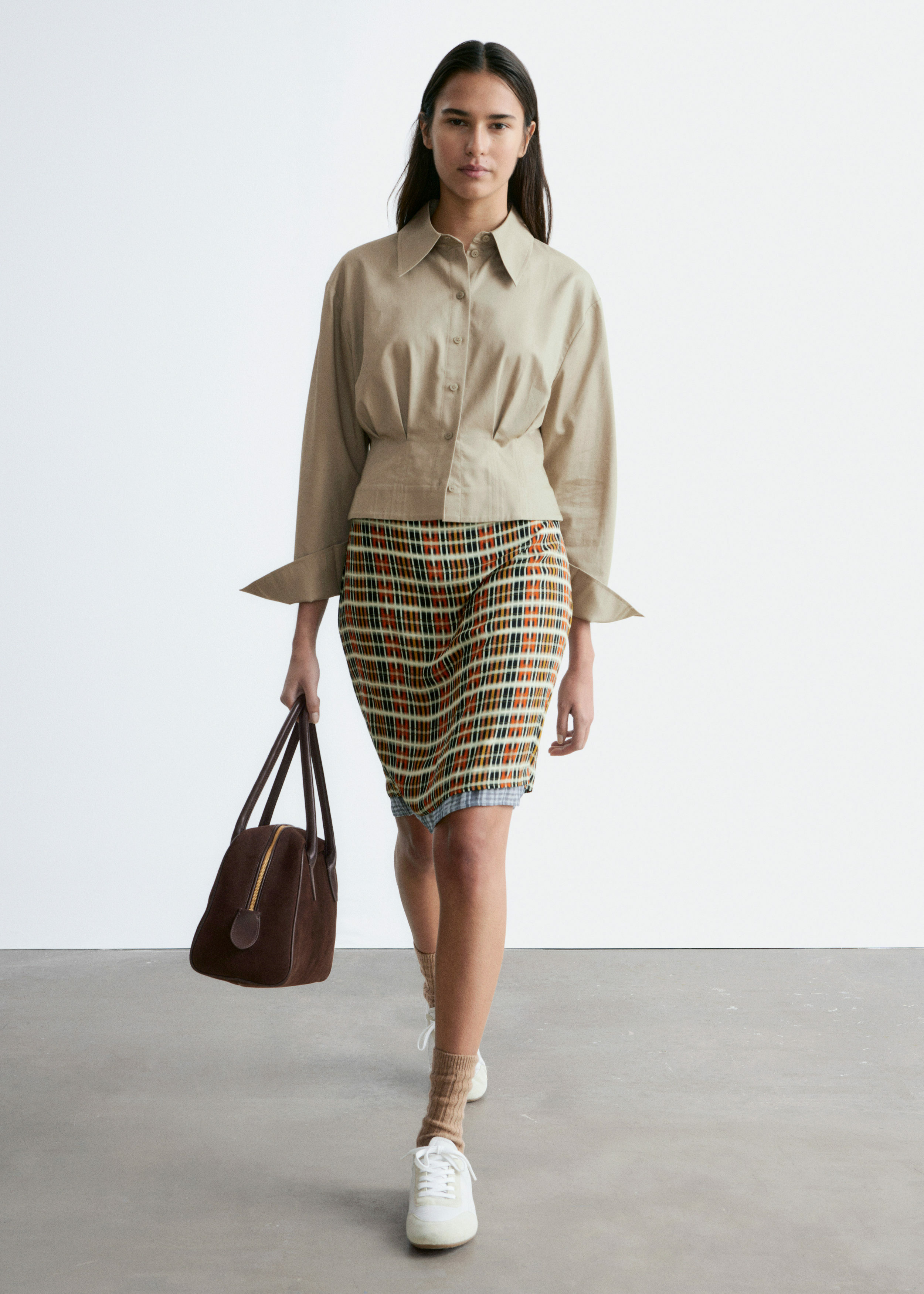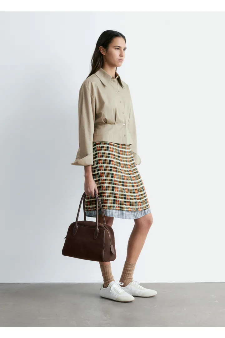 쇼트 실루엣의 셔츠예요. 포인트 턴 다운 카라, 앞면의 단추, 롱 슬리브와 버튼 커프스가 자리해 있어요. 테이퍼드 웨이스트에 자리한 플리츠가 멋스러움을 더한답니다.