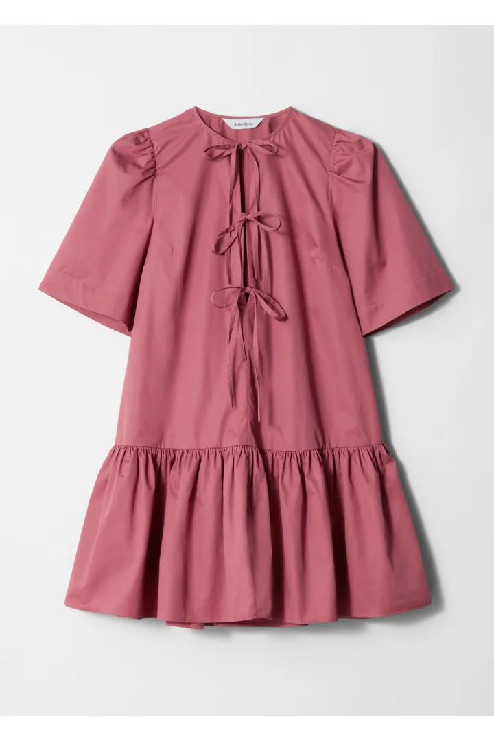 가볍고 산뜻한 코튼 포플린 소재로 탄생한 미니 드레스예요. A 라인 실루엣, 볼륨감 있는 쇼트 슬리브, 프릴 페플럼 헴라인이 어우러져 경쾌한 움직임과 여성스러운 터치를 더해주어요. 오픈 네크라인의 앞면에는 3개의 타이 클로저가 자리해 있답니다.