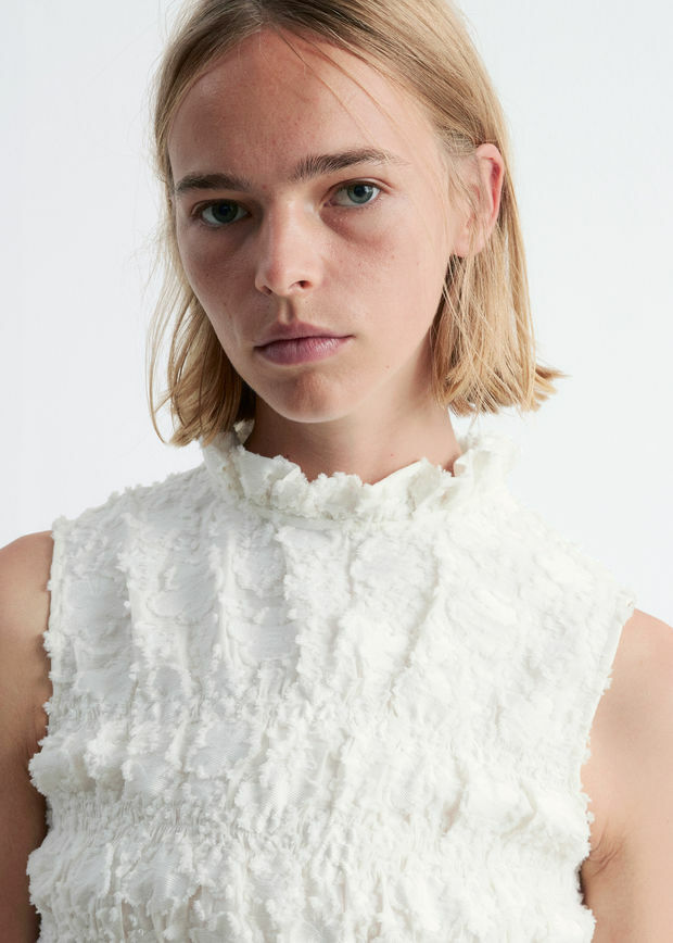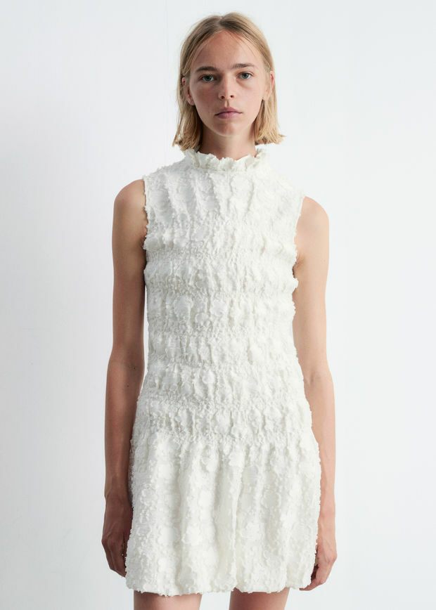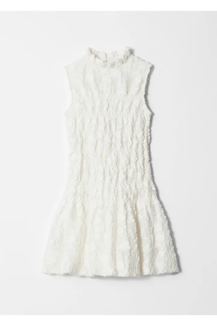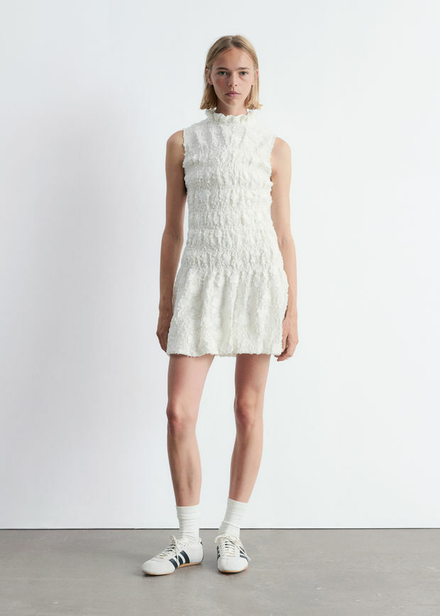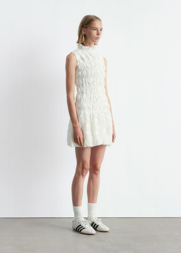 가벼운 보일 소재로 탄생한 미니 드레스예요. 스모크 주름이 잡힌 플로럴 패턴이 텍스처와 입체감을 더한답니다. 프릴 스탠드 카라, 핏 되는 보디스, 드롭 웨이스트, 플레어 퍼프 스커트가 시선을 사로잡으며, 네크라인에는 키홀 단추가 자리해 있어요. 스트랩 샌들과 함께 완벽한 여름 룩을 연출해 보세요.