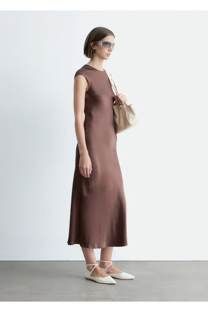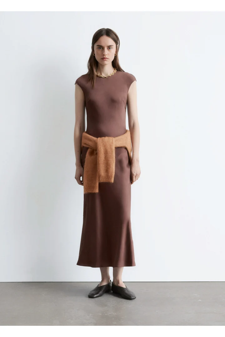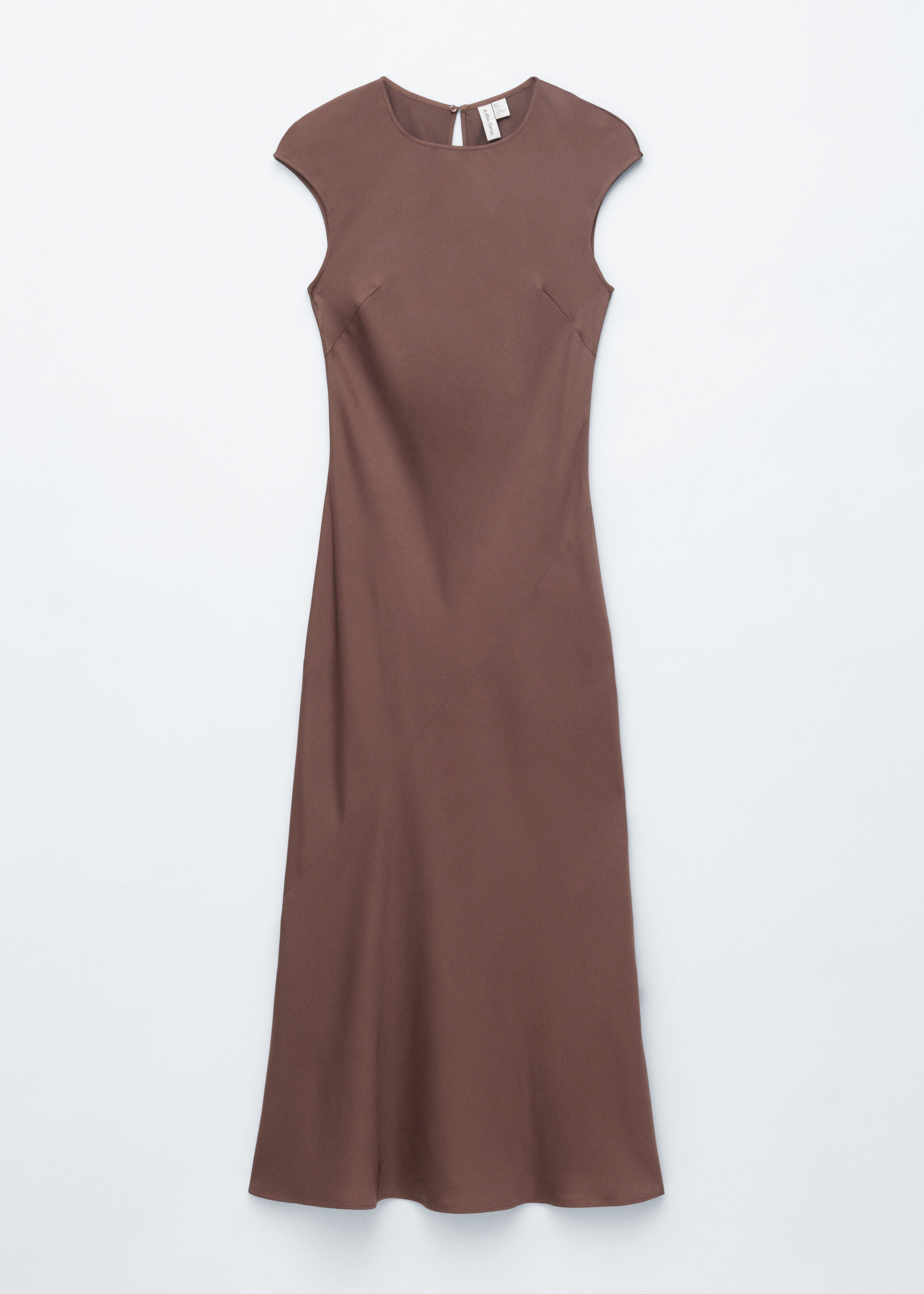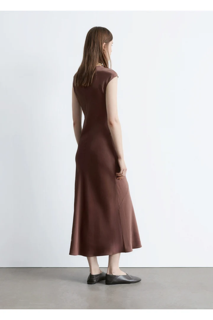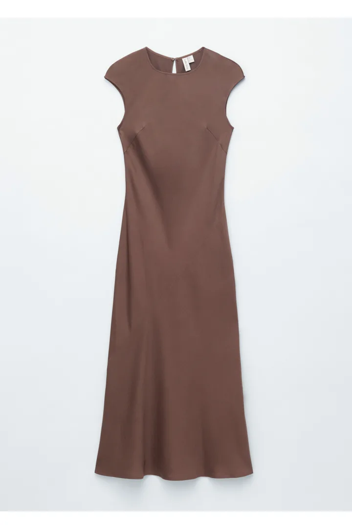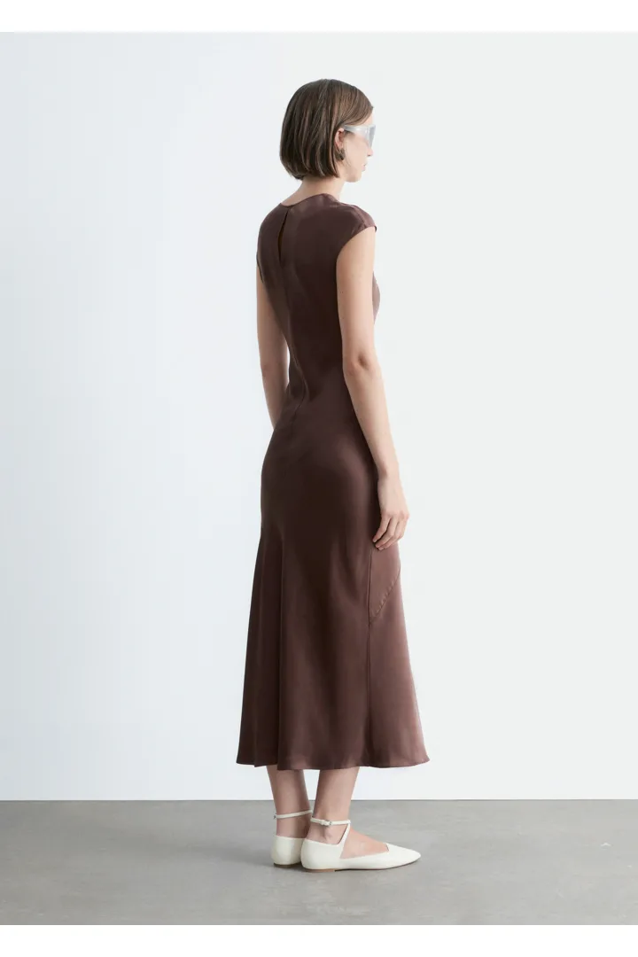 우아하게 흐르는 비스코스 새틴으로 탄생한 맥시 드레스예요. 라운드 네크라인, 캡 슬리브, 그리고 뒷면의 키홀 오프닝과 버튼 & 루프 클로저가 자리해 있어요. 슬림한 핏이 멋스러운 제품으로, 가슴 다트와 사선의 커트라인 솔기가 특징이랍니다.