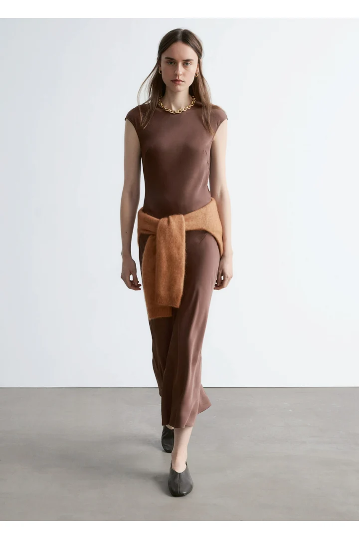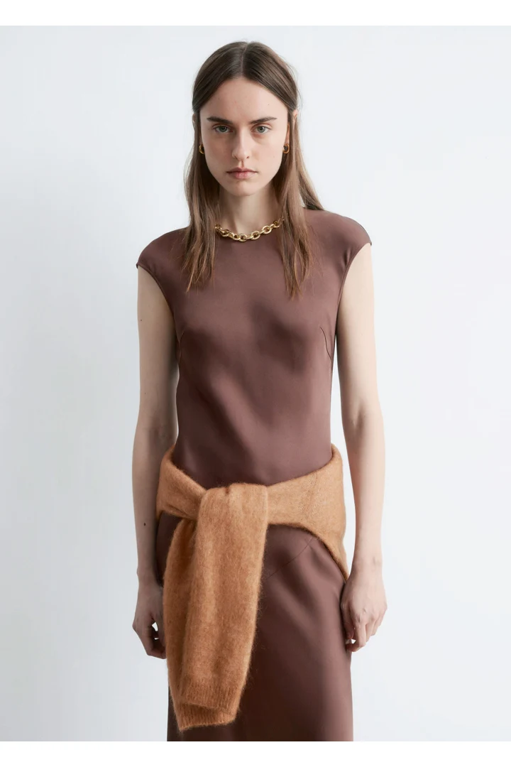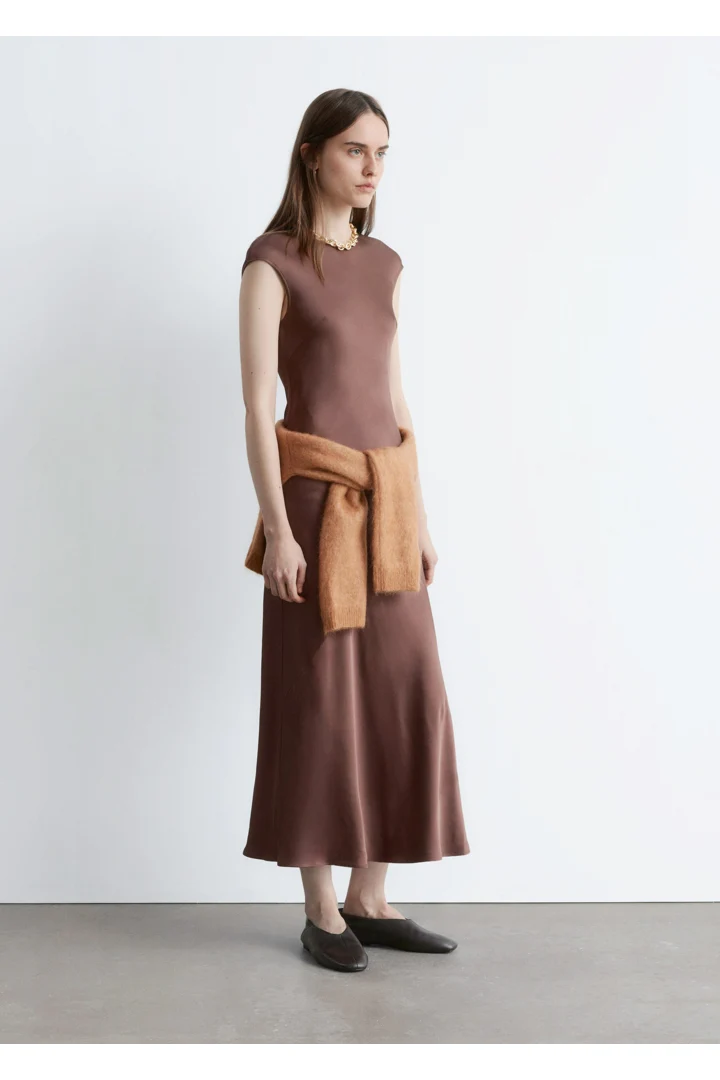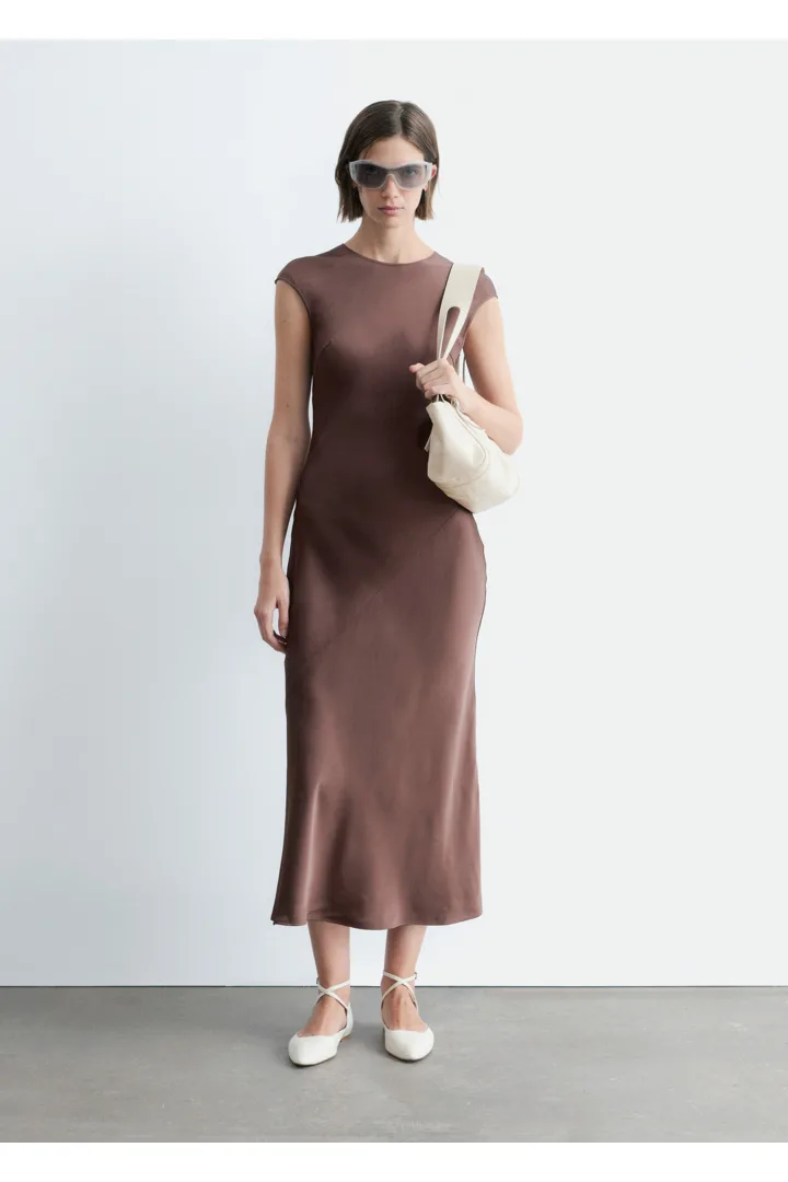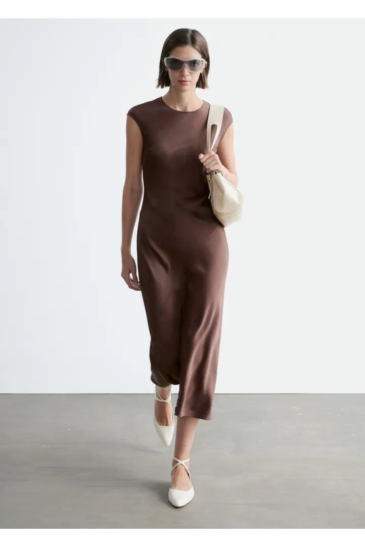 우아하게 흐르는 비스코스 새틴으로 탄생한 맥시 드레스예요. 라운드 네크라인, 캡 슬리브, 그리고 뒷면의 키홀 오프닝과 버튼 & 루프 클로저가 자리해 있어요. 슬림한 핏이 멋스러운 제품으로, 가슴 다트와 사선의 커트라인 솔기가 특징이랍니다.