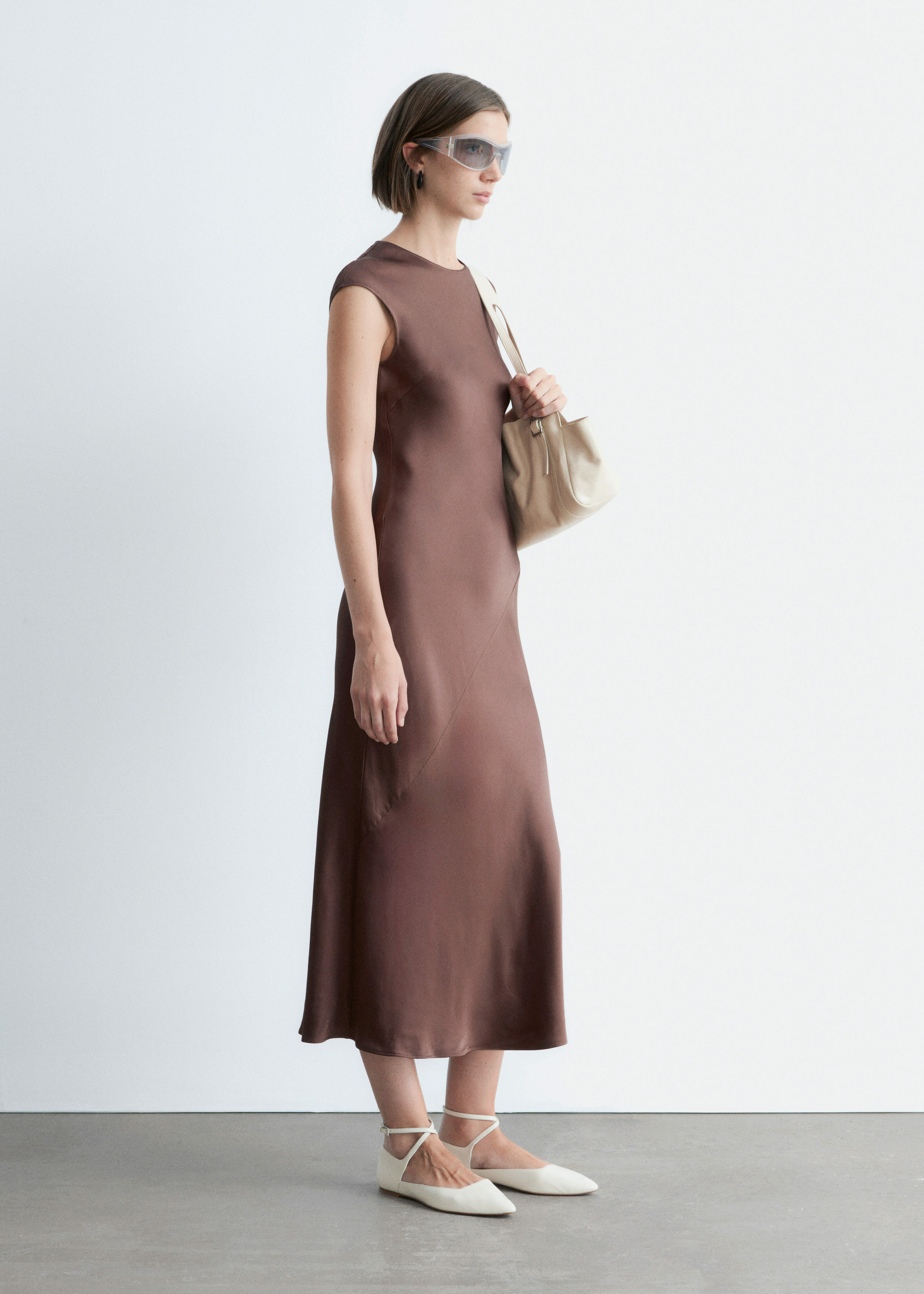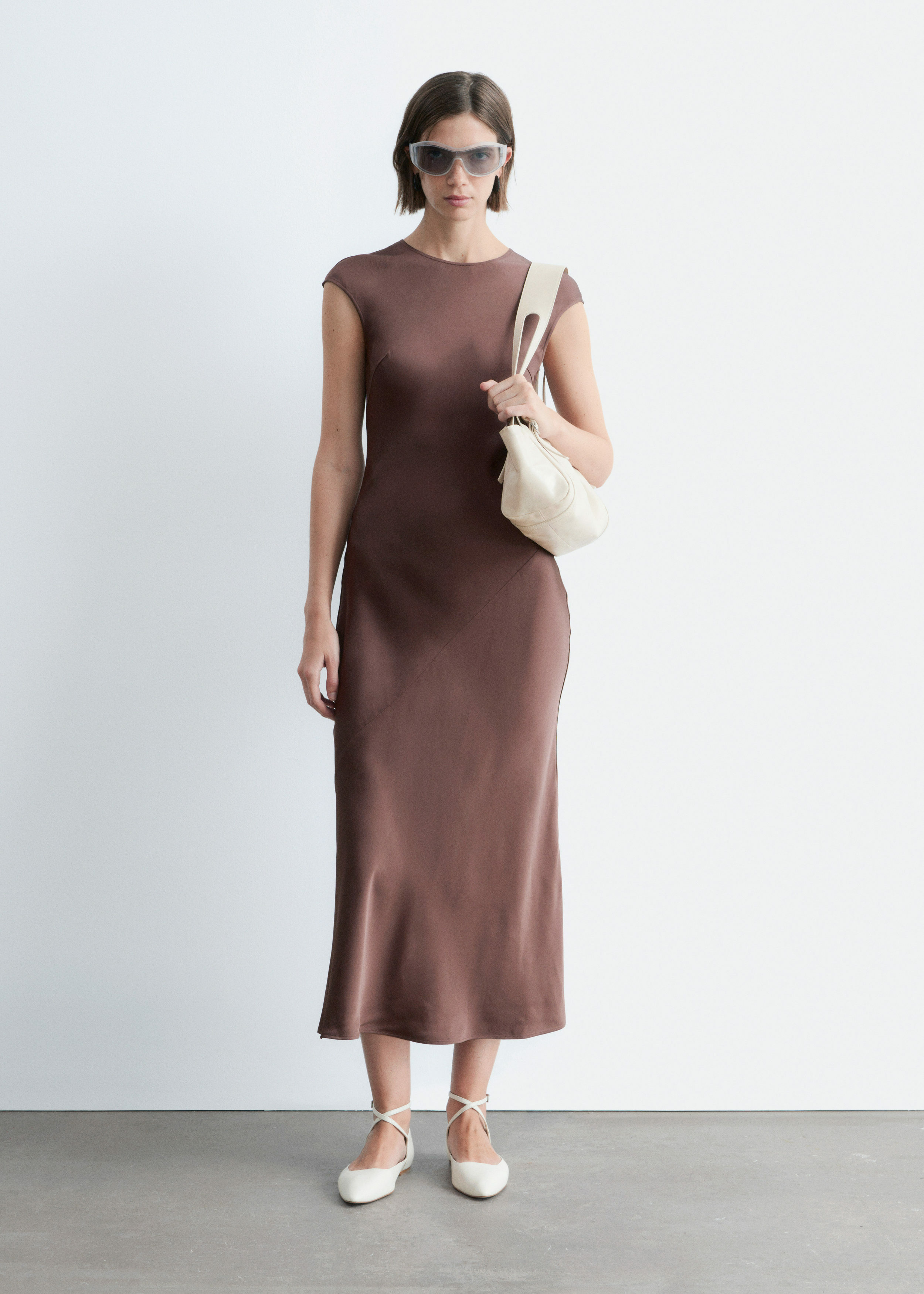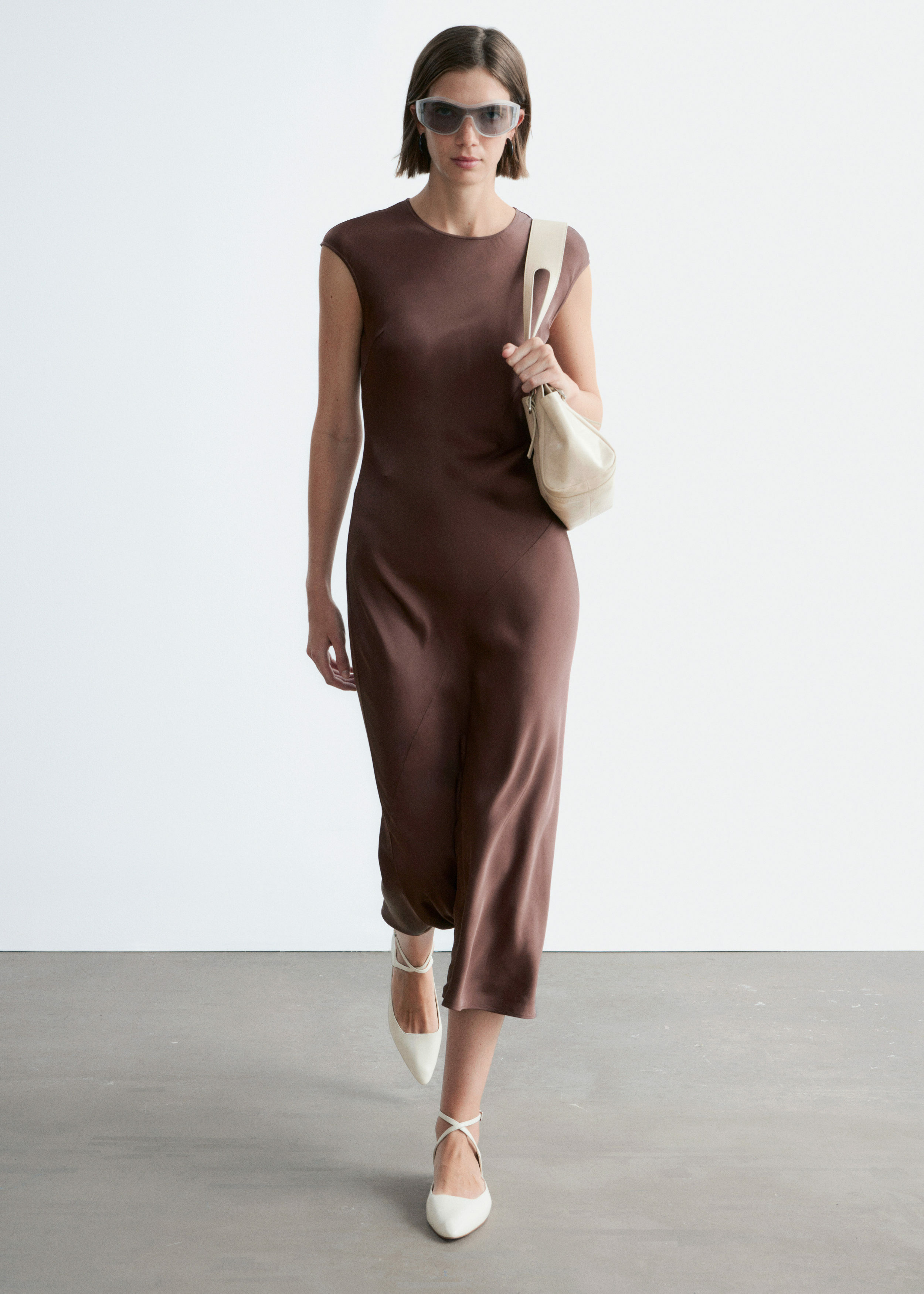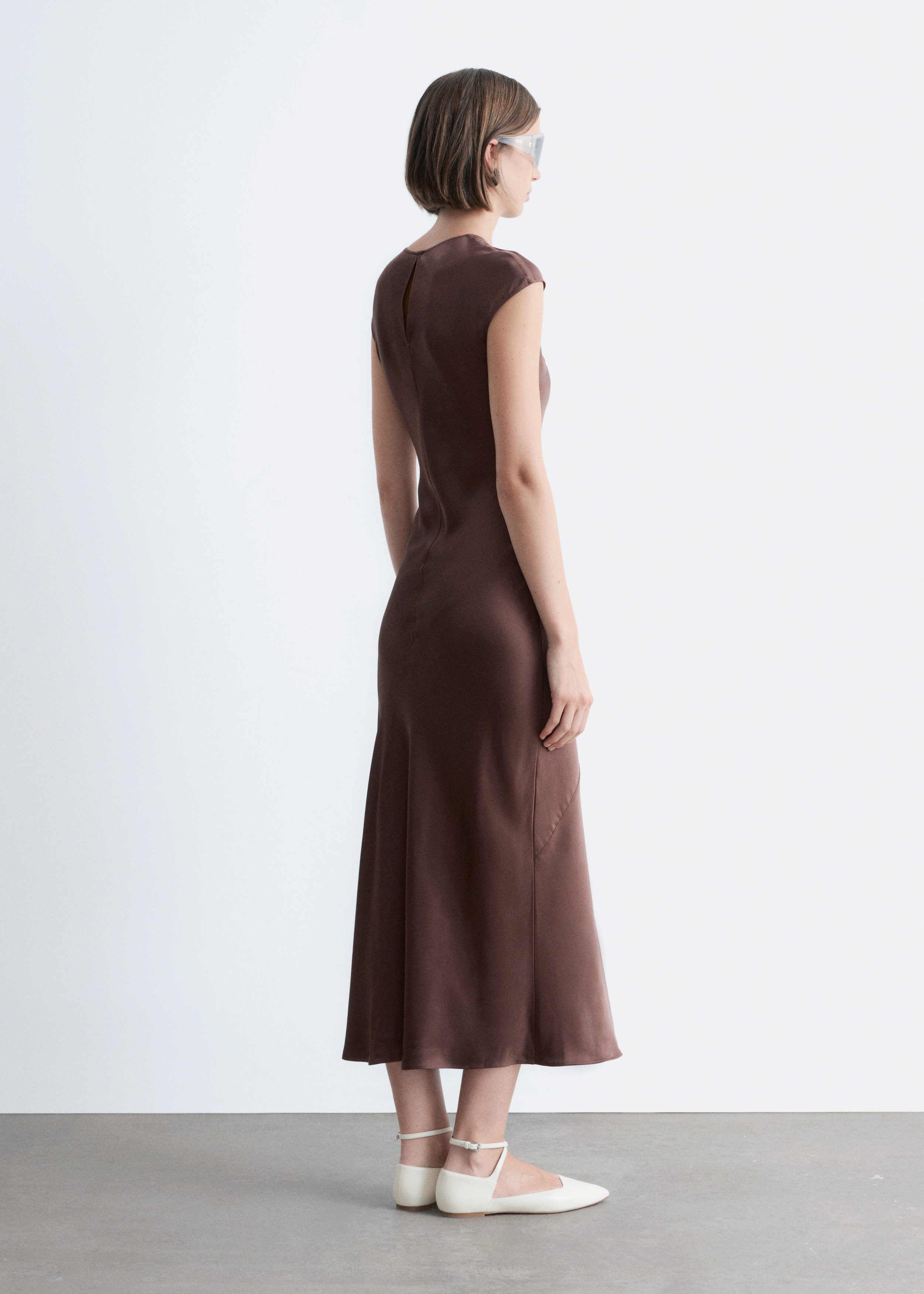 우아하게 흐르는 비스코스 새틴으로 탄생한 맥시 드레스예요. 라운드 네크라인, 캡 슬리브, 그리고 뒷면의 키홀 오프닝과 버튼 & 루프 클로저가 자리해 있어요. 슬림한 핏이 멋스러운 제품으로, 가슴 다트와 사선의 커트라인 솔기가 특징이랍니다.