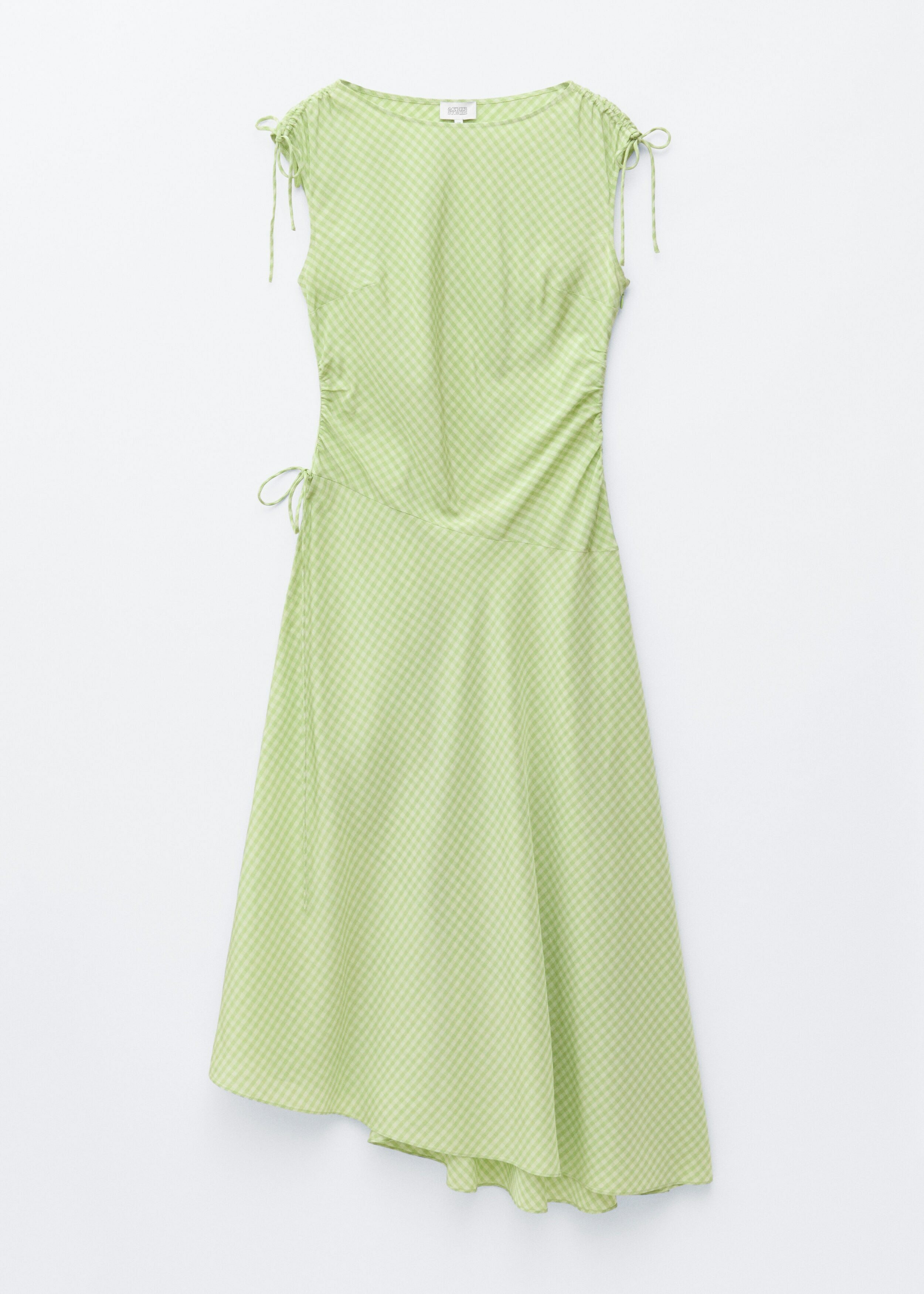 유려한 비스코스 소재로 탄생한 슬리브리스 미디 드레스예요. 부드러운 드레이핑과 비대칭 컷이 돋보이는 아이템이랍니다. 어깨의 드로스트링으로 스타일을 살짝 조절할 수 있으며, 가슴 다트로 장교한 핏을 연출해주어요. 허리 옆면의 셔링과 드롭 웨이스트라인으로 스커트에 경쾌한 움직임을 더해준답니다.