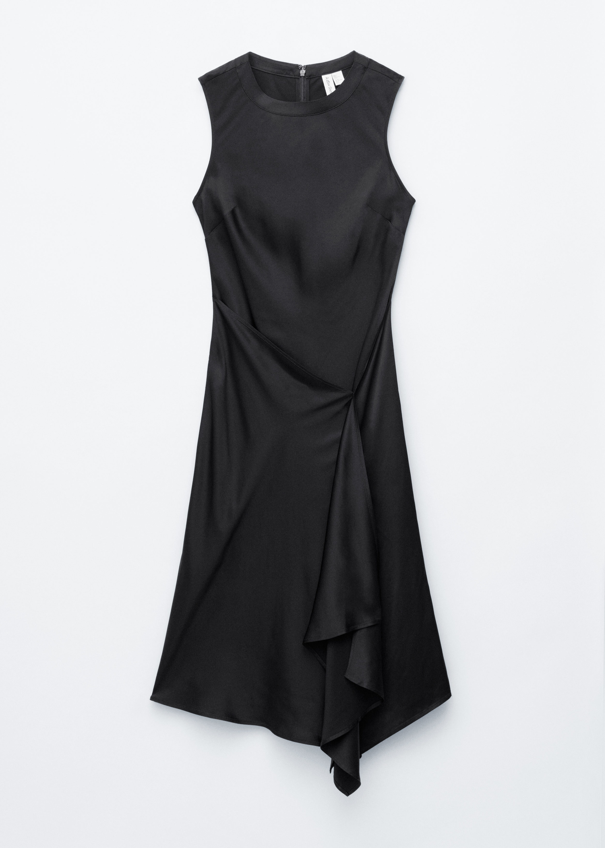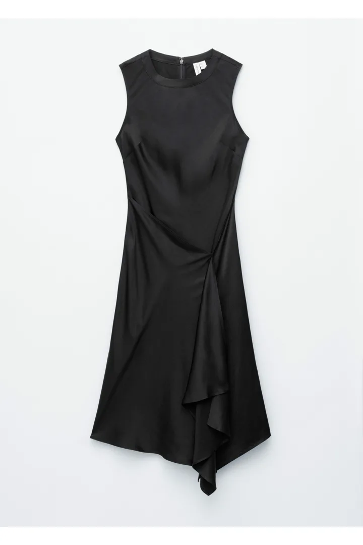 은은한 광택이 도는 새틴 소재의 슬리브리스 미디 드레스예요. 라운드 네크라인과 핏 되는 허리라인이 특징이며 물결치며 드레이프지는 크로스오버 스커트, 비대칭적인 헴라인이 특징이랍니다. 뒷면에느느 컨실드 지퍼가 자리해 있어요.