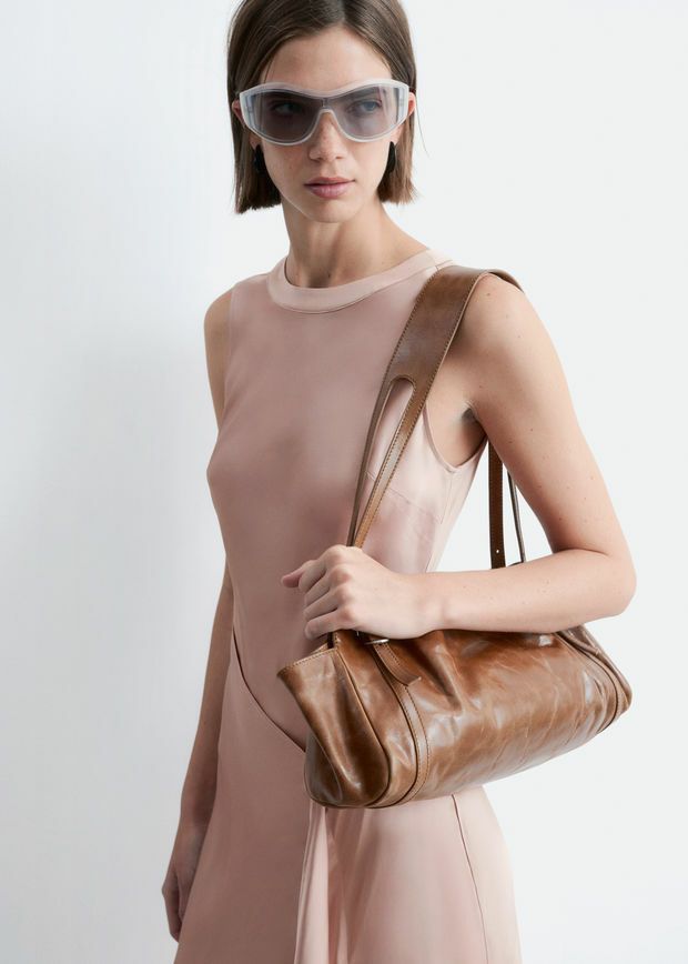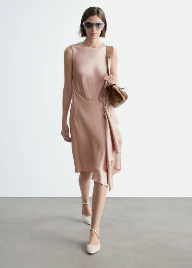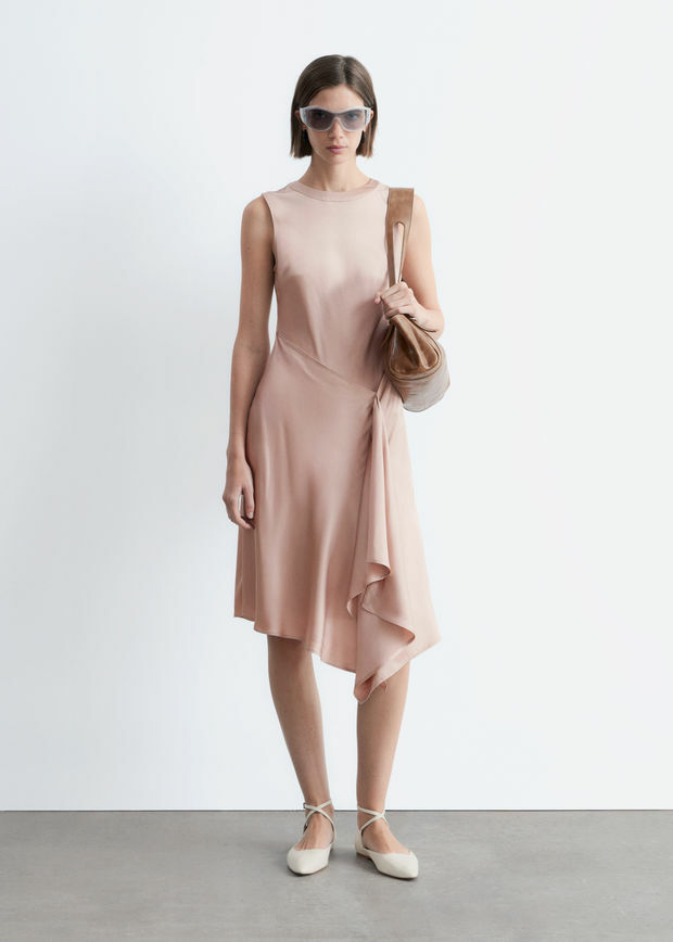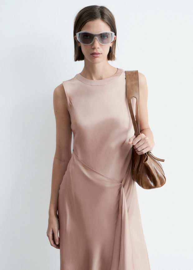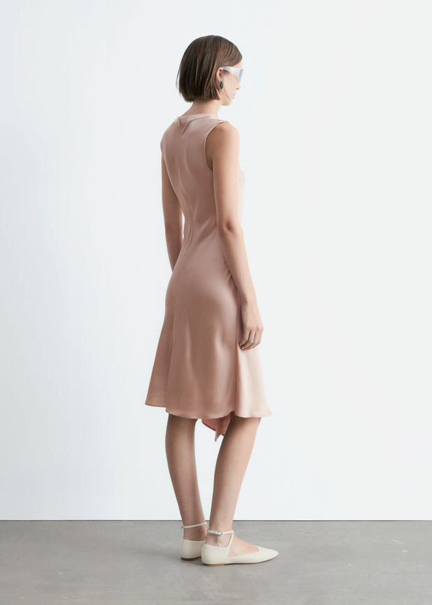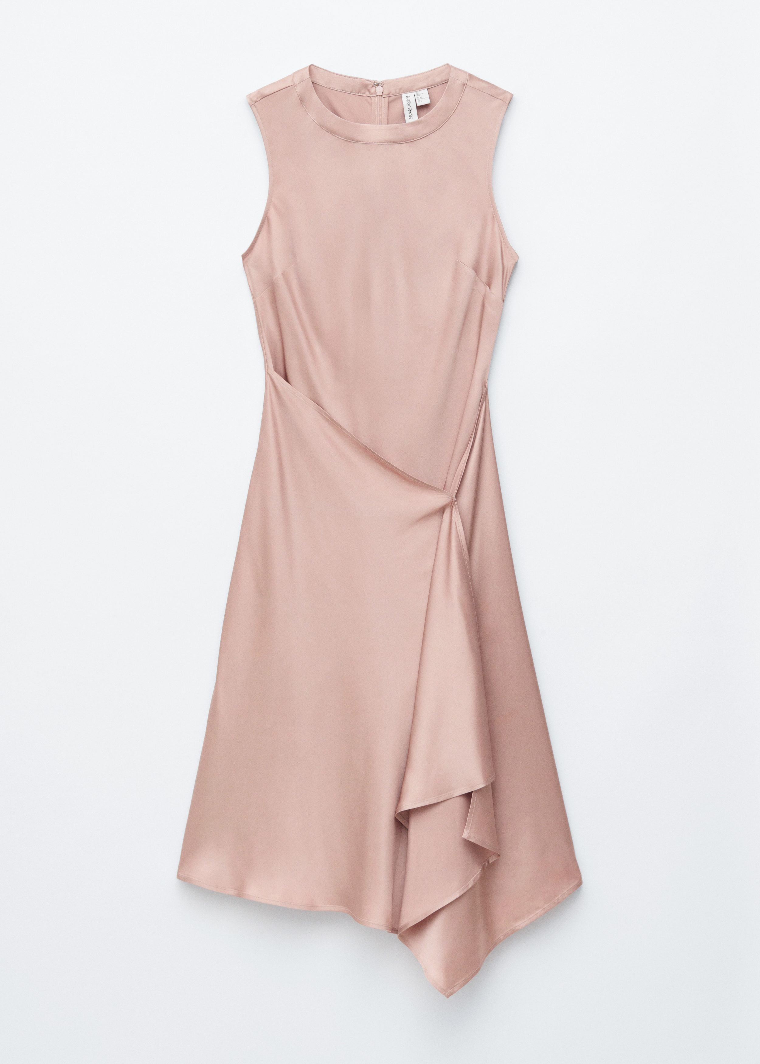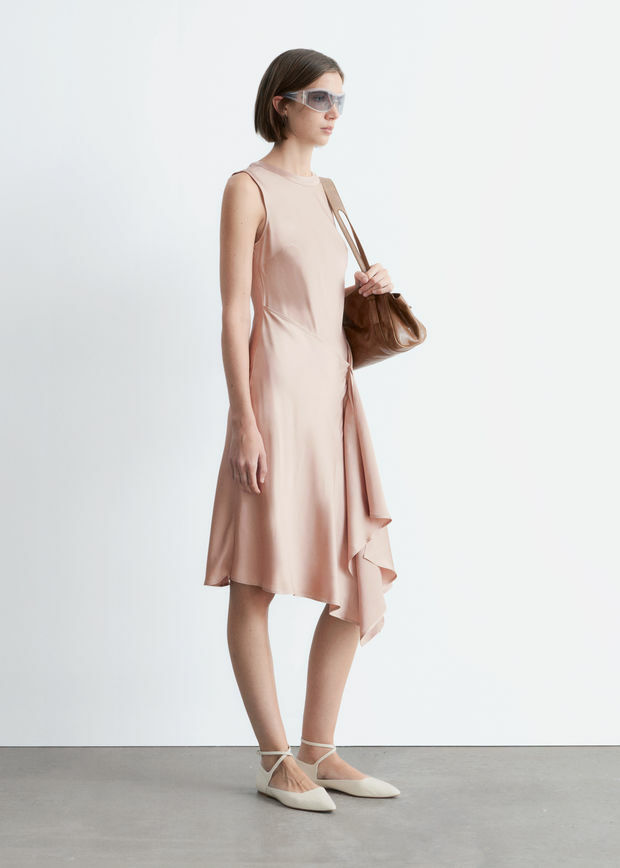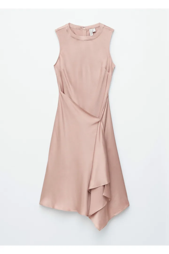 은은한 광택이 도는 새틴 소재의 슬리브리스 미디 드레스예요. 라운드 네크라인과 핏 되는 허리라인이 특징이며 물결치며 드레이프지는 크로스오버 스커트, 비대칭적인 헴라인이 특징이랍니다. 뒷면에느느 컨실드 지퍼가 자리해 있어요.