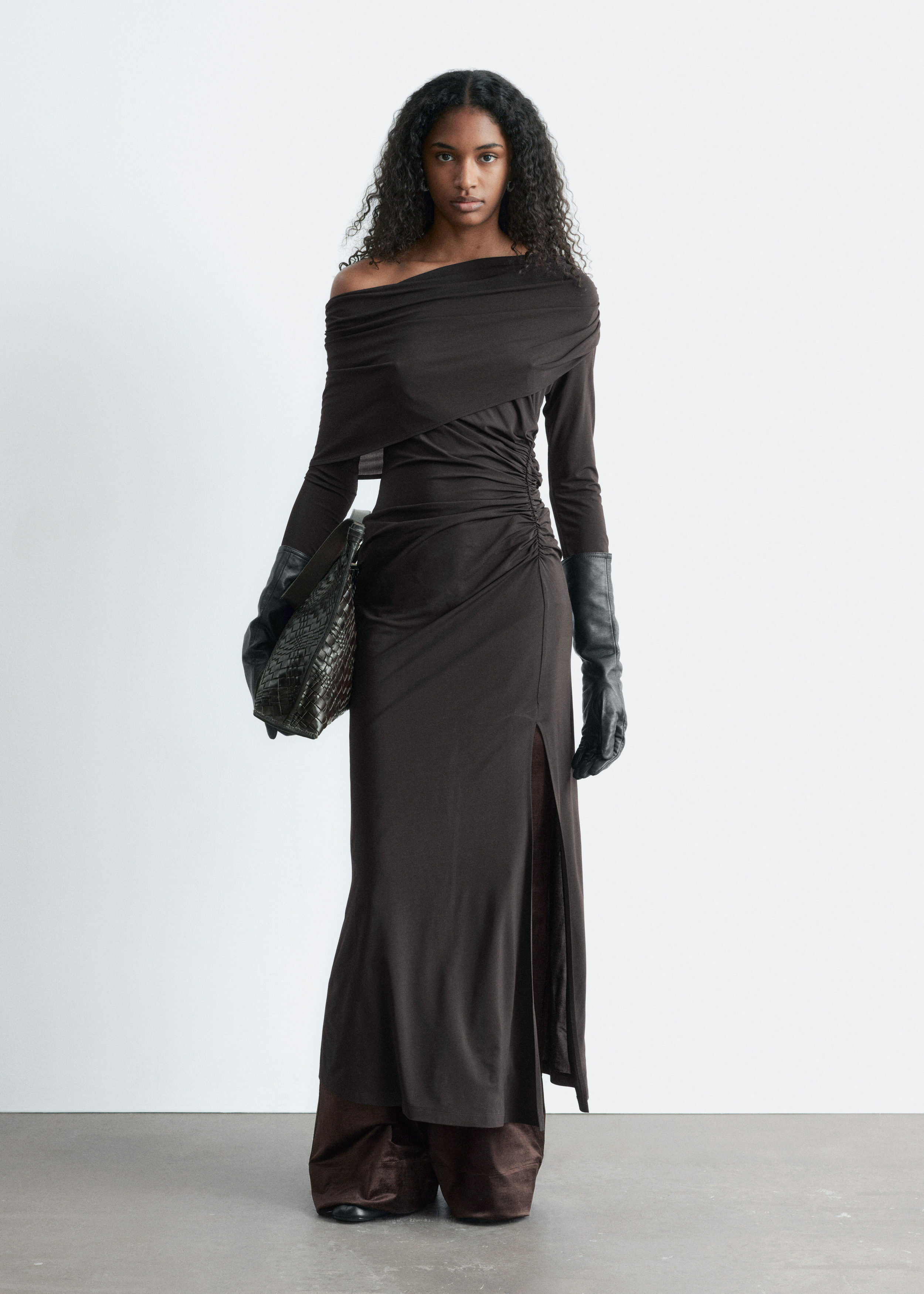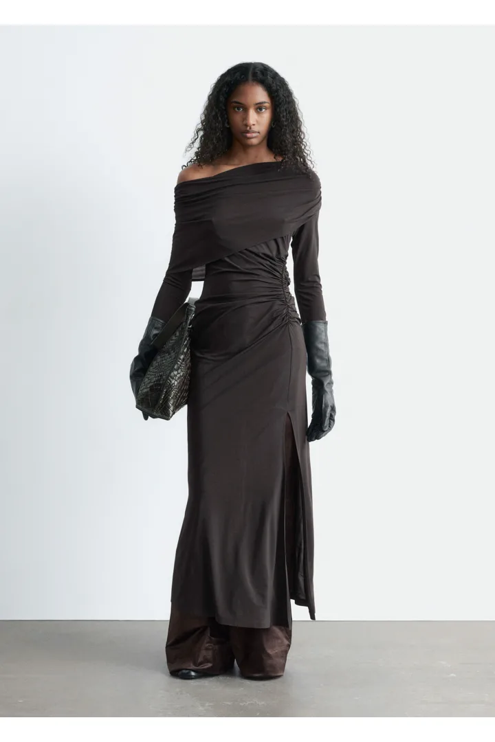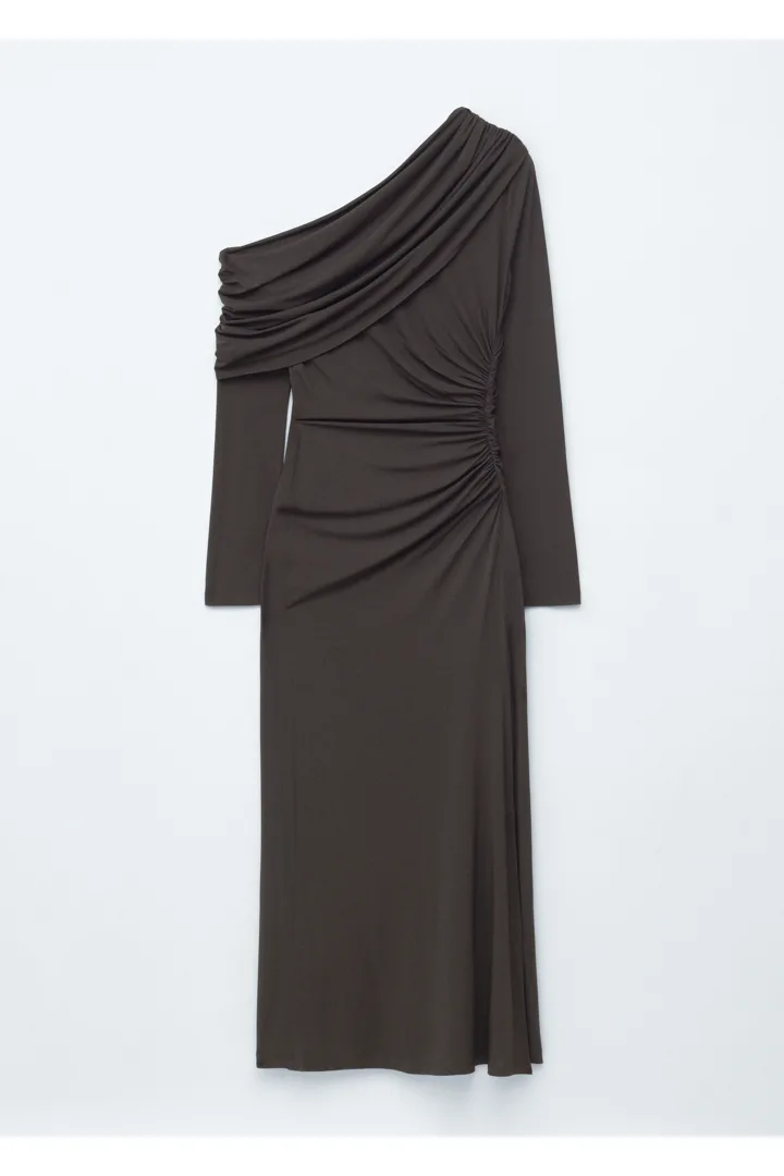 부드럽고 신축성 좋은 저지 소재로 탄생한 미디 드레스예요. 드레이프지는 폴드 오버 네크라인은 비대칭적인 룩으로 원 숄더 실루엣을 연출한답니다. 롱 슬리브, 웨이스트 한쪽의 셔링 디테일, 그리고 헴라인의 깊은 슬릿이 특징이에요.