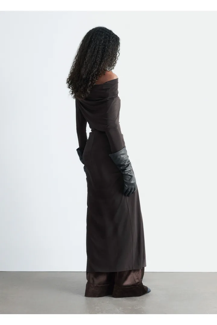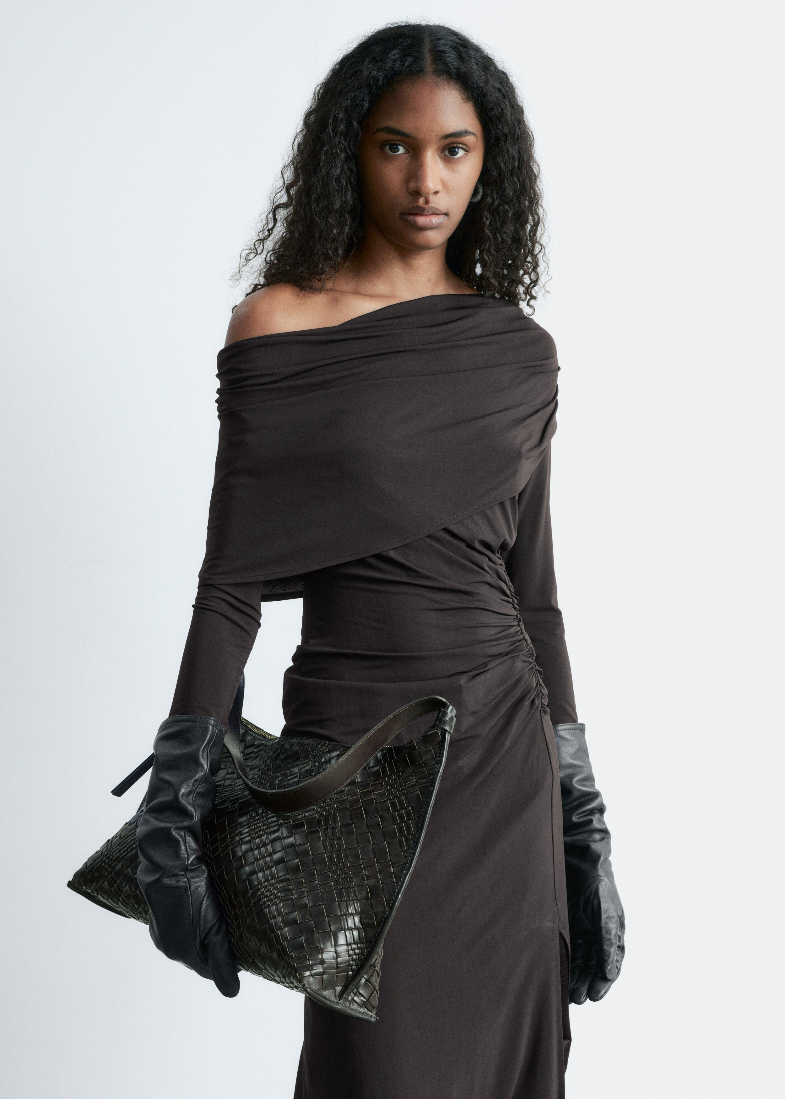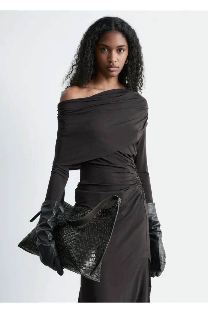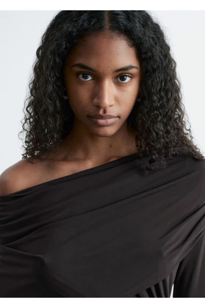 부드럽고 신축성 좋은 저지 소재로 탄생한 미디 드레스예요. 드레이프지는 폴드 오버 네크라인은 비대칭적인 룩으로 원 숄더 실루엣을 연출한답니다. 롱 슬리브, 웨이스트 한쪽의 셔링 디테일, 그리고 헴라인의 깊은 슬릿이 특징이에요.