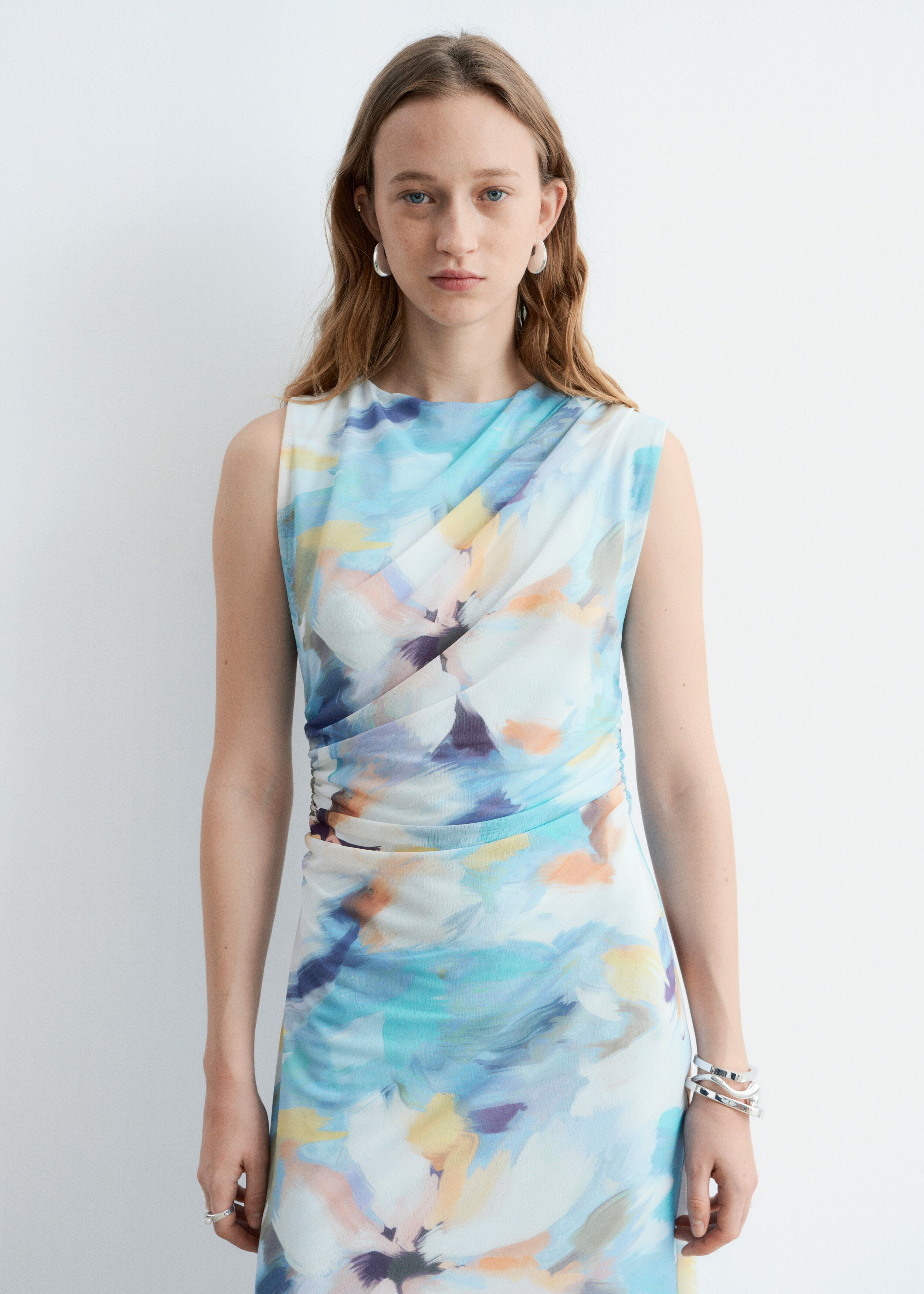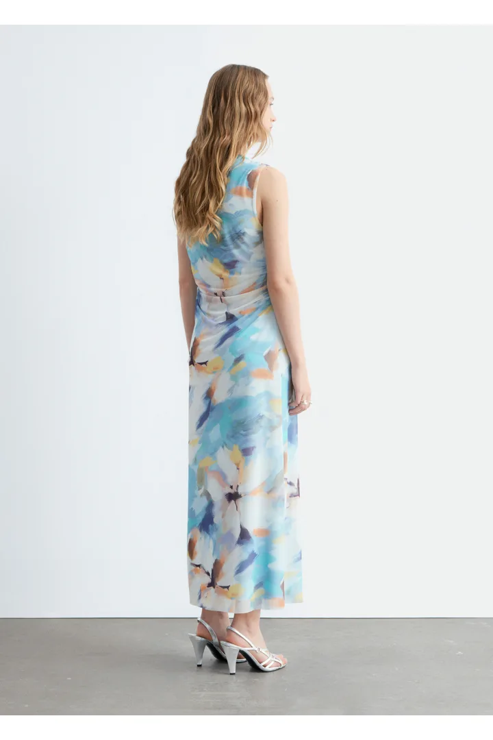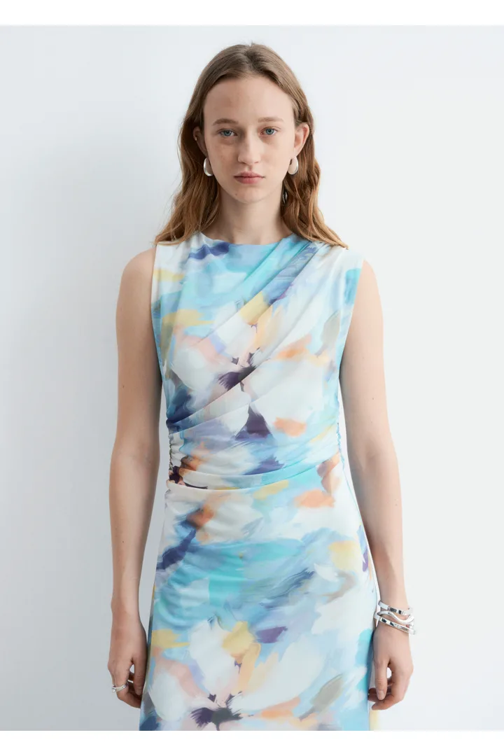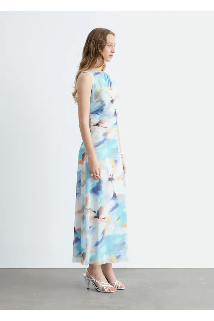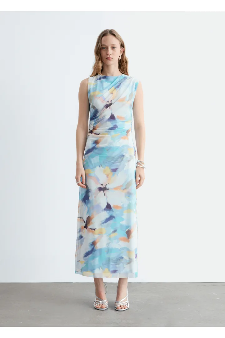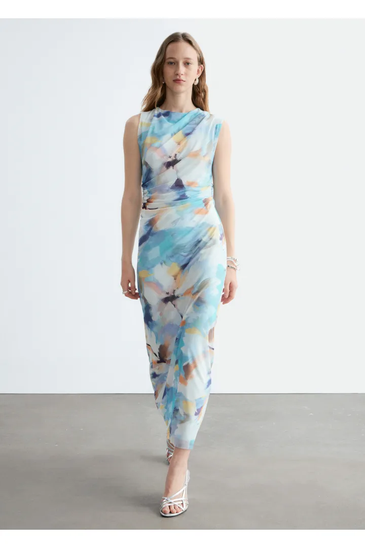 슬리브리스 룩의 미디 드레스예요. 보트 넥, 핏 되는 실루엣, 드레이프 디테일이 멋스럽답니다.