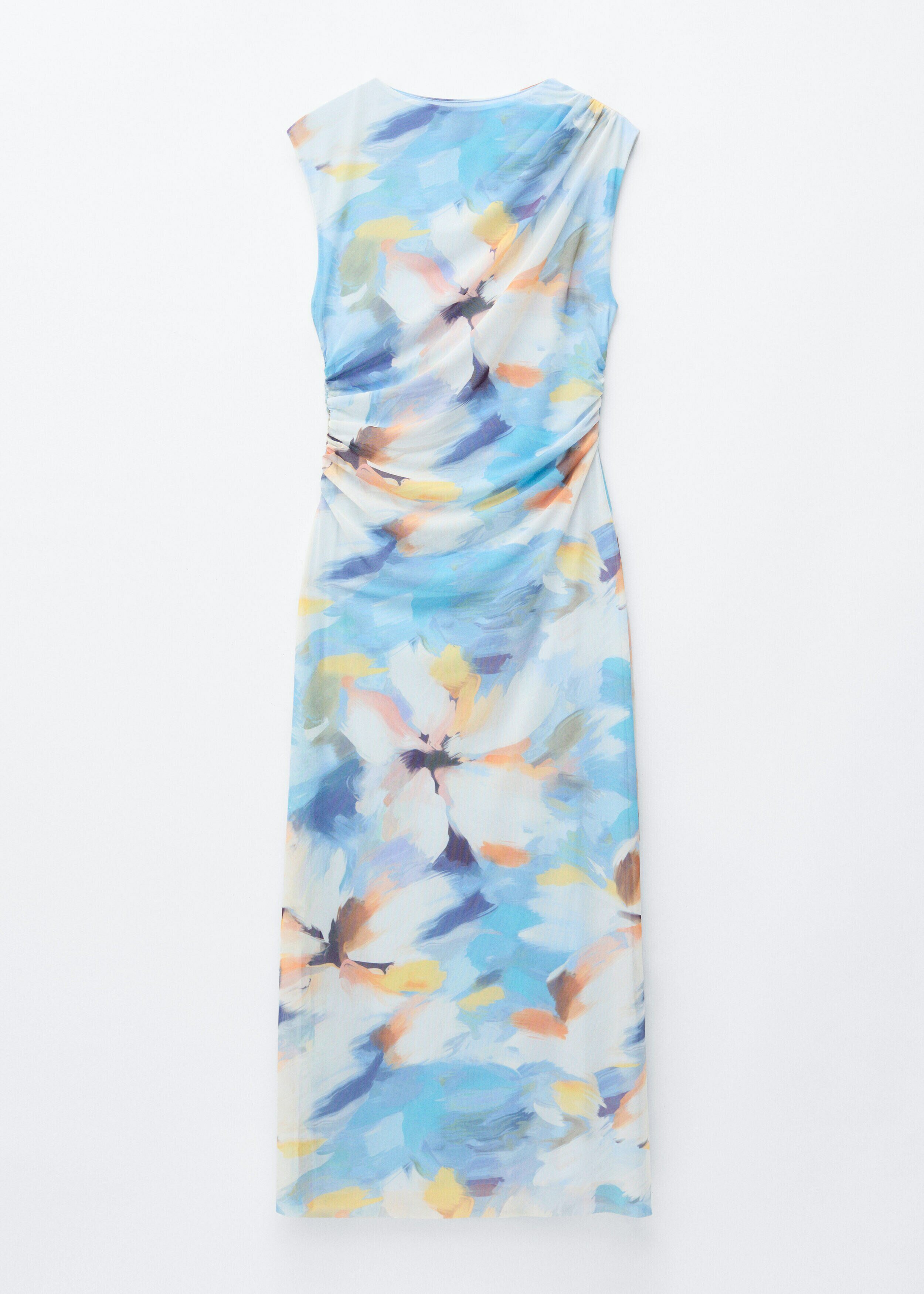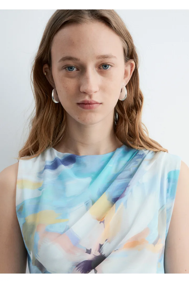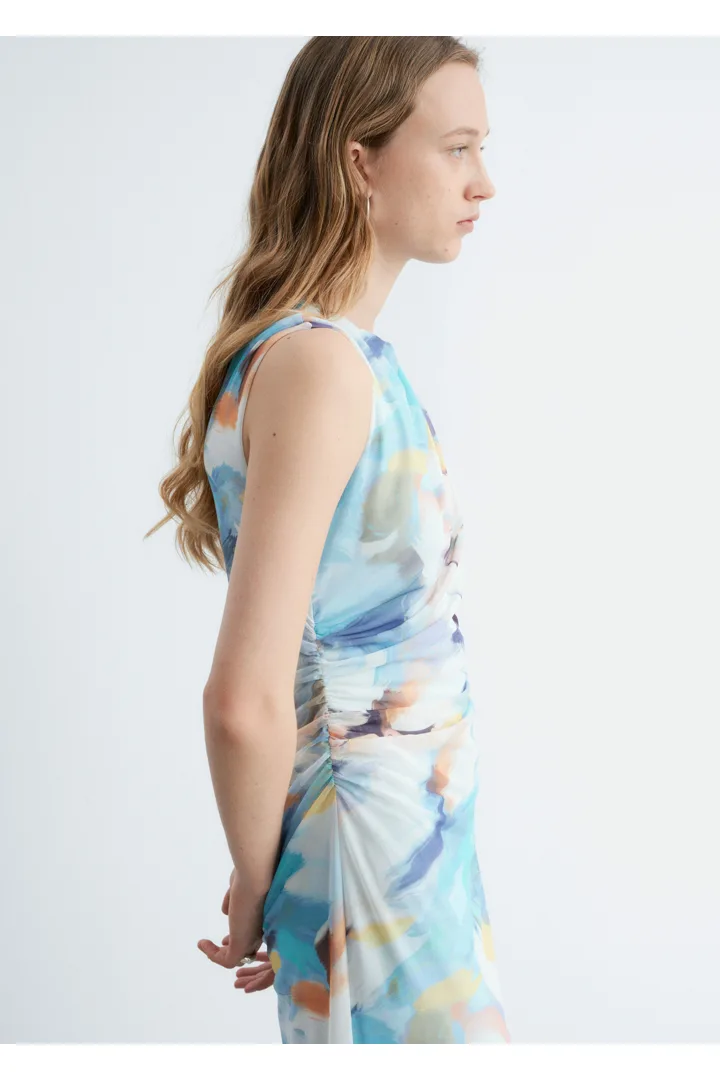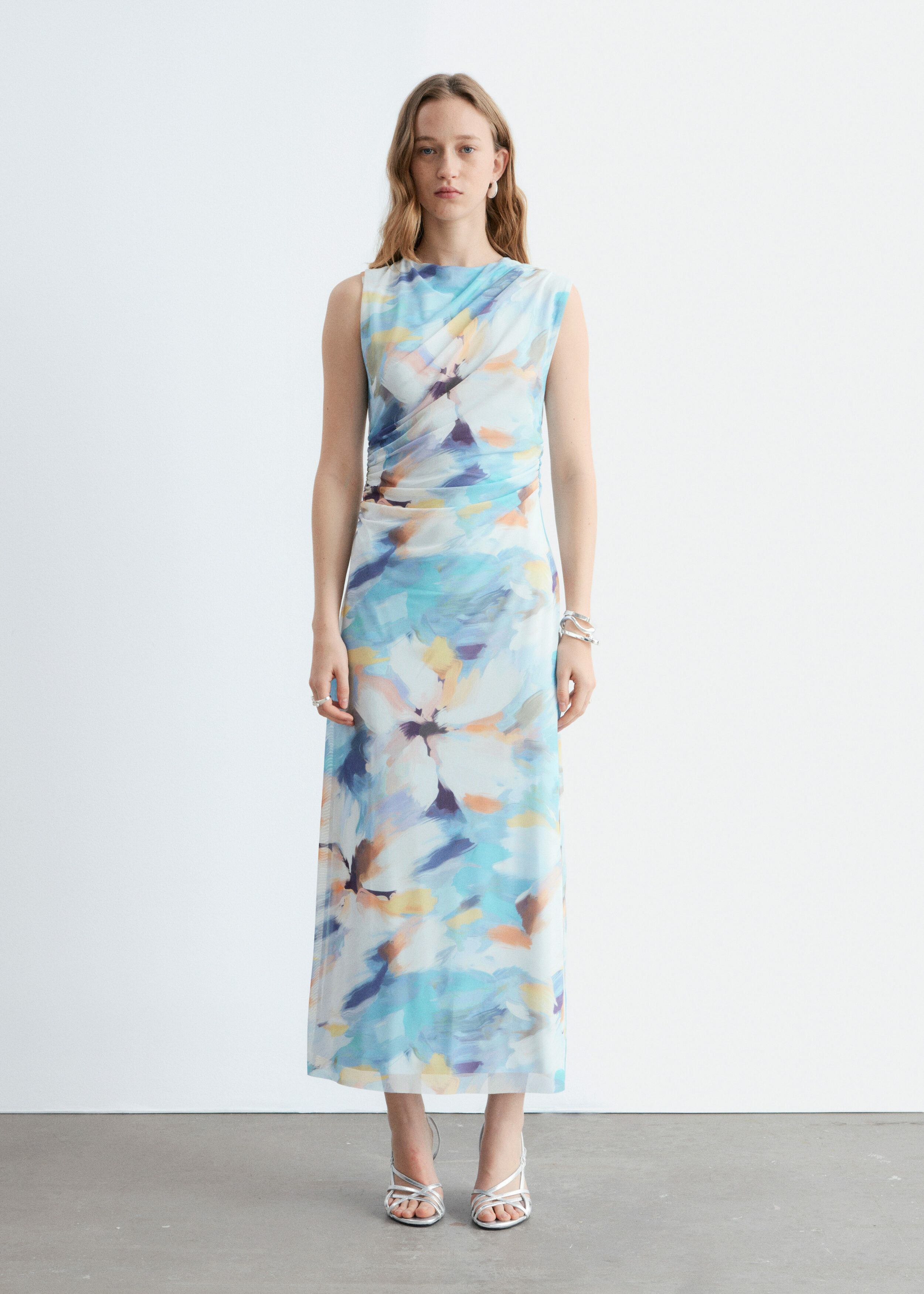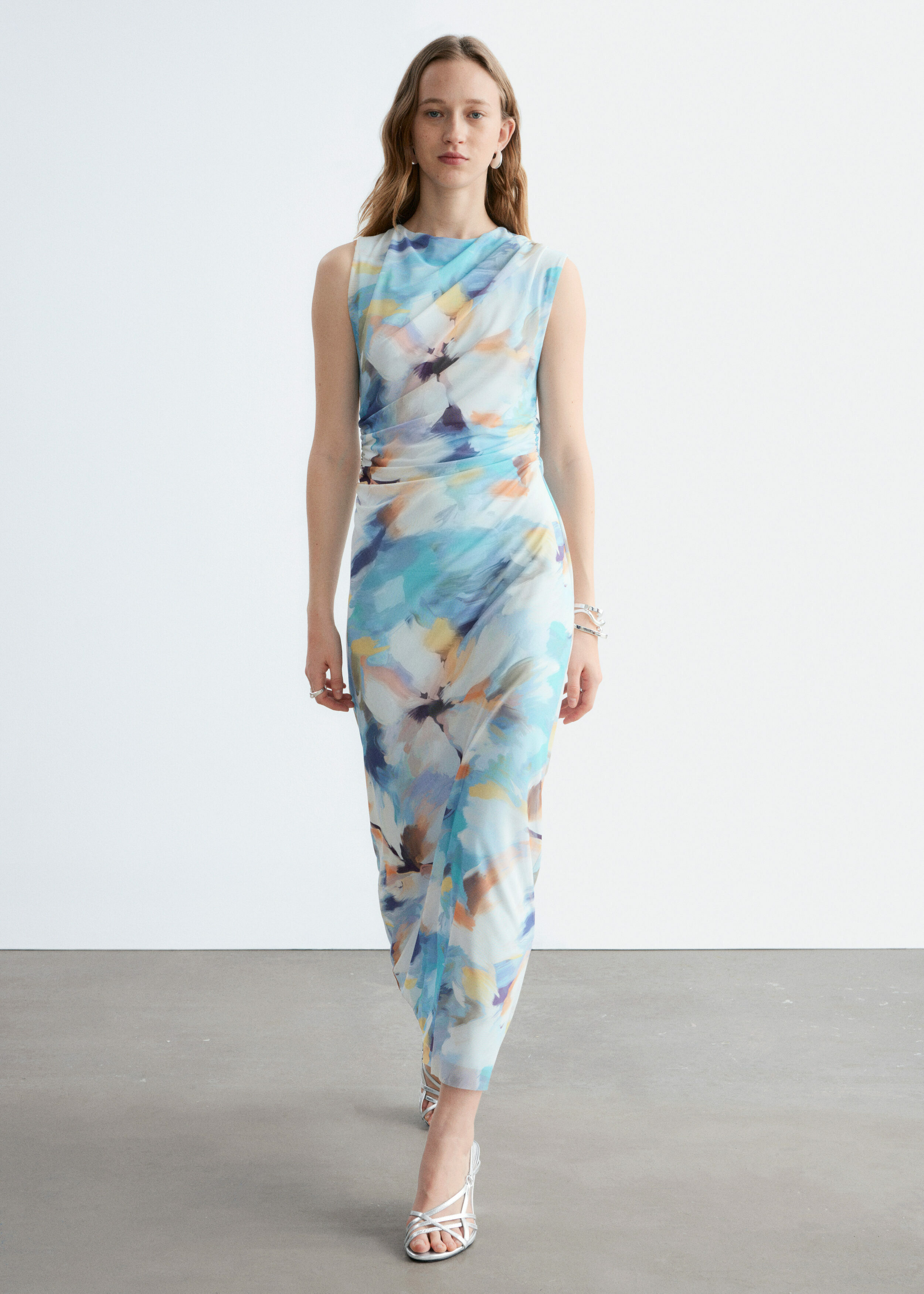 슬리브리스 룩의 미디 드레스예요. 보트 넥, 핏 되는 실루엣, 드레이프 디테일이 멋스럽답니다.