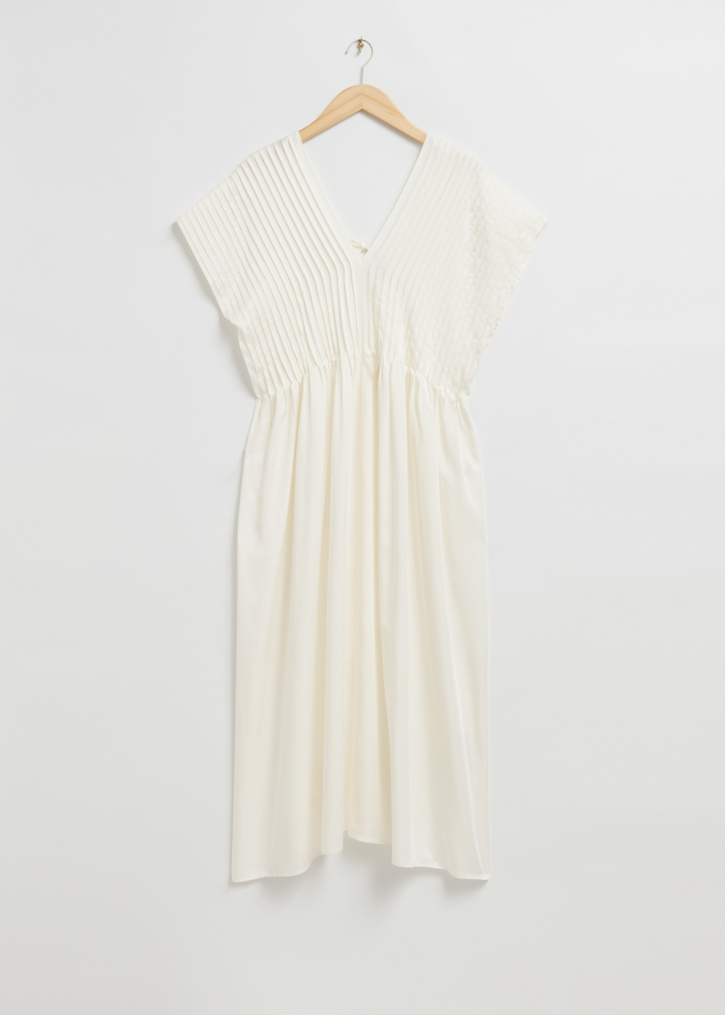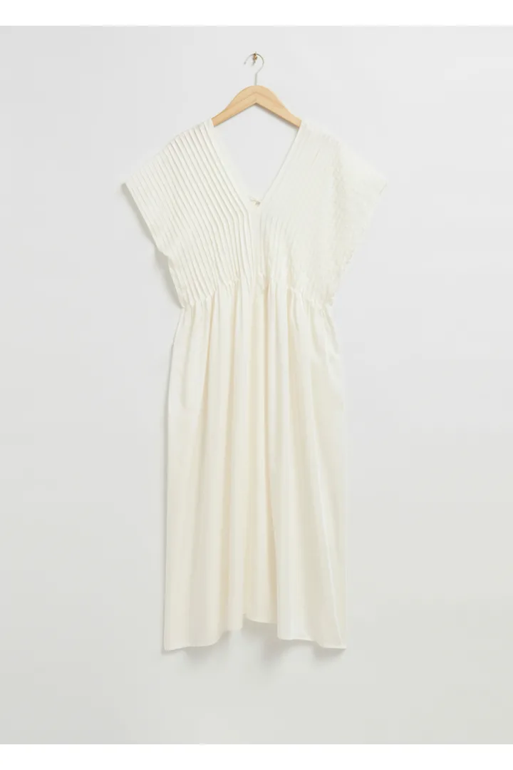 플리츠 디테일이 매력적인 미디 드레스예요. V 네크라인, 쇼트 슬리브, 뒷면의 슬림한 타이가 특징이랍니다.